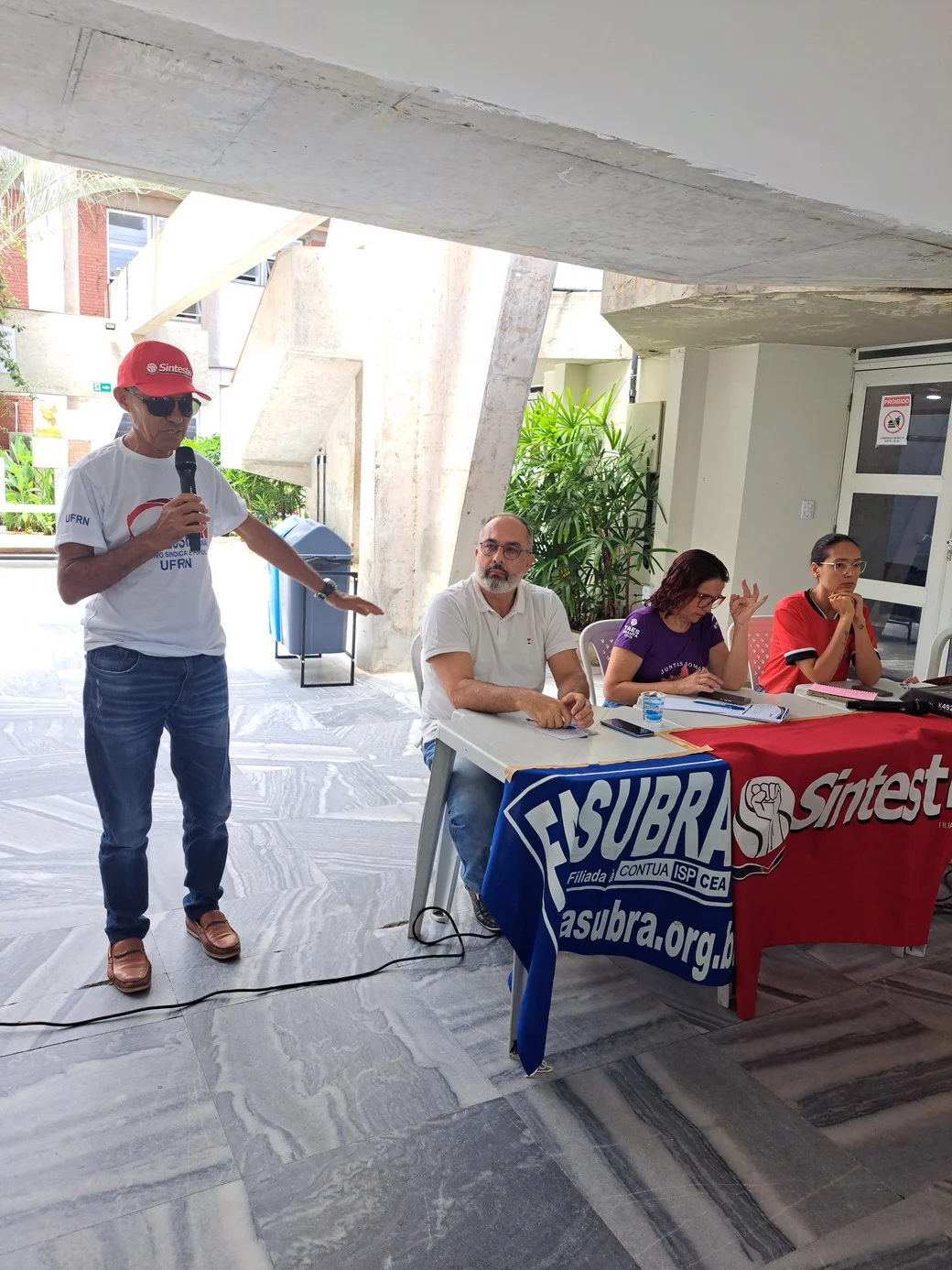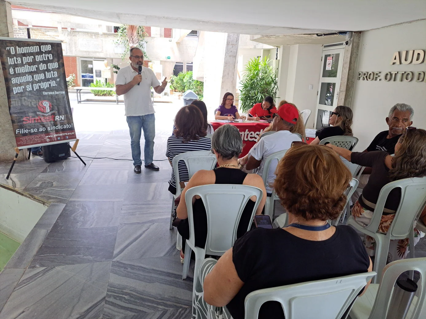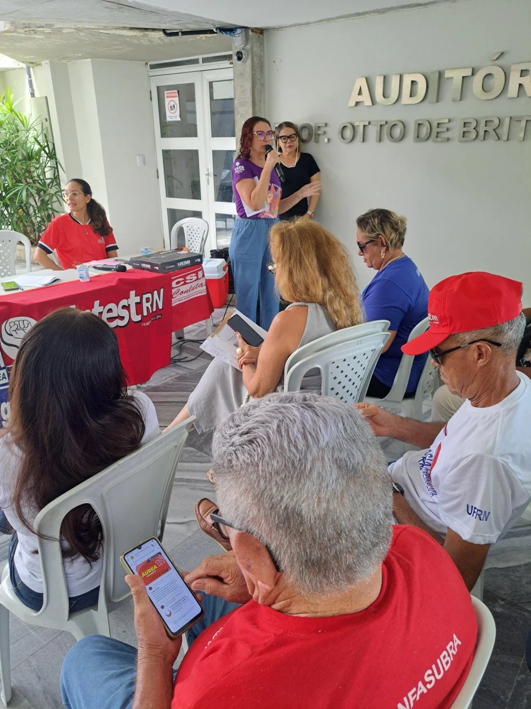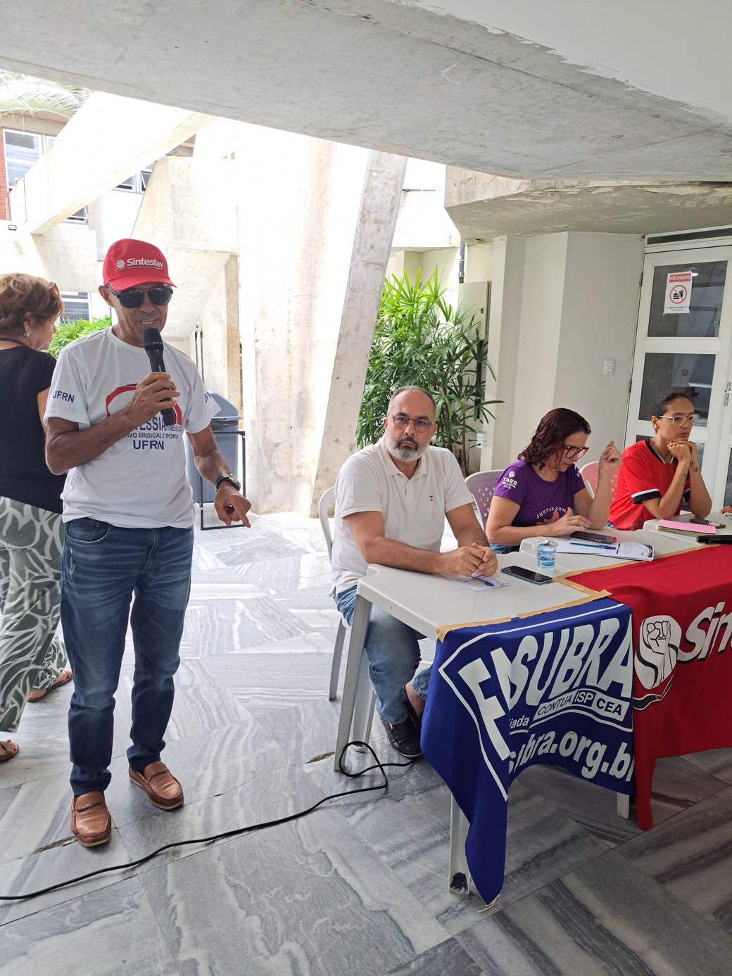 O SINTEST-RN realizou, em 26 de novembro, no hall da Reitoria, uma assembleia decisiva para ajustar o calendário de lutas e definir os encaminhamentos da paralisação convocada pela FASUBRA. A mesa foi composta por Celita Pessoa, Coordenadora Geral, Érika Galvão, Coordenadora de Administração e Patrimônio, e Wellington Soares, Coordenador jurídico.
