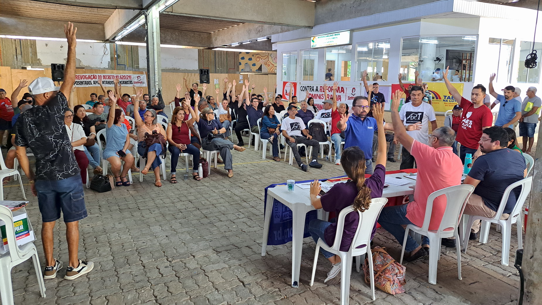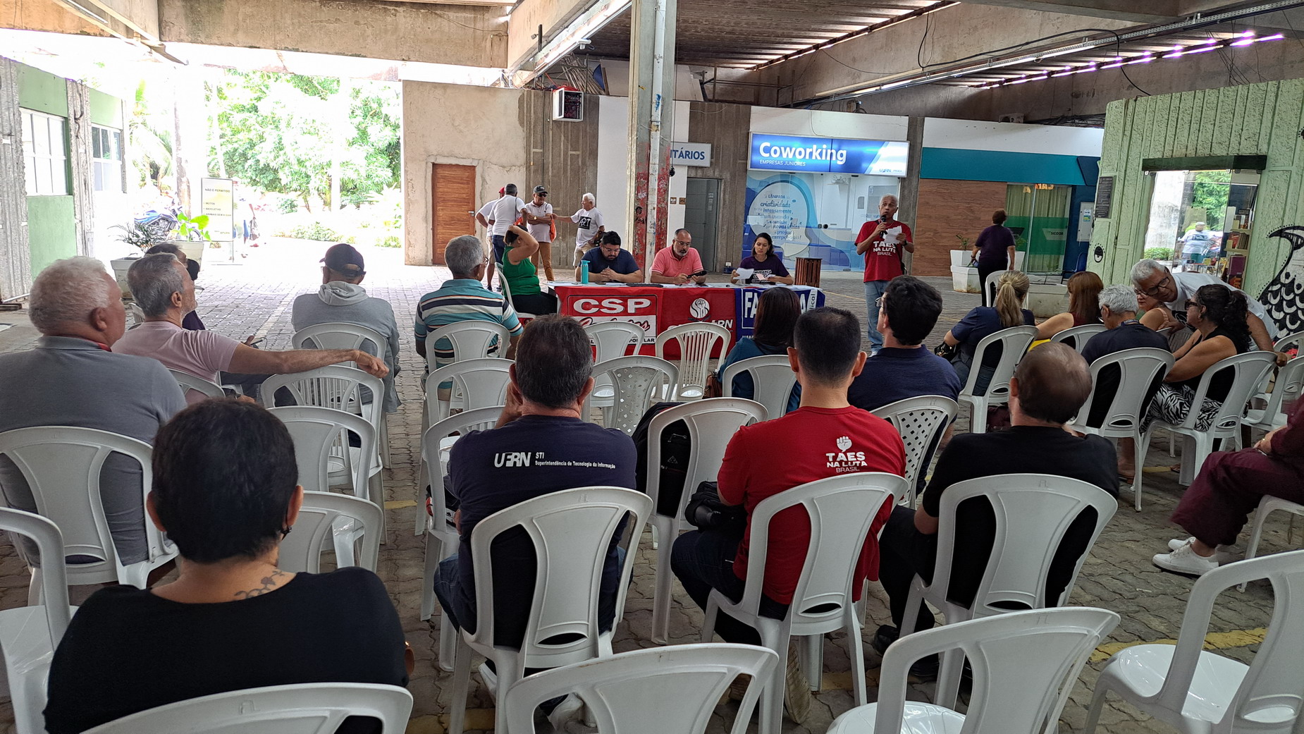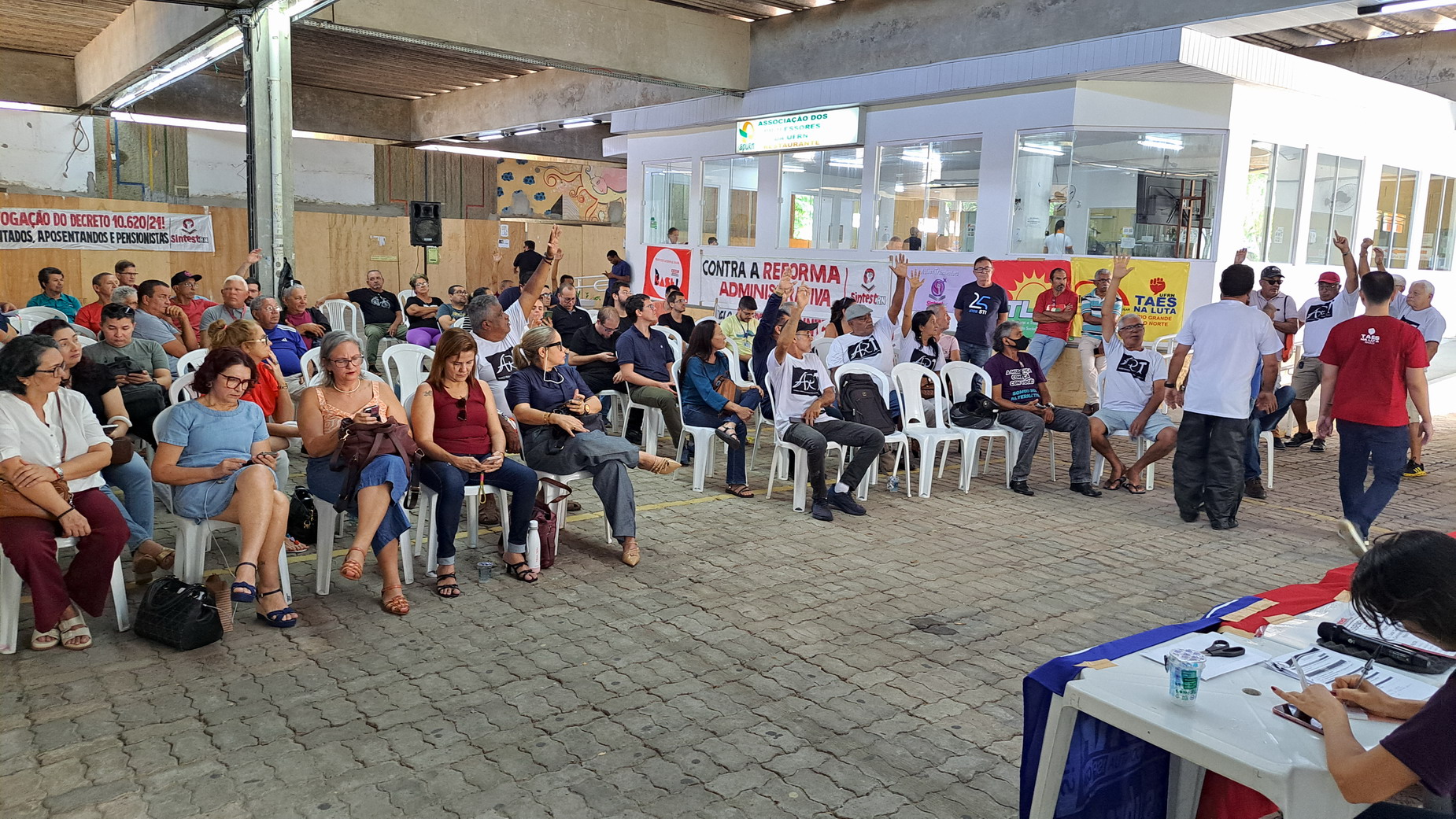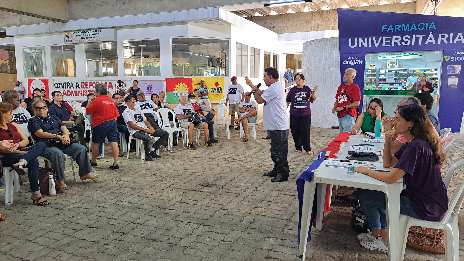 Na manhã desta quarta-feira, 06 de agosto, servidoras e servidores técnico-administrativos da UFRN participaram de mais uma Assembleia Geral convocada pelo SINTEST-RN, realizada no Centro de Convivência da universidade. A atividade foi marcada por uma série de debates sobre a conjuntura política nacional, defesa dos serviços públicos e dos direitos sociais, além da eleição de delegados para a Plenária da FASUBRA.