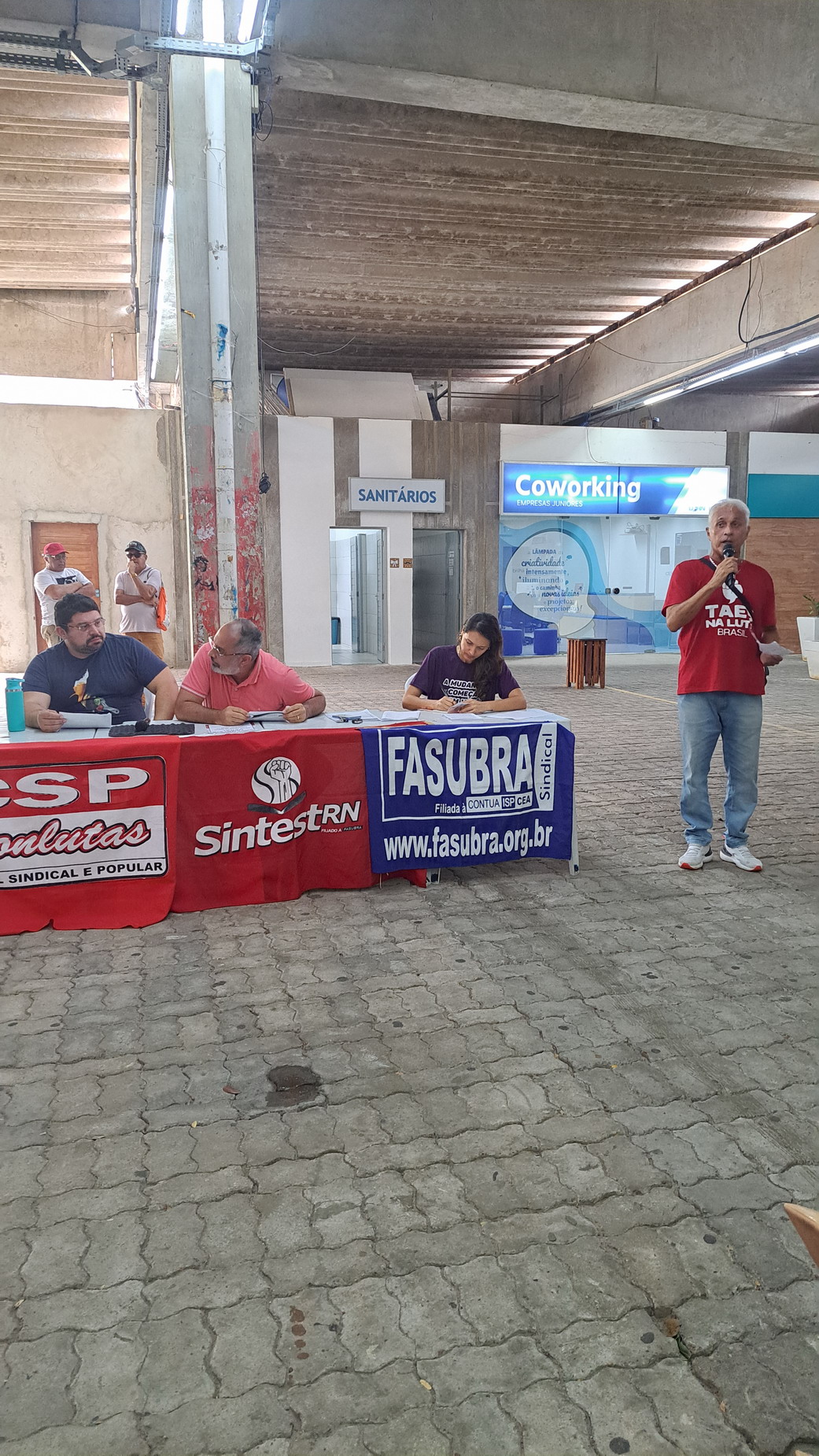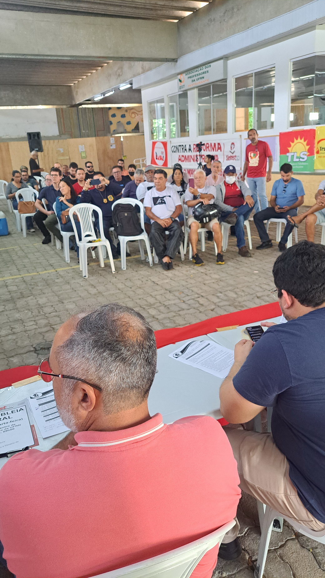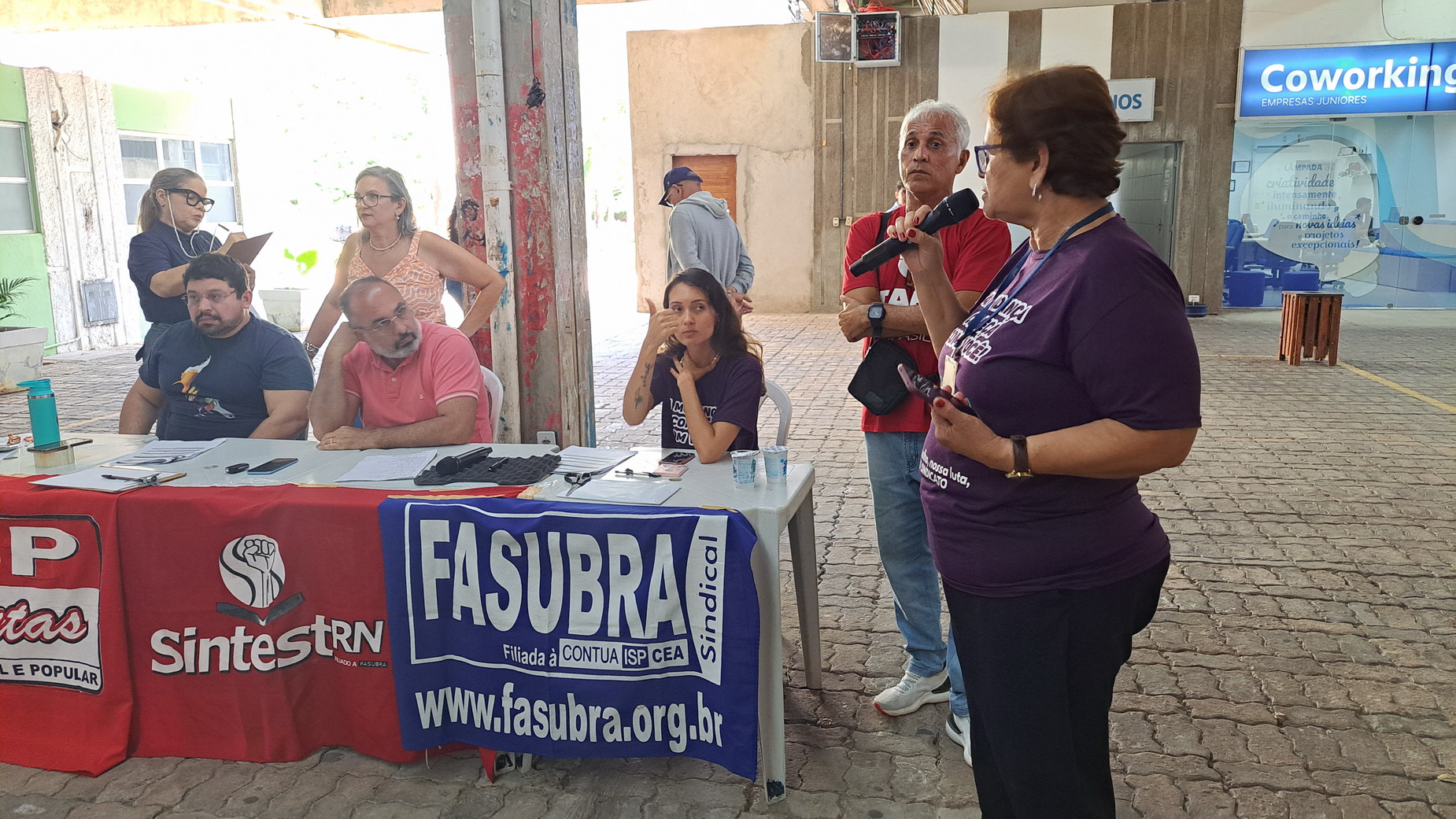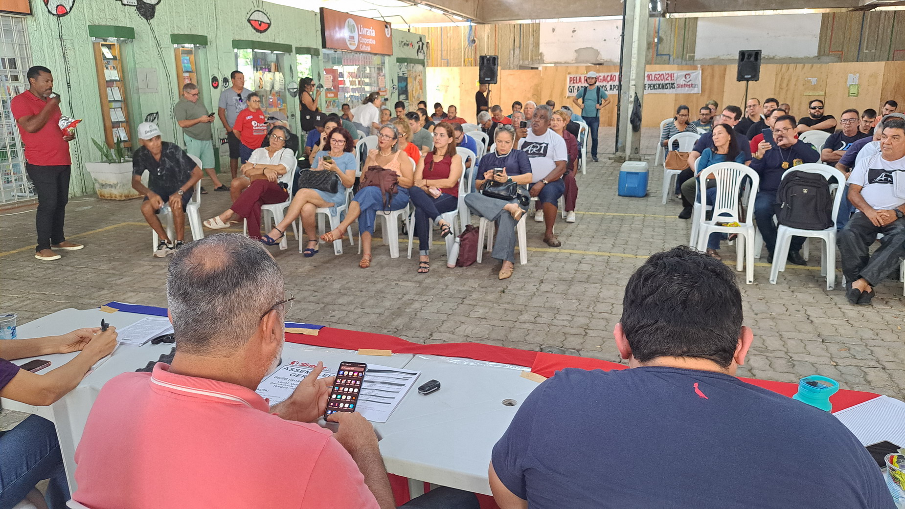 Na manhã desta quarta-feira, 06 de agosto, servidoras e servidores técnico-administrativos da UFRN participaram de mais uma Assembleia Geral convocada pelo SINTEST-RN, realizada no Centro de Convivência da universidade. A atividade foi marcada por uma série de debates sobre a conjuntura política nacional, defesa dos serviços públicos e dos direitos sociais, além da eleição de delegados para a Plenária da FASUBRA.