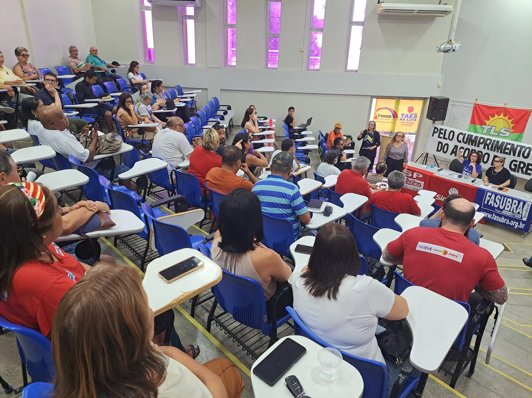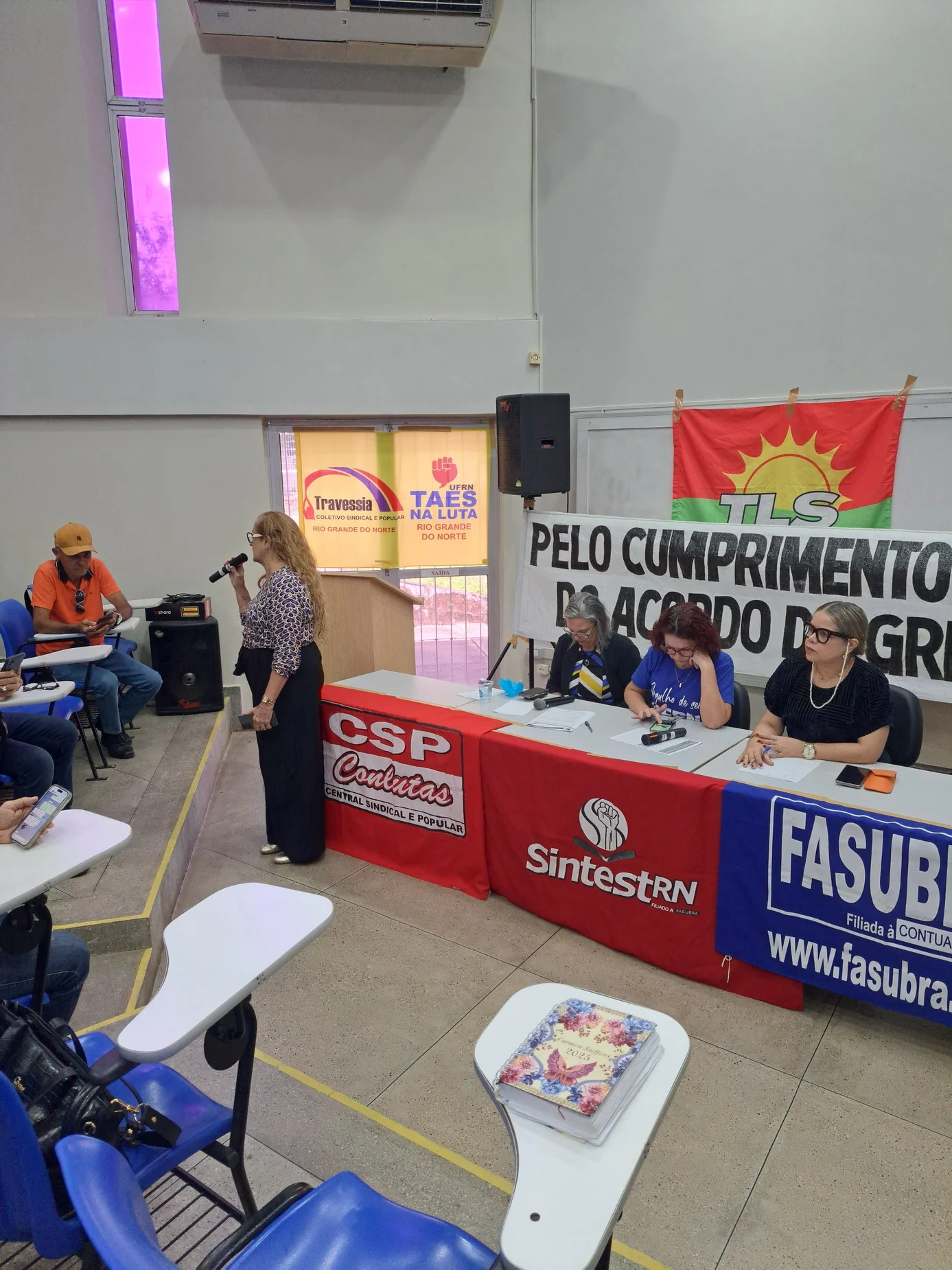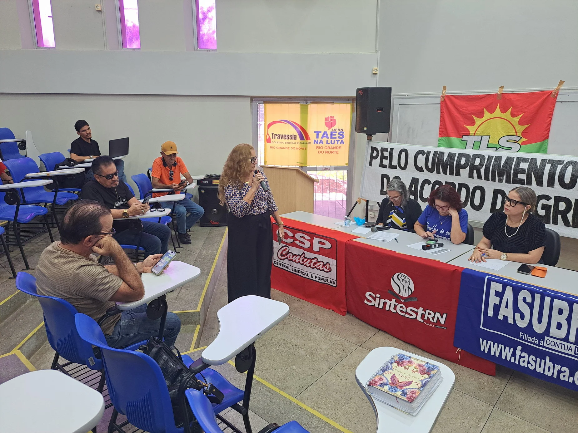 Outros informes abordaram temas como a luta pelo fim da violência contra as mulheres, haja vista os casos recentes de feminicídio no Rio Grande do Norte, e a denúncia do genocídio em curso na Palestina com um convite à categoria para participar do ato “Palestina Livre” no dia 13 de setembro, às 14h30, em frente ao Midway Mall.