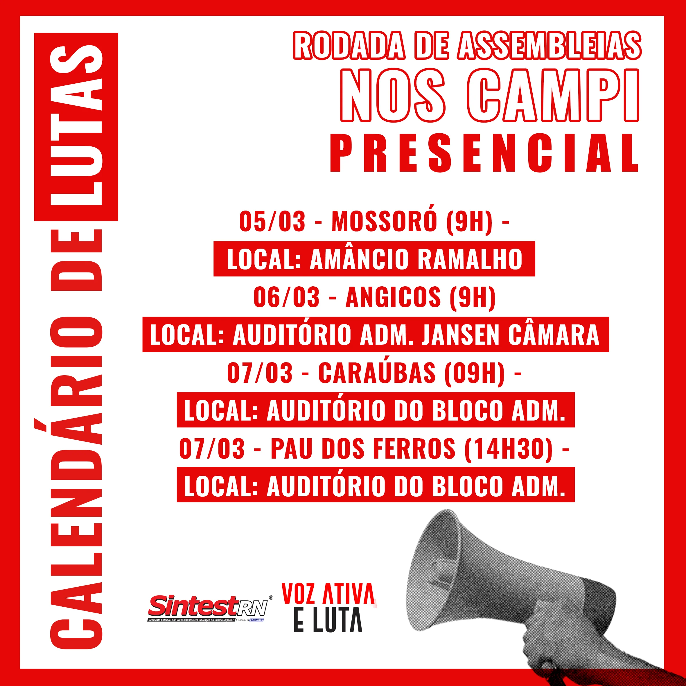 Sindicato dos Estadual dos Trabalhadores em Educação no Ensino Superior – Rua das Angélicas, 225 – Mirassol – Natal – RN CEP: 59078-130 – Cx. postal: 1516 – CEP: 59078-970.