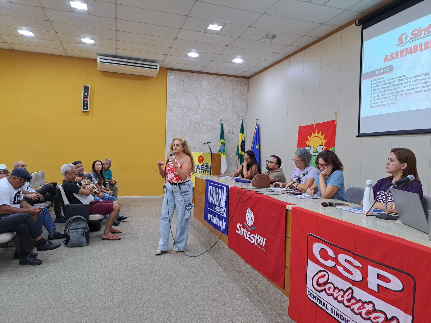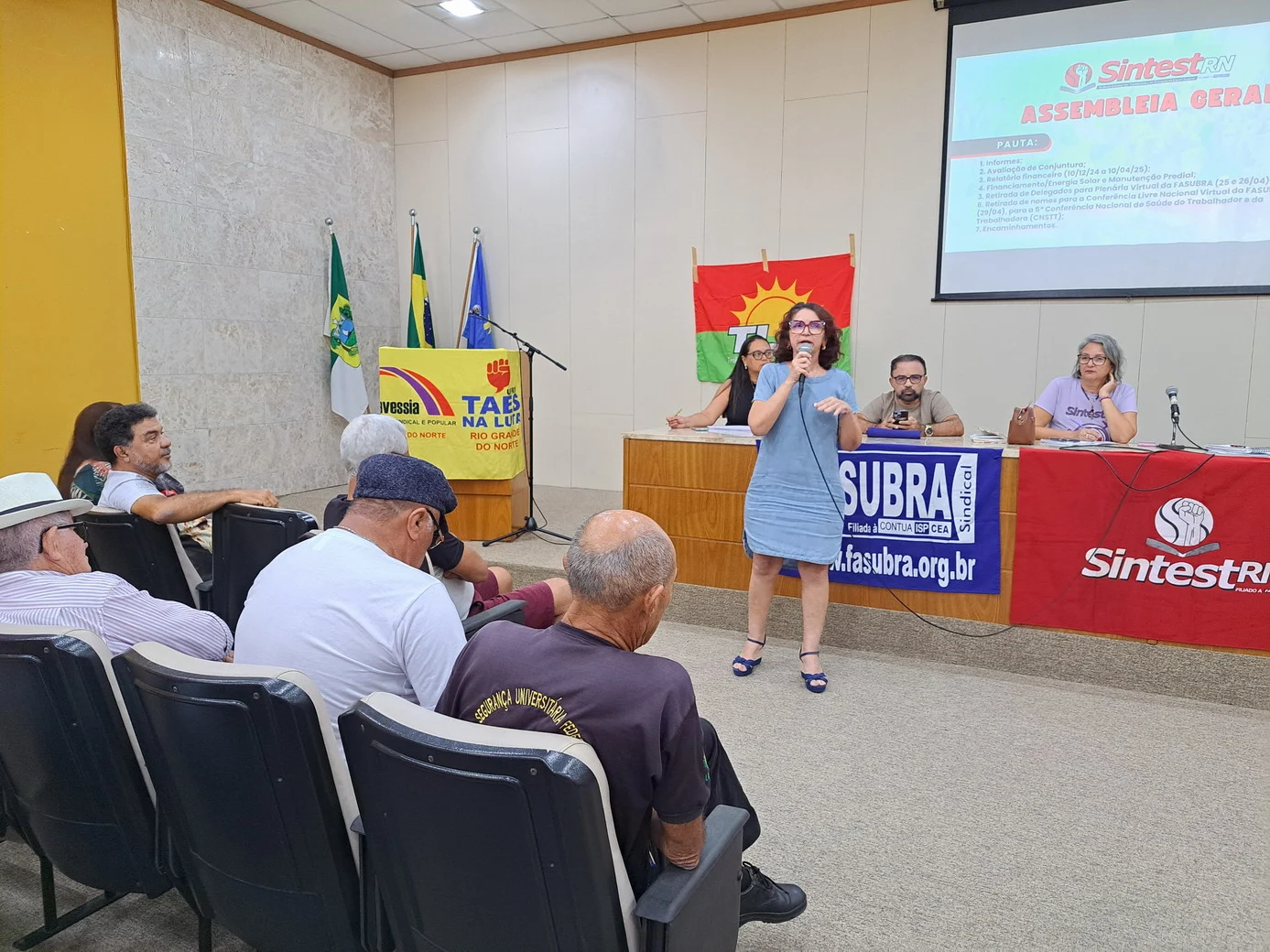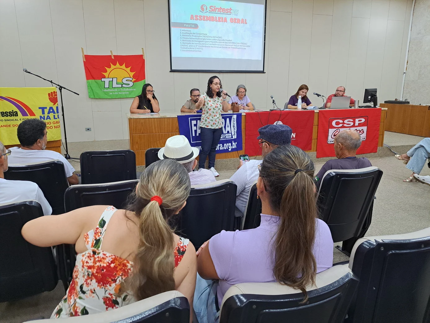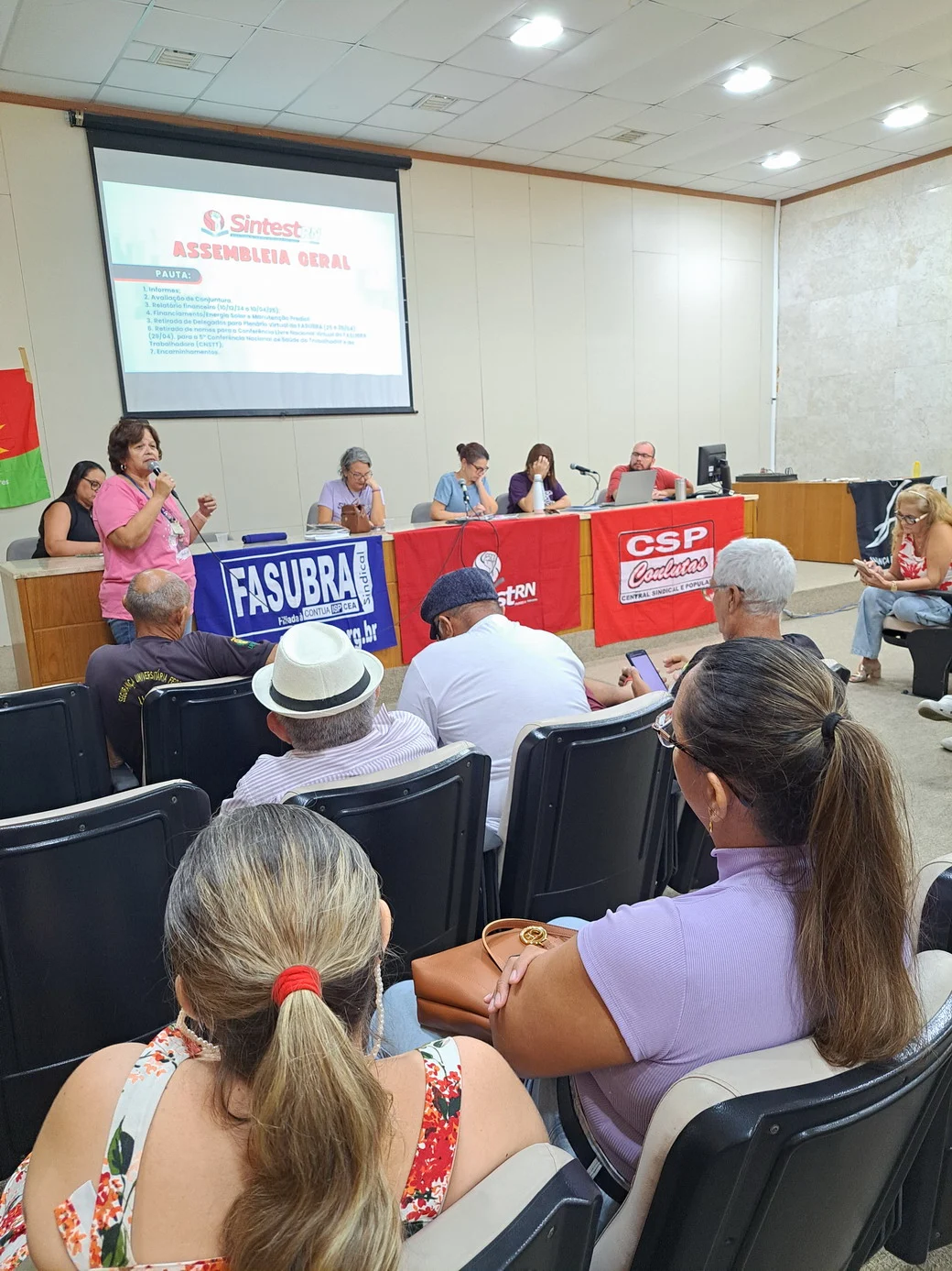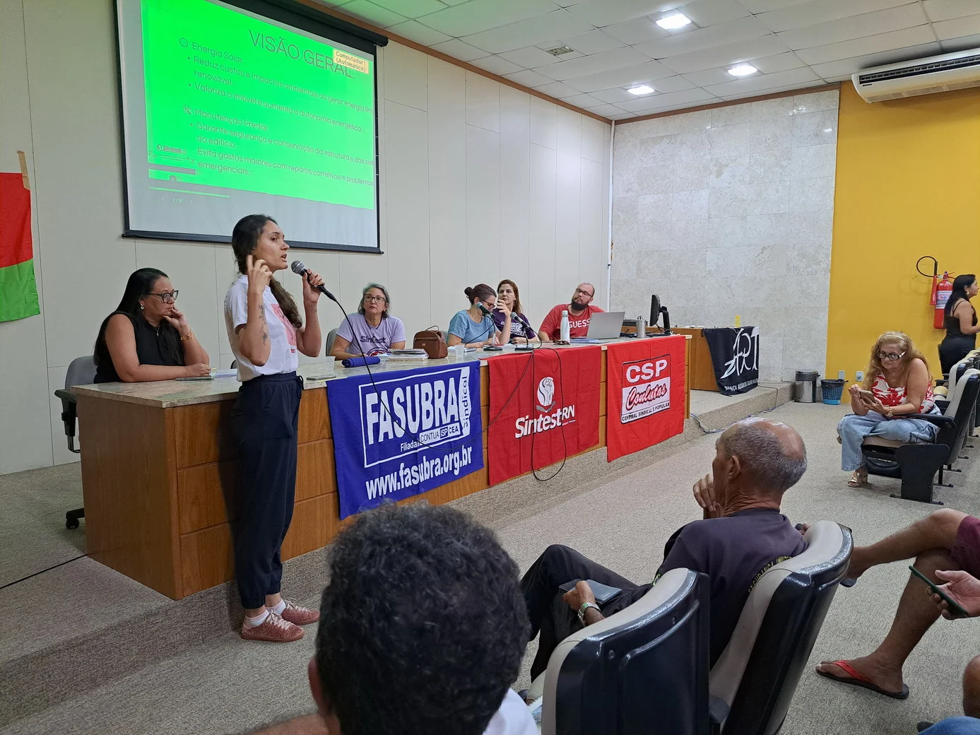 Logo no início, a coordenadora geral, Celita Pessoa, esclareceu o motivo da pauta extensa, informando que alguns pontos exigiam deliberação da categoria, como o financiamento da energia solar e da manutenção do prédio, por envolverem valores significativos.