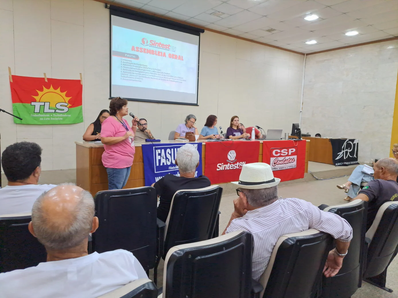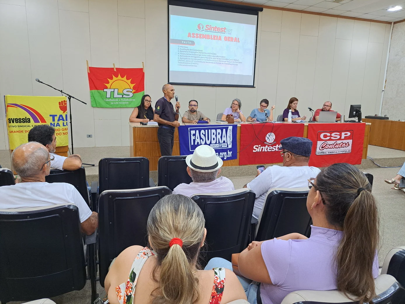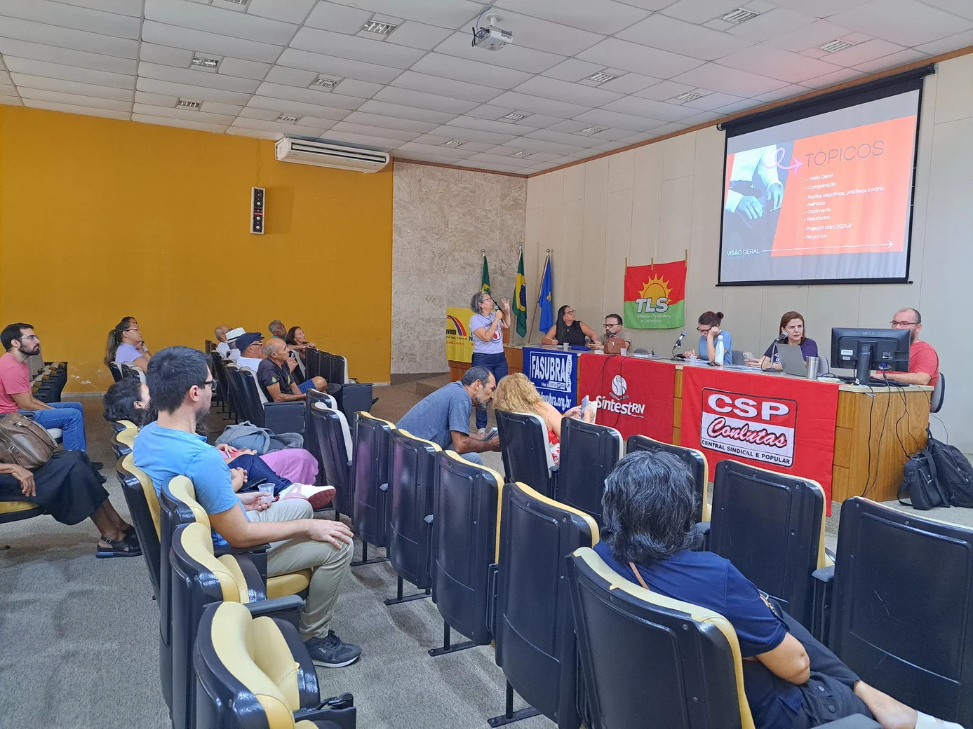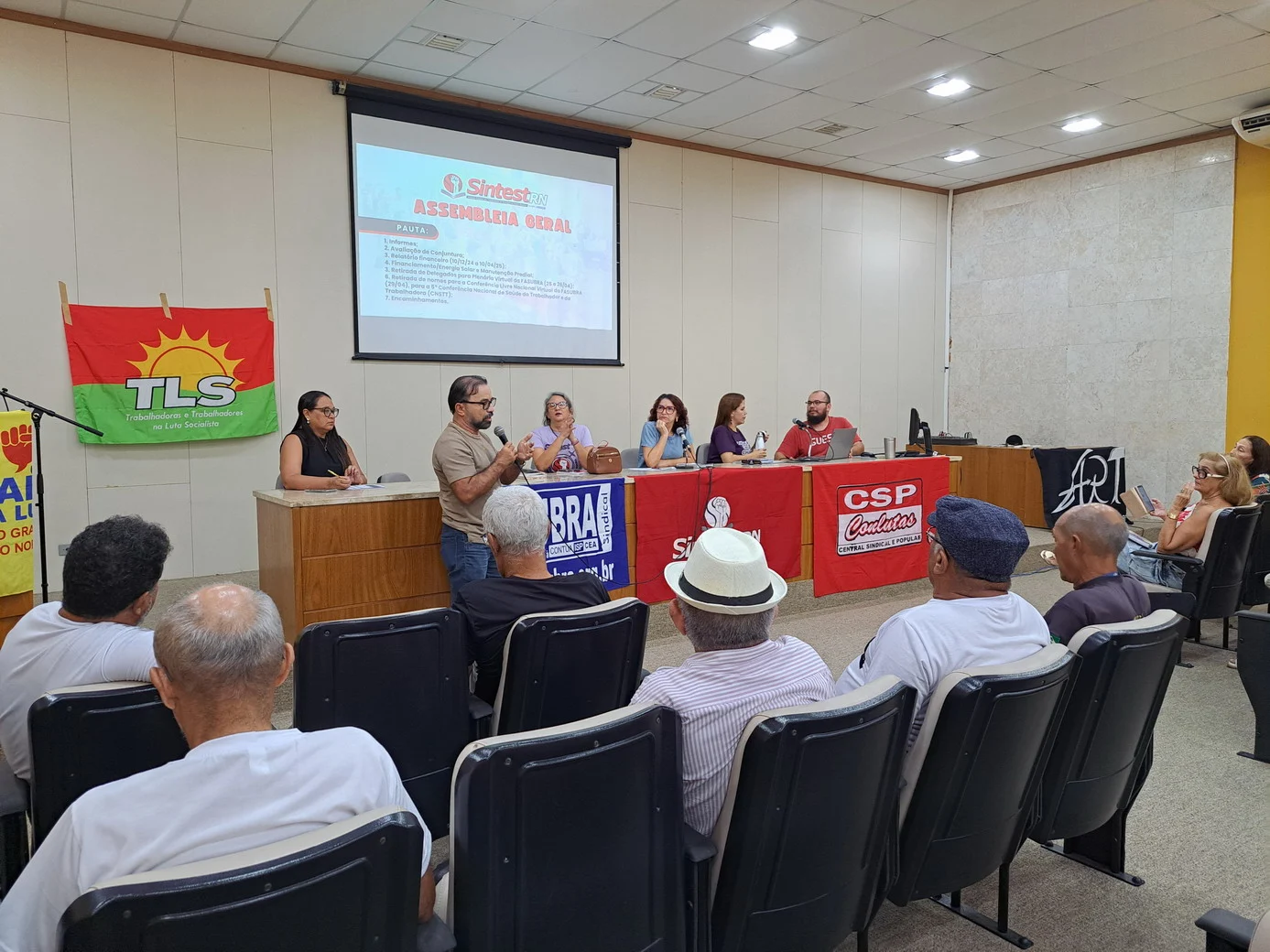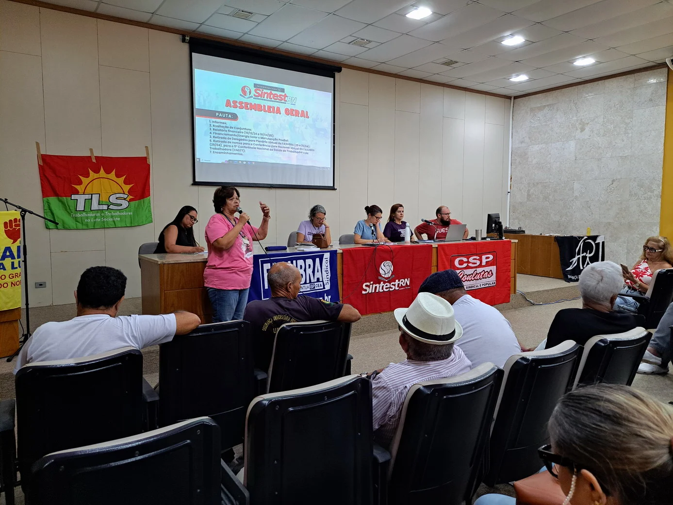 Logo no início, a coordenadora geral, Celita Pessoa, esclareceu o motivo da pauta extensa, informando que alguns pontos exigiam deliberação da categoria, como o financiamento da energia solar e da manutenção do prédio, por envolverem valores significativos.