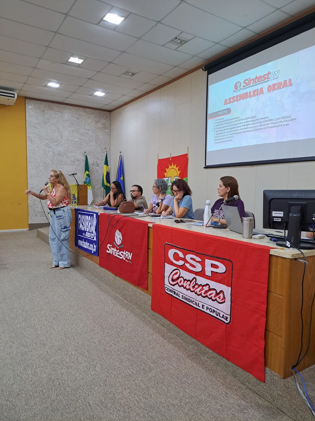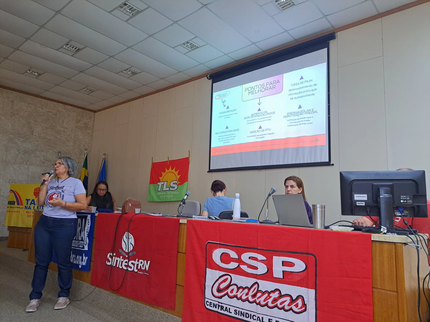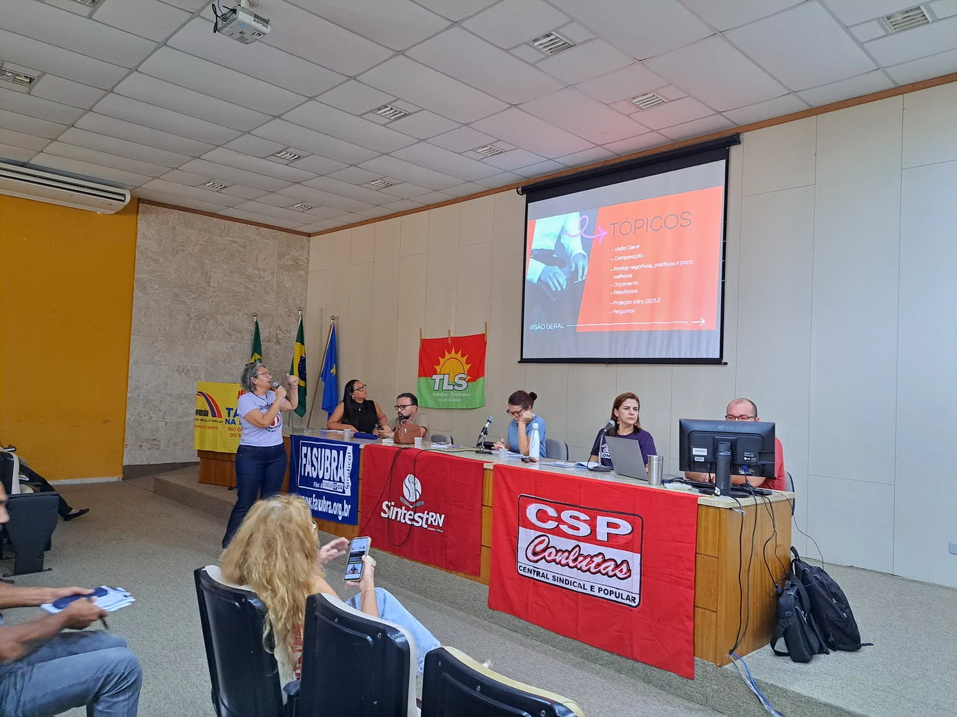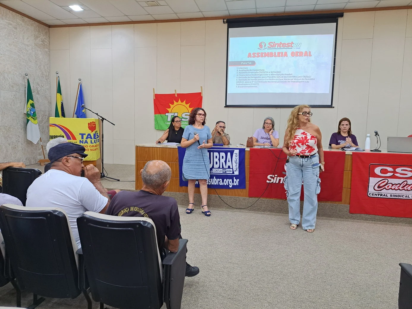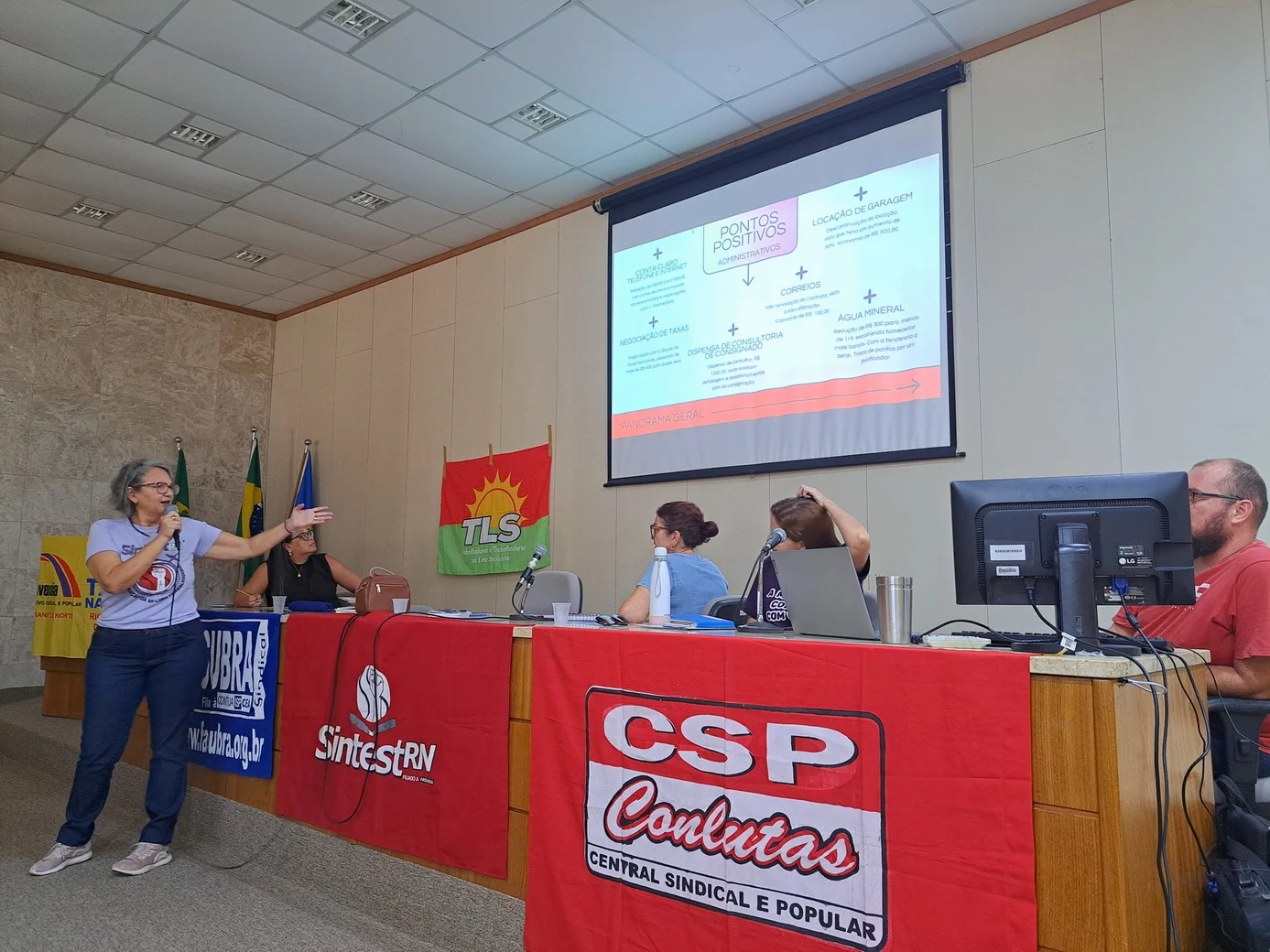 Logo no início, a coordenadora geral, Celita Pessoa, esclareceu o motivo da pauta extensa, informando que alguns pontos exigiam deliberação da categoria, como o financiamento da energia solar e da manutenção do prédio, por envolverem valores significativos.