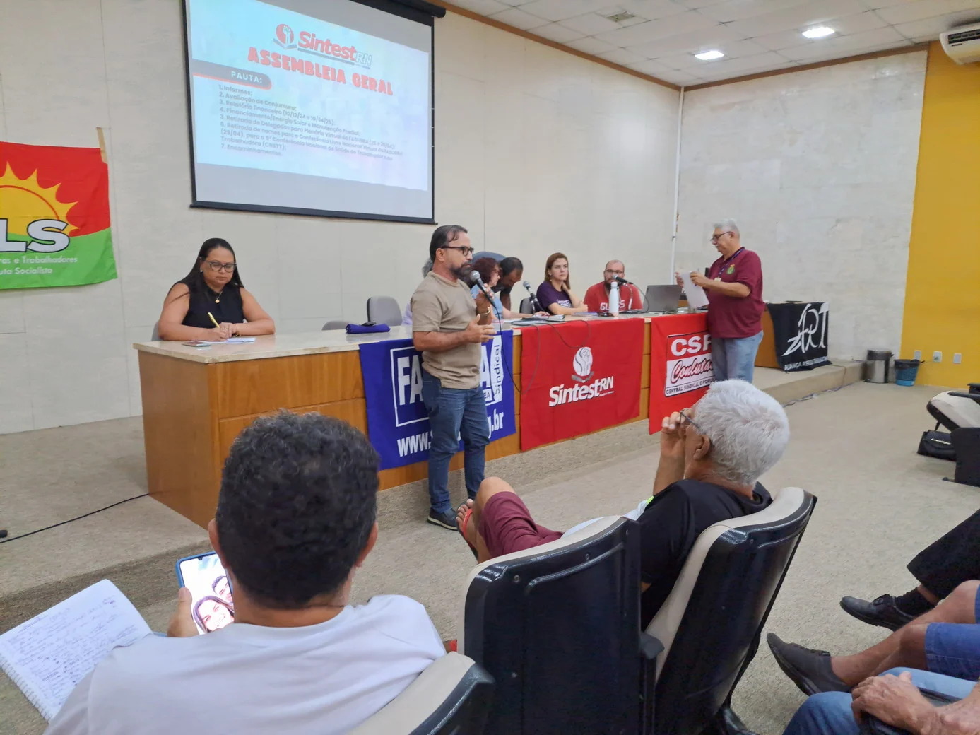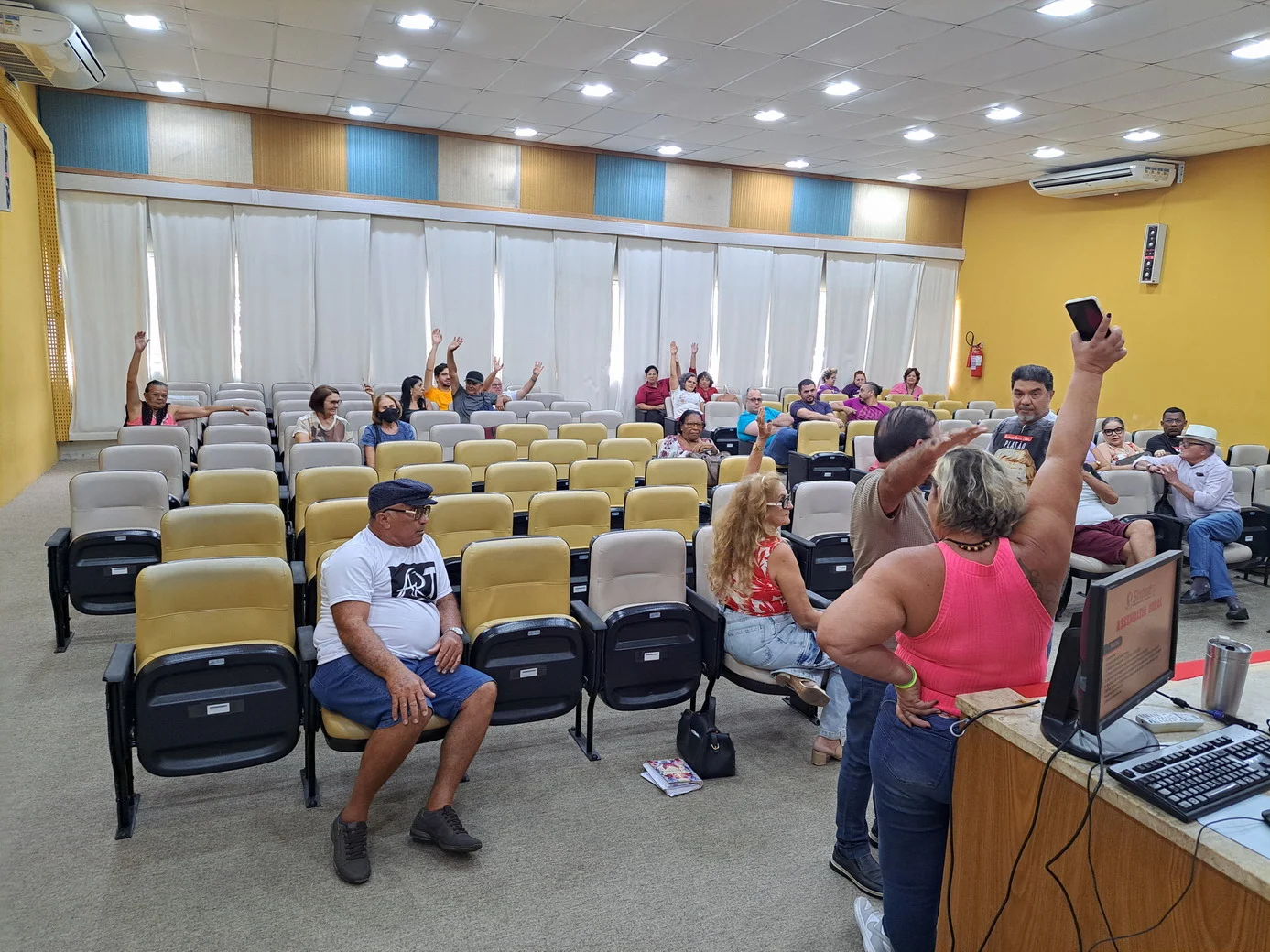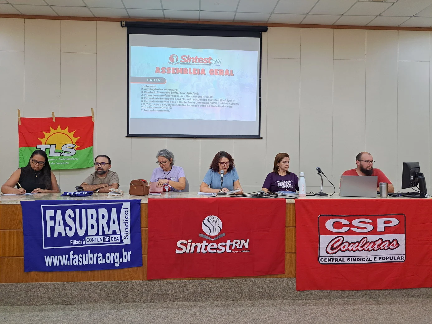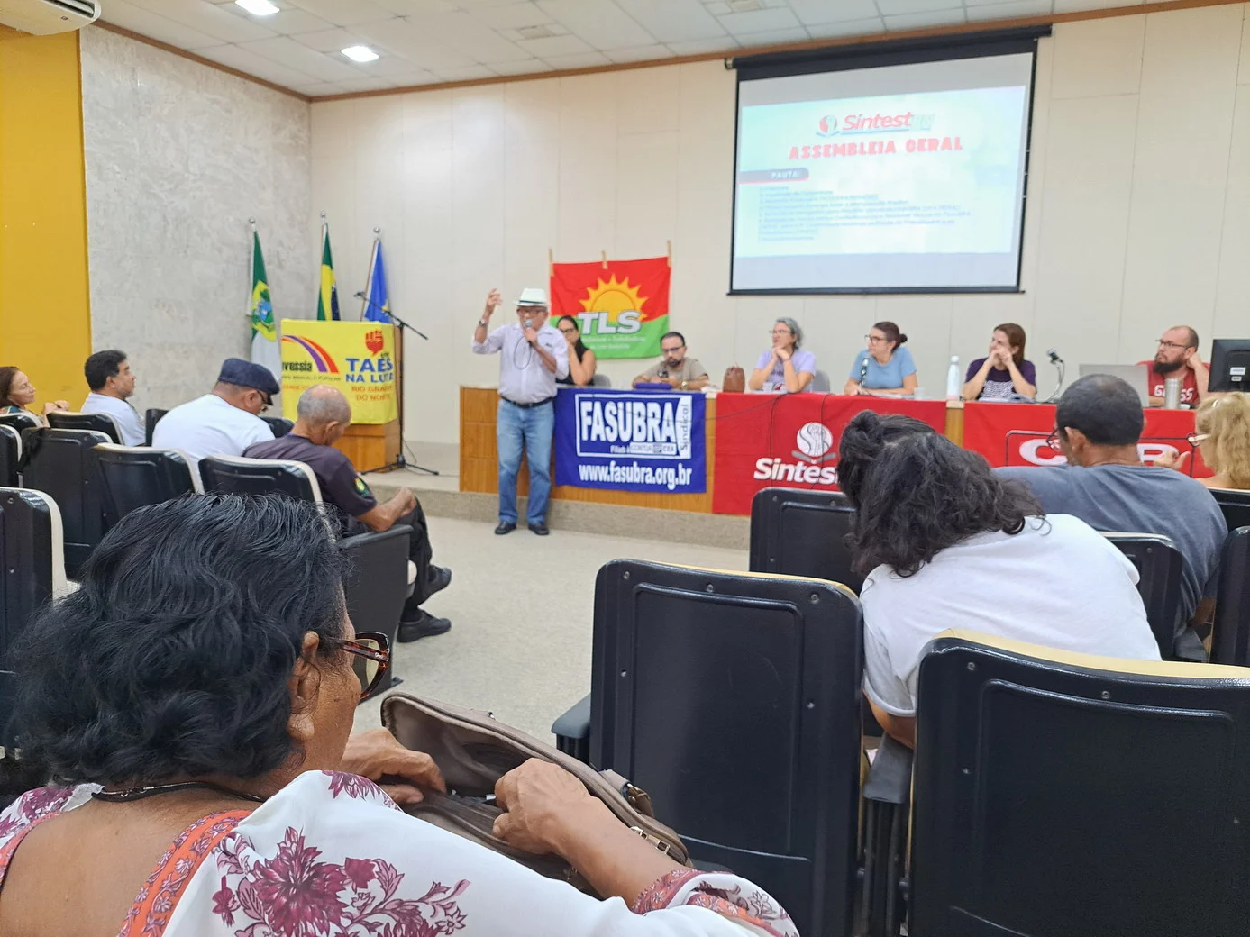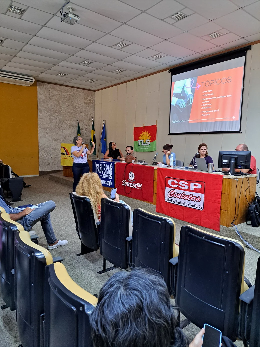 Logo no início, a coordenadora geral, Celita Pessoa, esclareceu o motivo da pauta extensa, informando que alguns pontos exigiam deliberação da categoria, como o financiamento da energia solar e da manutenção do prédio, por envolverem valores significativos.