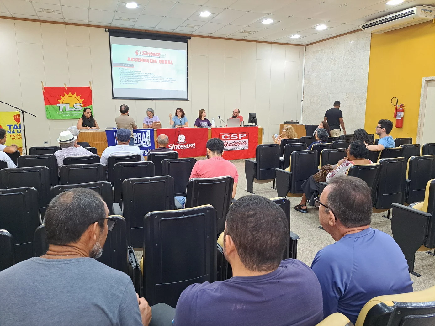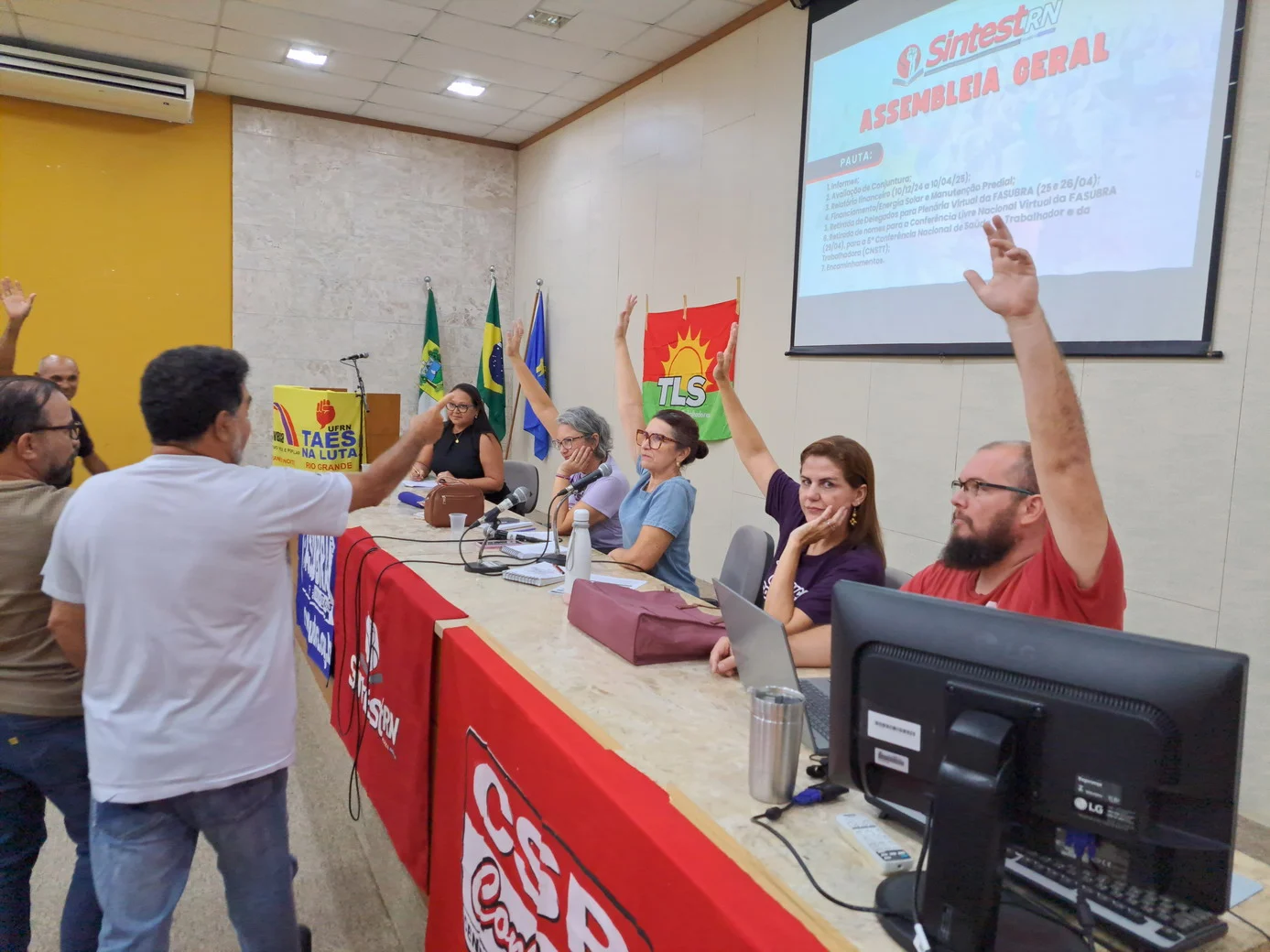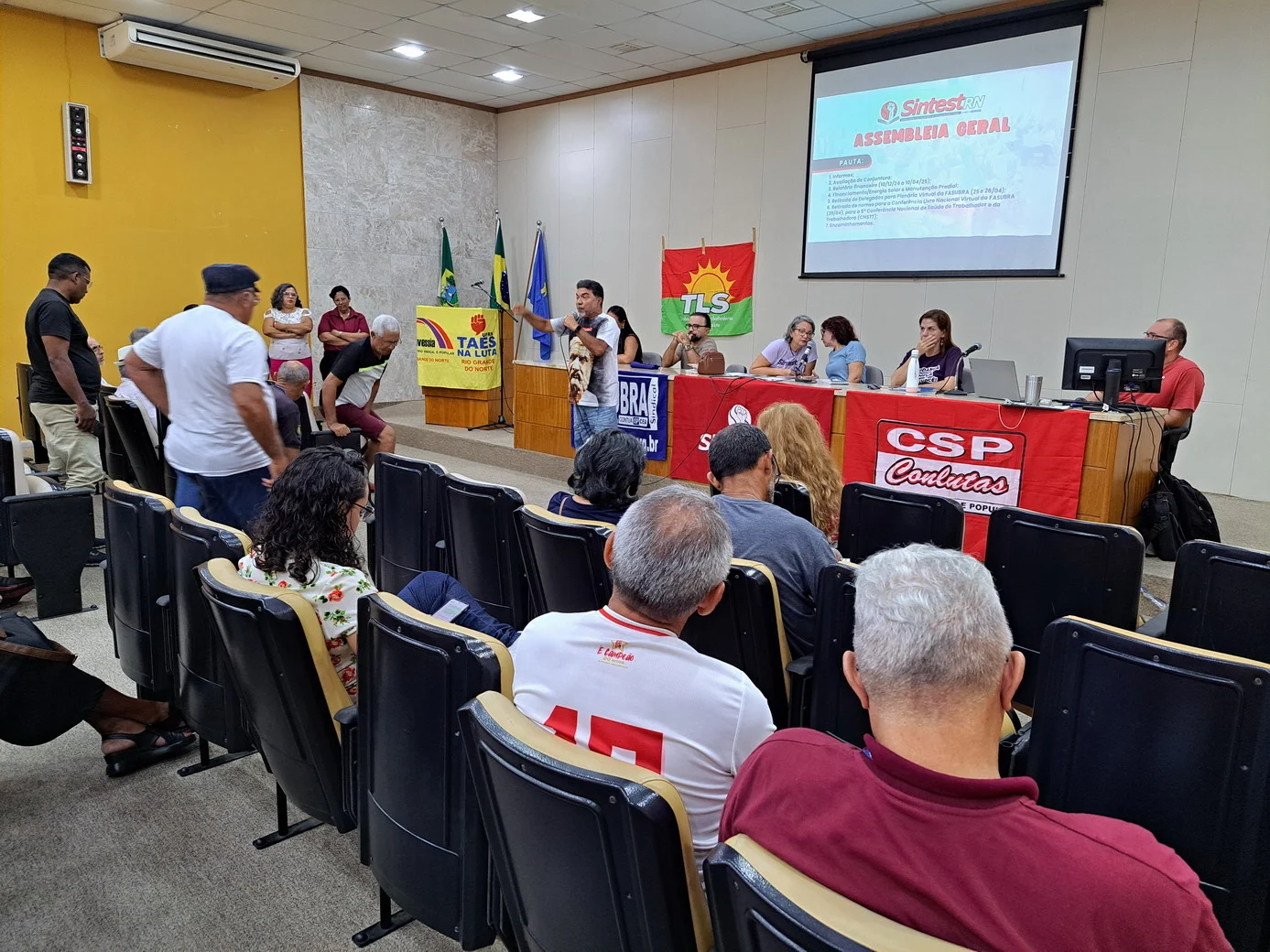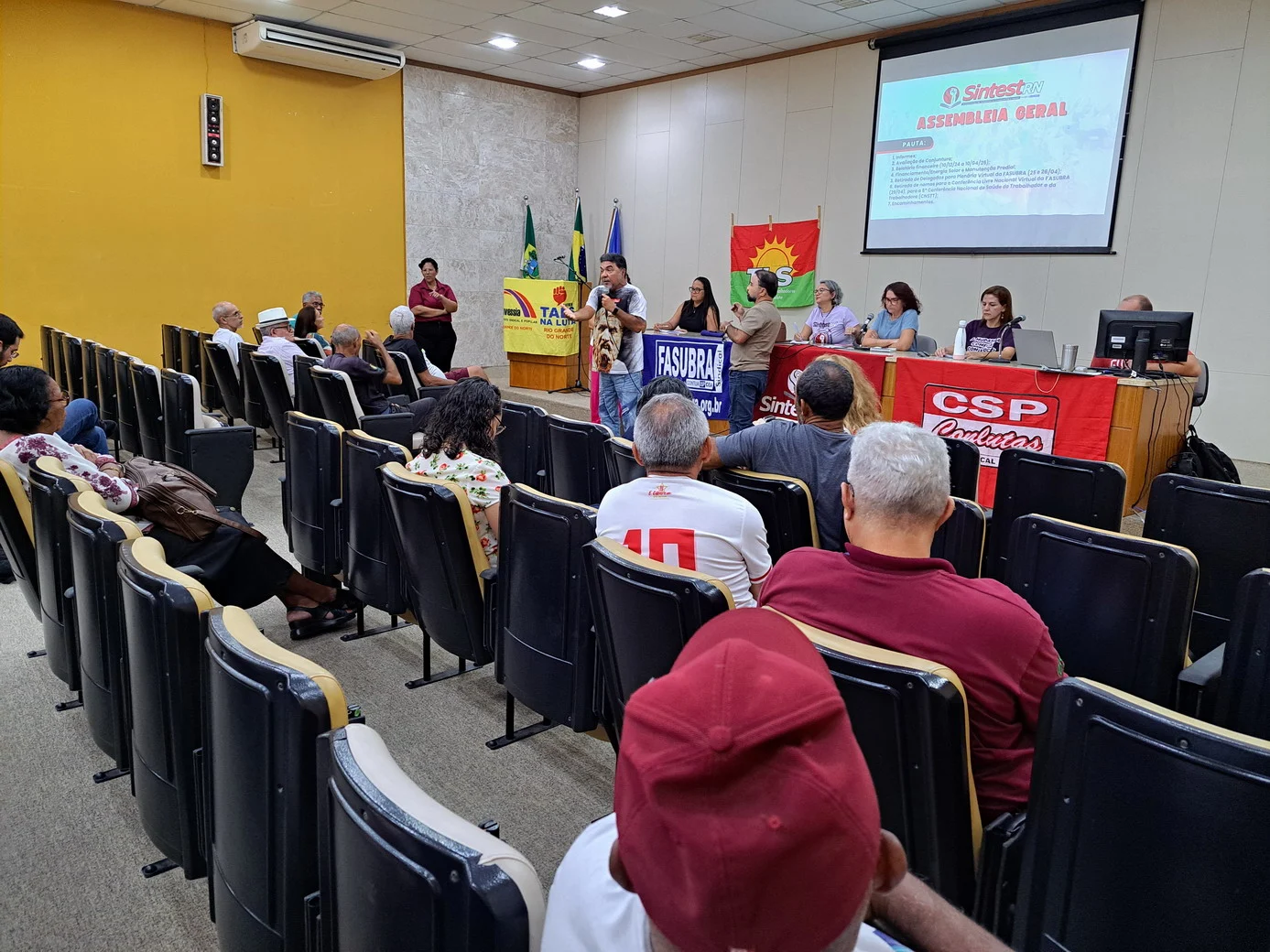 Os técnico-administrativos em educação da UFRN se reuniram na manhã desta quarta-feira (23/04), a partir das 9h, no auditório da Biblioteca Central Zila Mamede (BCZM), para mais uma Assembleia Geral convocada pelo SINTEST-RN. A atividade teve início às 9h35 e contou com uma pauta extensa, com sete pontos de discussão, incluindo avaliação de conjuntura, relatório financeiro, financiamento para energia solar, manutenção predial e escolha de delegados para a Plenária Virtual da FASUBRA.