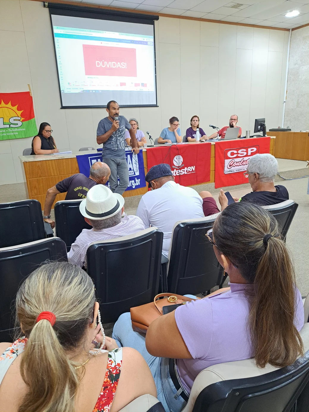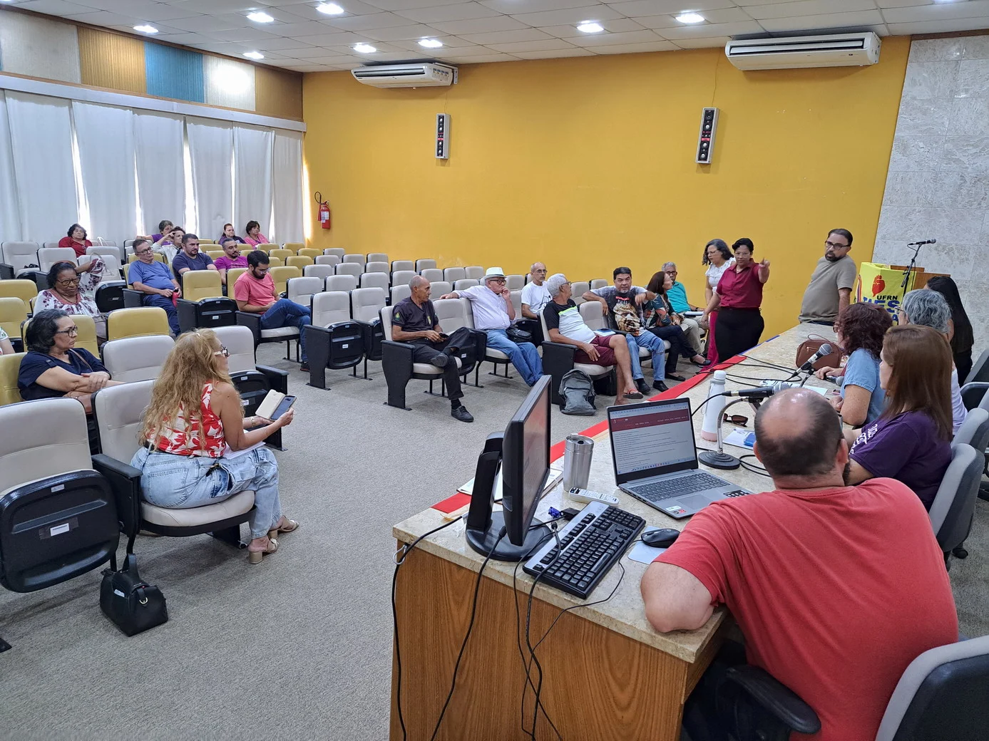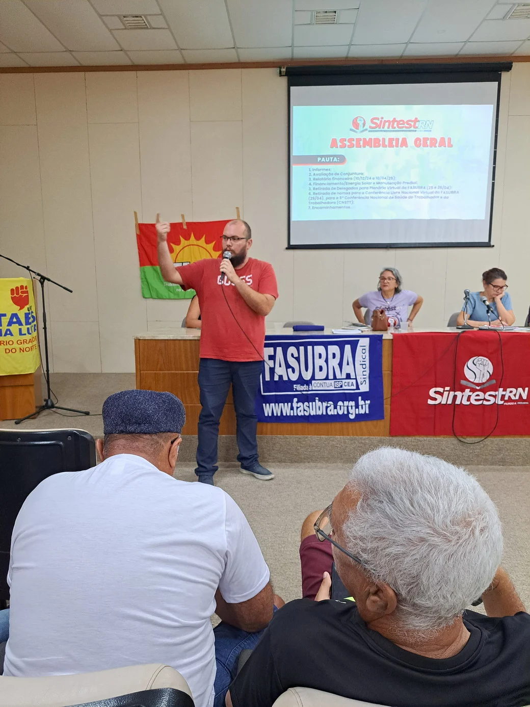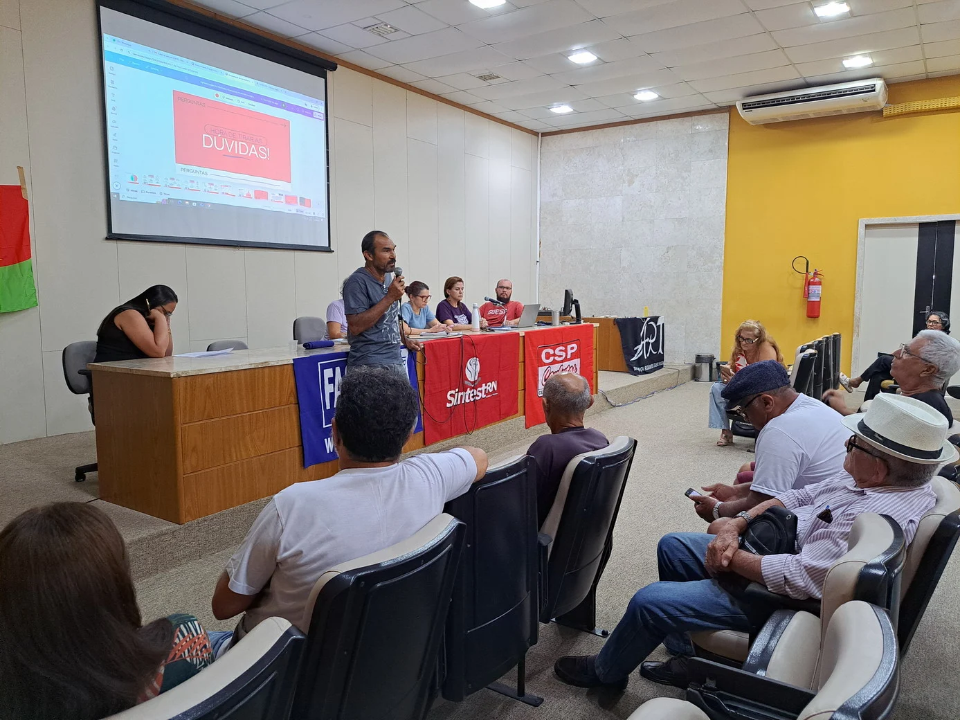 Os técnico-administrativos em educação da UFRN se reuniram na manhã desta quarta-feira (23/04), a partir das 9h, no auditório da Biblioteca Central Zila Mamede (BCZM), para mais uma Assembleia Geral convocada pelo SINTEST-RN. A atividade teve início às 9h35 e contou com uma pauta extensa, com sete pontos de discussão, incluindo avaliação de conjuntura, relatório financeiro, financiamento para energia solar, manutenção predial e escolha de delegados para a Plenária Virtual da FASUBRA.