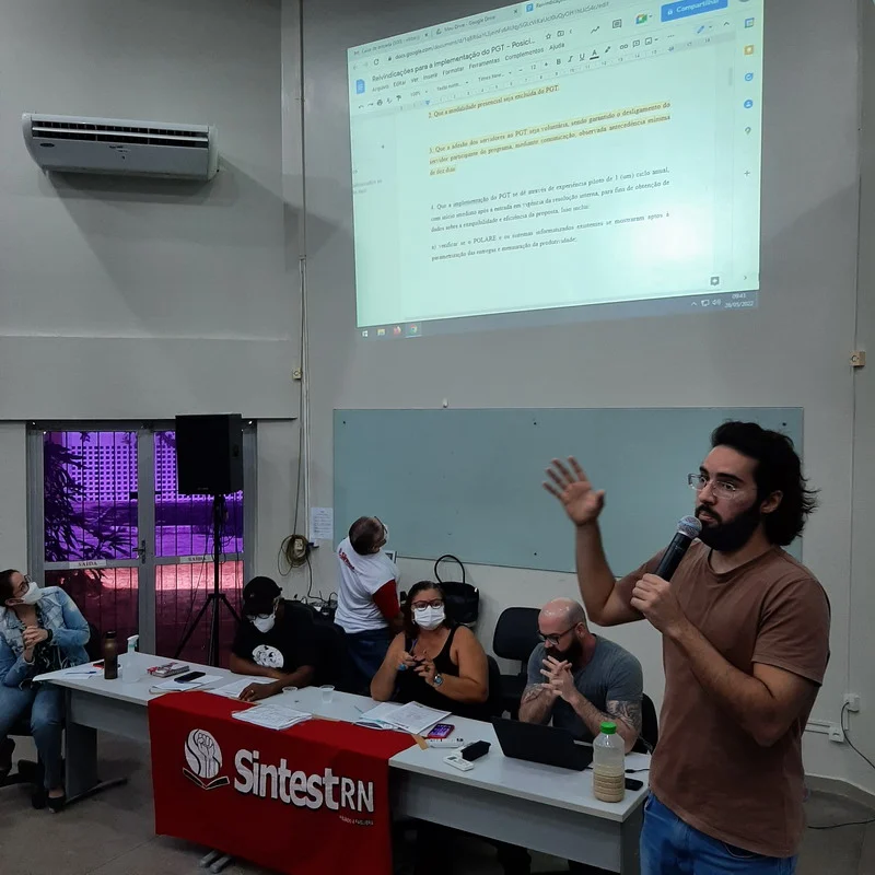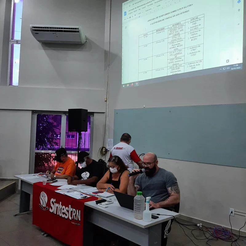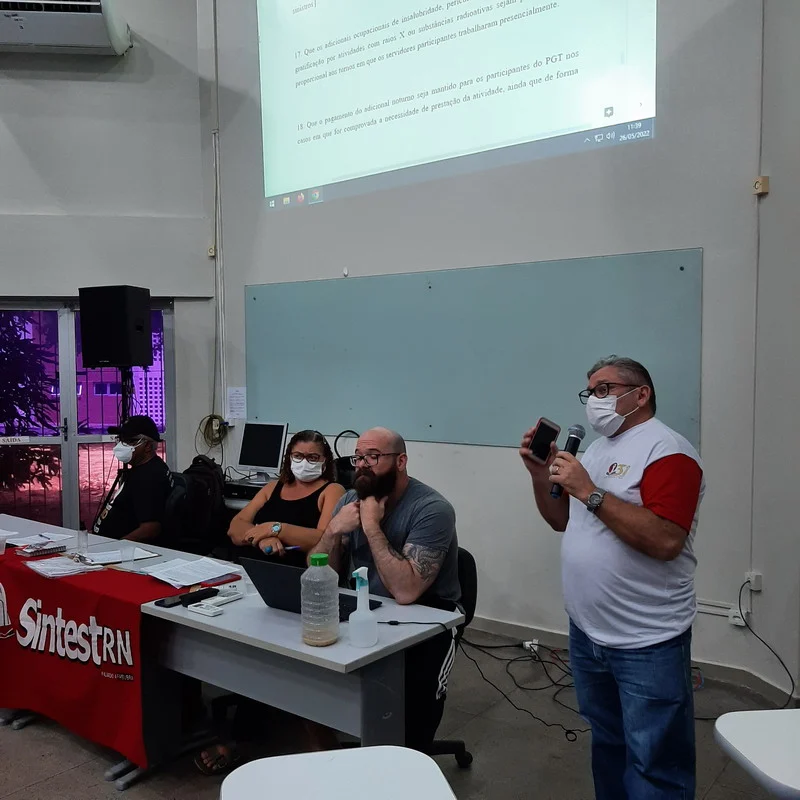 Na manhã desta quinta-feira, 26/05, o Sintest/RN realizou assembleia geral com pauta única, para discutir o Programa de Gestão do Trabalho da UFRN. O prazo para a consulta pública se encerra na próxima terça-feira, dia 31.
