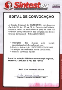 O SINTEST-RN, Sindicato Estadual dos Trabalhadores em Educação do Ensino Superior do Rio Grande do Norte, convoca toda a base da UFERSA para participar das eleições da Seção Sindical de Mossoró para o Triênio 2026/2029!