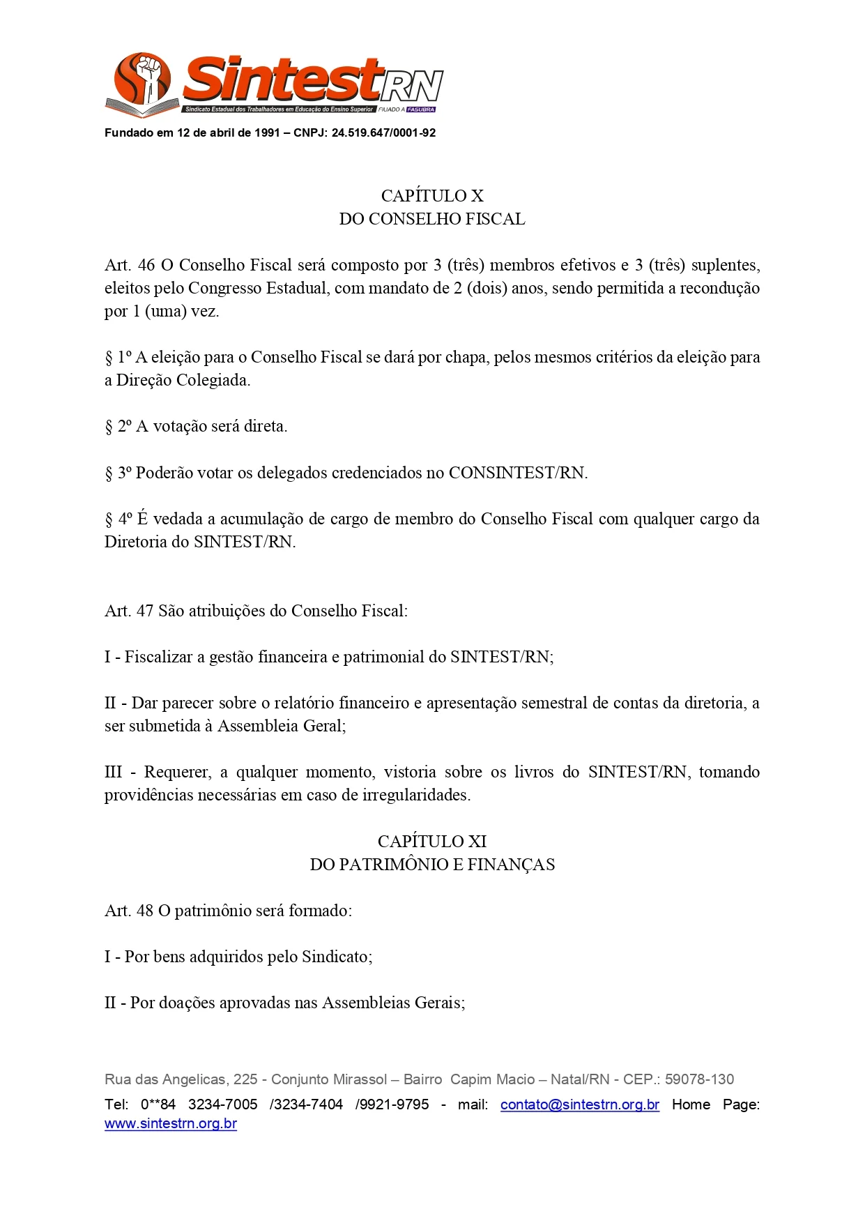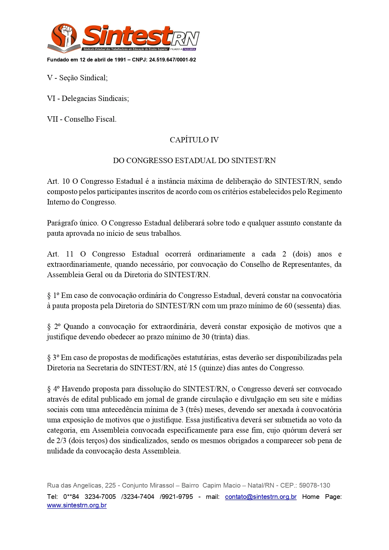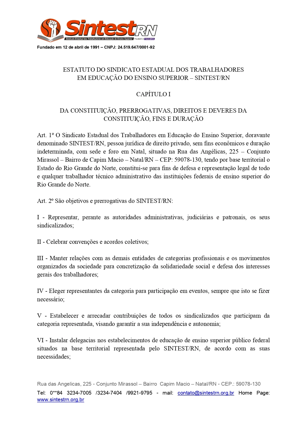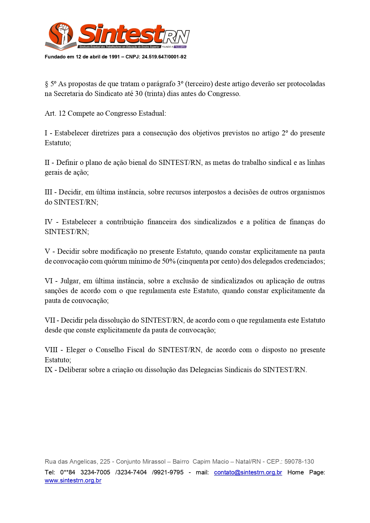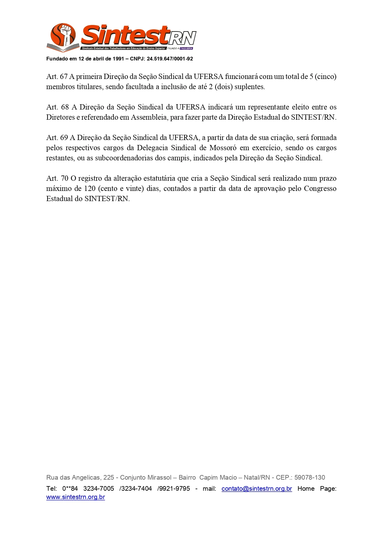 O novo estatuto foi aprovado no 17º Congresso Estadual Ordinário – XVII CONSINTEST, cujo tema foi “Avançando na consolidação de um SINTEST-RN independente, plural e de luta: desafios atuais para a organização da classe trabalhadora”.