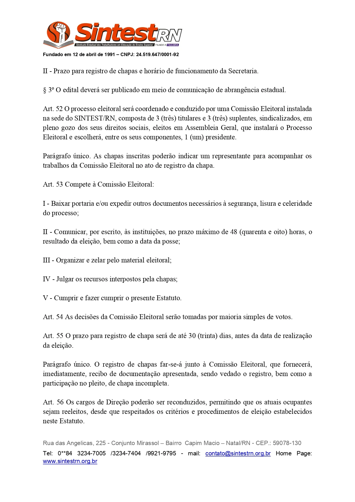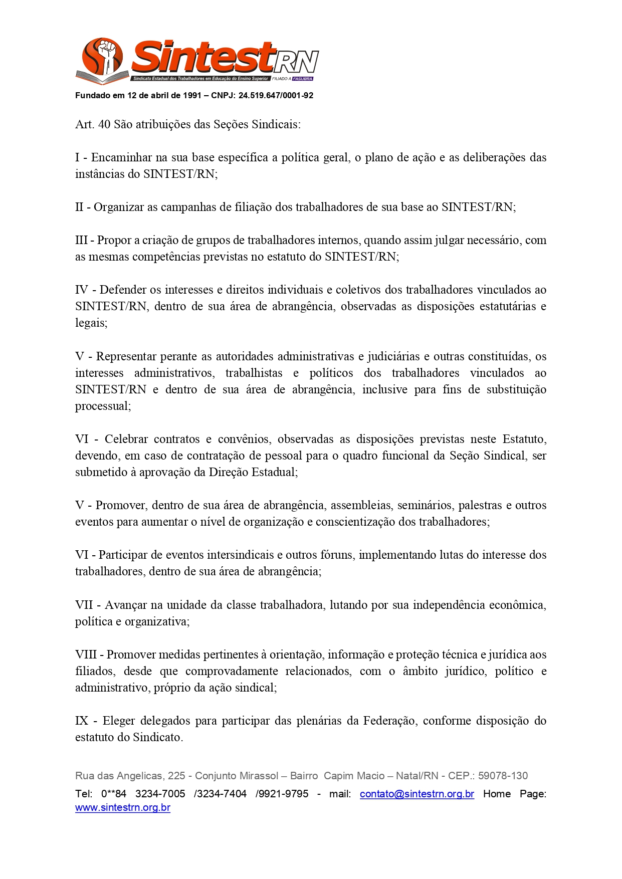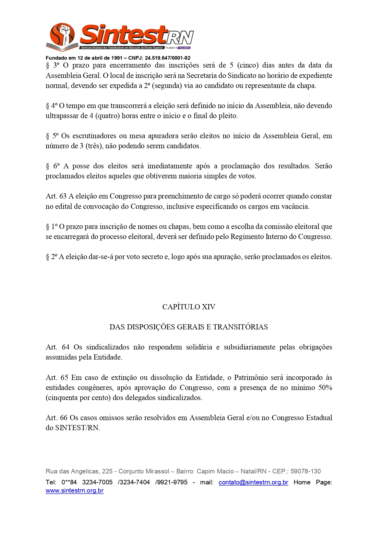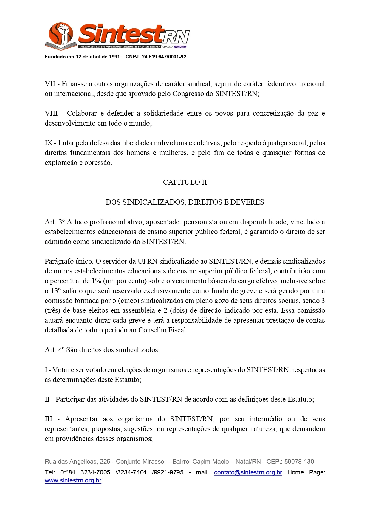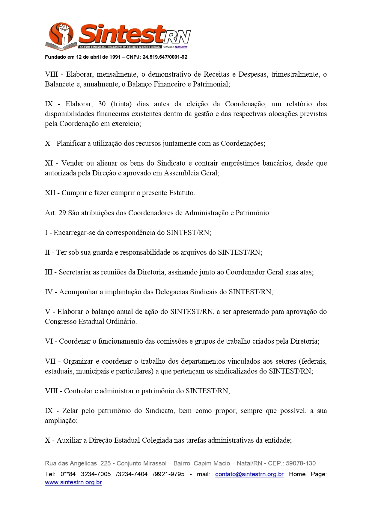 O novo estatuto foi aprovado no 17º Congresso Estadual Ordinário – XVII CONSINTEST, cujo tema foi “Avançando na consolidação de um SINTEST-RN independente, plural e de luta: desafios atuais para a organização da classe trabalhadora”.