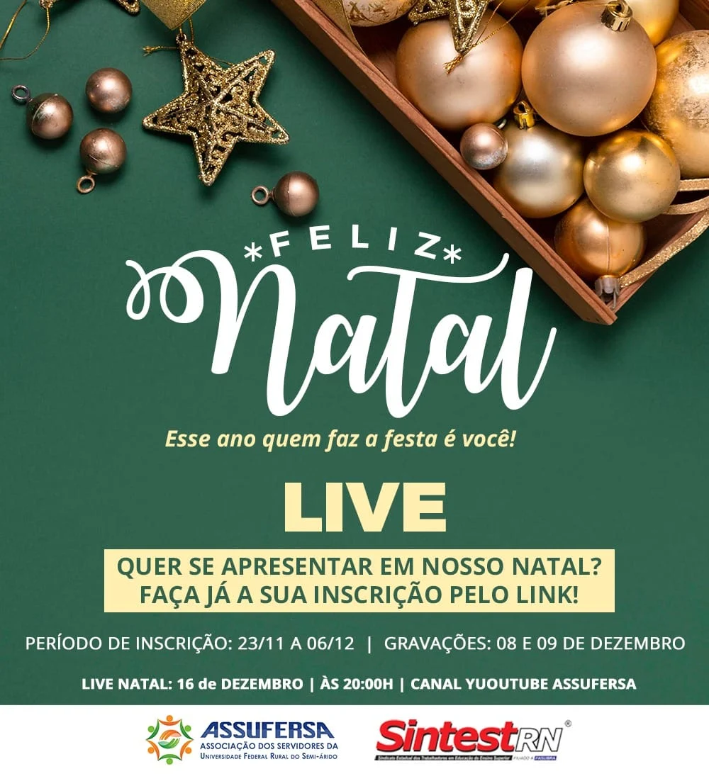 Este ano o Sintest e a Assufersa estão planejando um Natal com a cara dos Servidores da UFERSA. Queremos também a participação de todos nesse momento de confraternização, por isso convidamos os servidores que tocam, cantam, fazem parte de alguma banda, a se apresentarem durante a festa natalina.