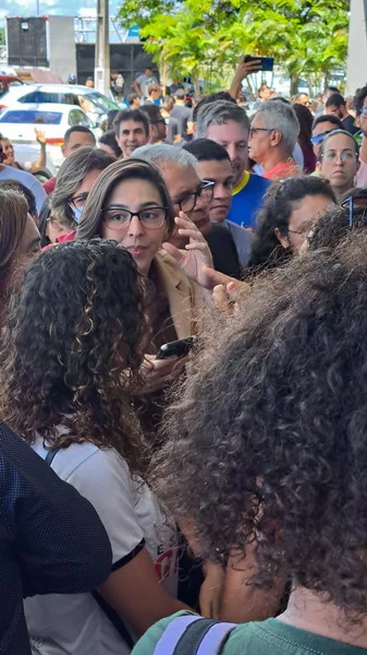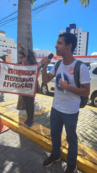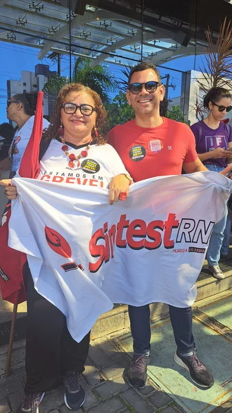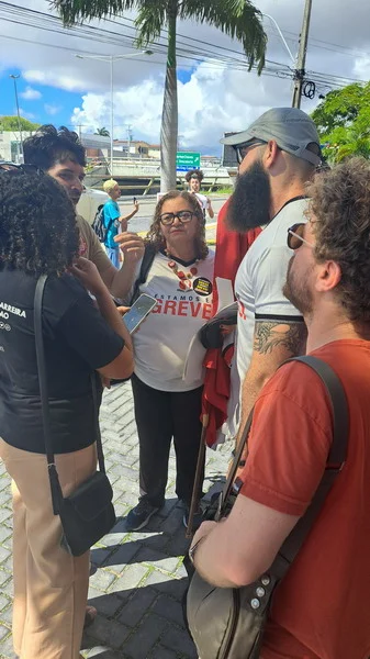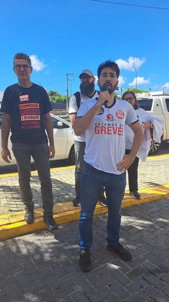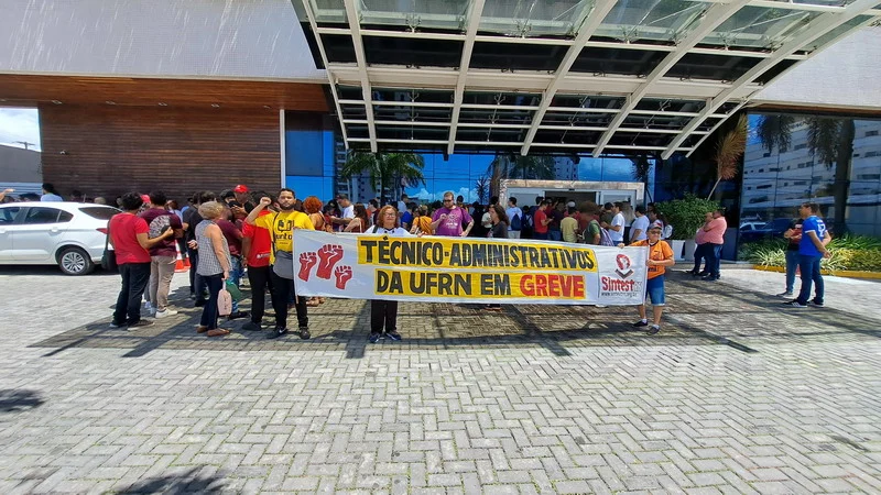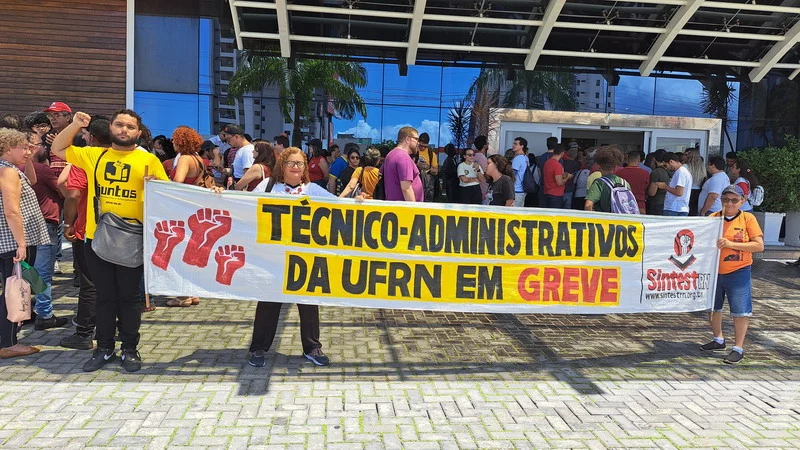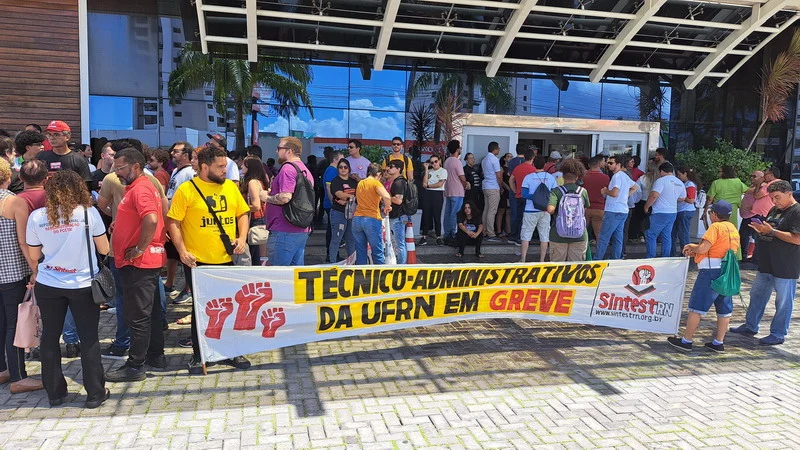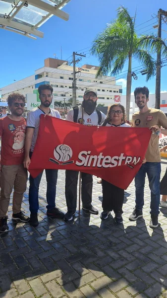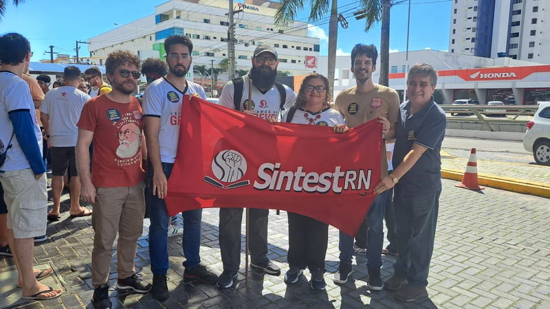 O SINTEST-RN e o Comando Local de Greve (CLG) estiveram presentes no ato “Bom dia Ministro”, realizado na manhã desta segunda-feira (15/04) no evento de lançamento do programa “Pé de meia”, do Governo Federal, no RN. O Ato “Bom dia Ministro” foi organizado em conjunto com o SINASEFE Natal, sindicato que representa os técnico-administrativos e docentes do IFRN, em greve desde o dia 03/04, além de representações estudantis. O objetivo era chamar a atenção do Ministro da Educação, Camilo Santana, para a pauta de reivindicações dos servidores das Universidades e Institutos Federais que estão em greve em todo o país, lutando pela recomposição orçamentária das Instituições de Ensino Superior, revogação das medidas contrárias aos serviços públicos, recomposição salarial e reestruturação das carreiras.