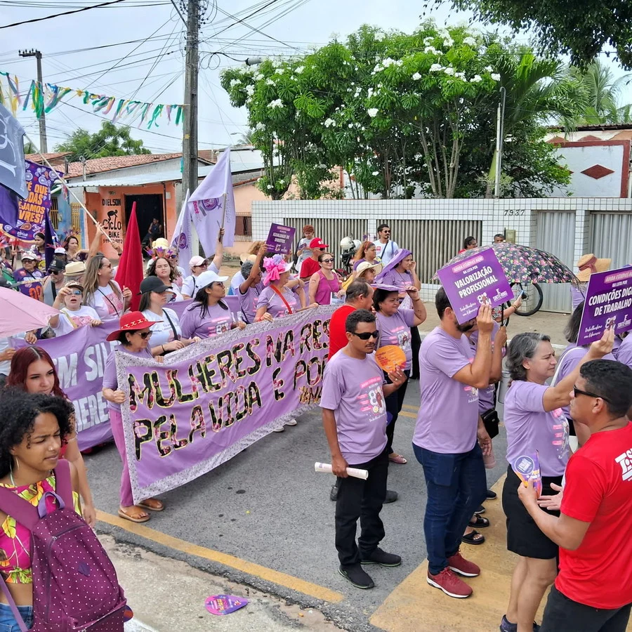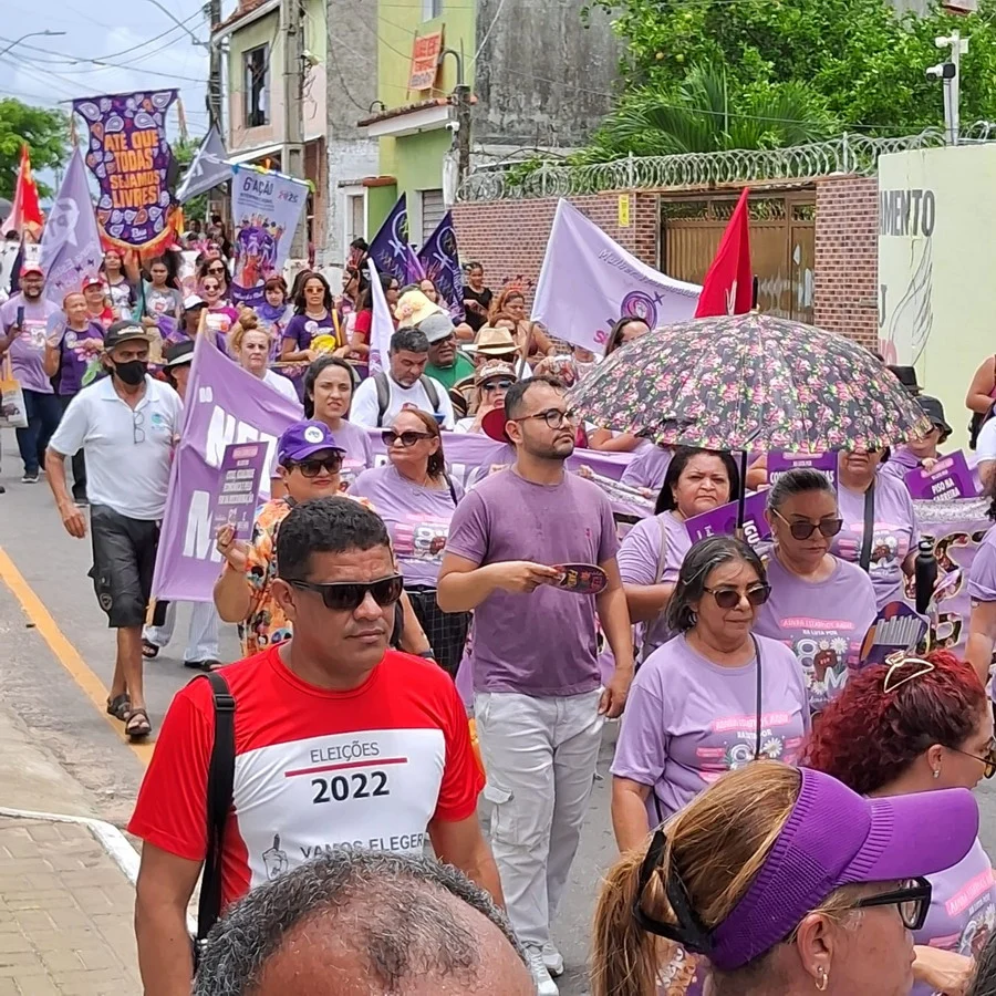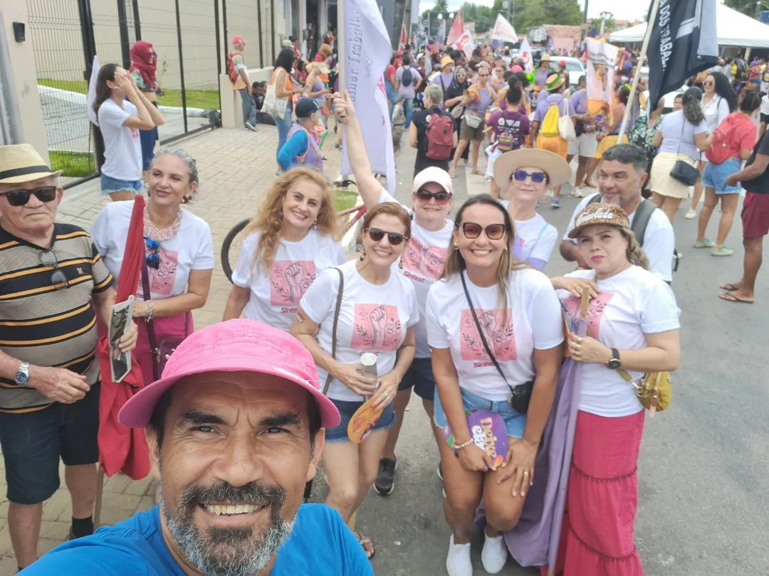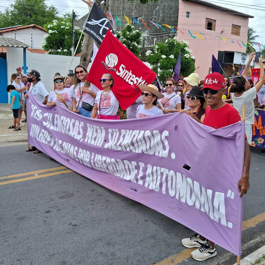 Carregando uma faixa que dizia “Nem silenciosas, nem silenciadas. Mulheres nas ruas por liberdade e  autonomia”, bandeiras e instrumentos musicais, boa parte da direção do sindicato e servidores da nossa base marcharam pelas ruas da Redinha, destacando a necessidade de seguir na luta pelos direitos das mulheres trabalhadoras.