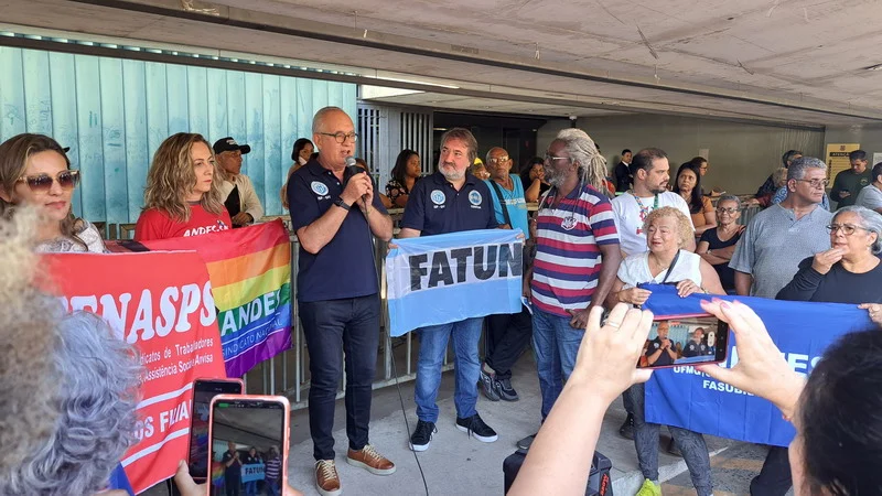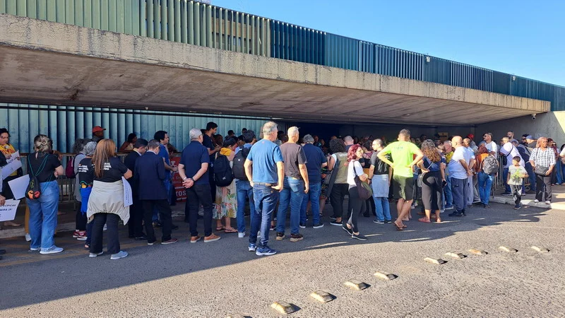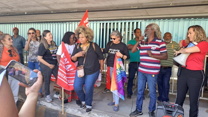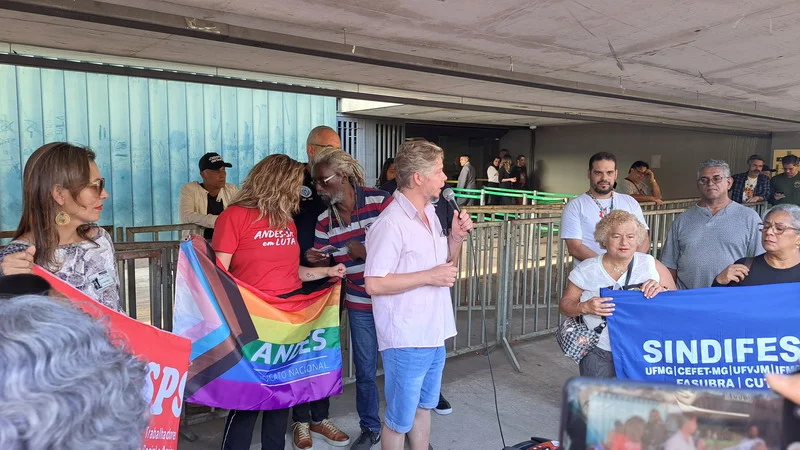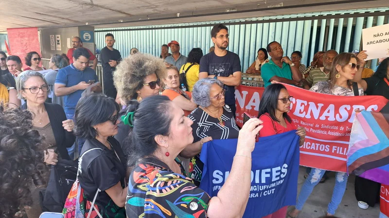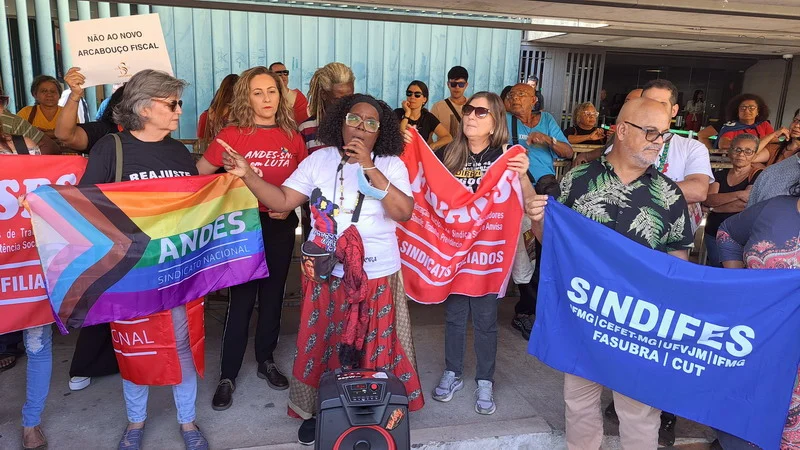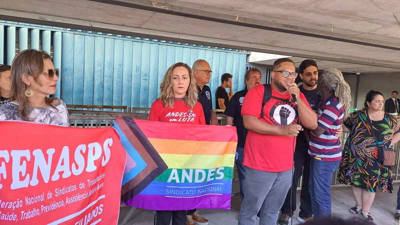 Vários sindicatos que também estão em Brasília para o Confasubra estiveram presentes no ato que concentrou os manifestantes na estrada do prédio anexo 2, onde ocorreria a votação da urgência para o novo ajuste fiscal do governo, chamado de Arcabouço Fiscal.