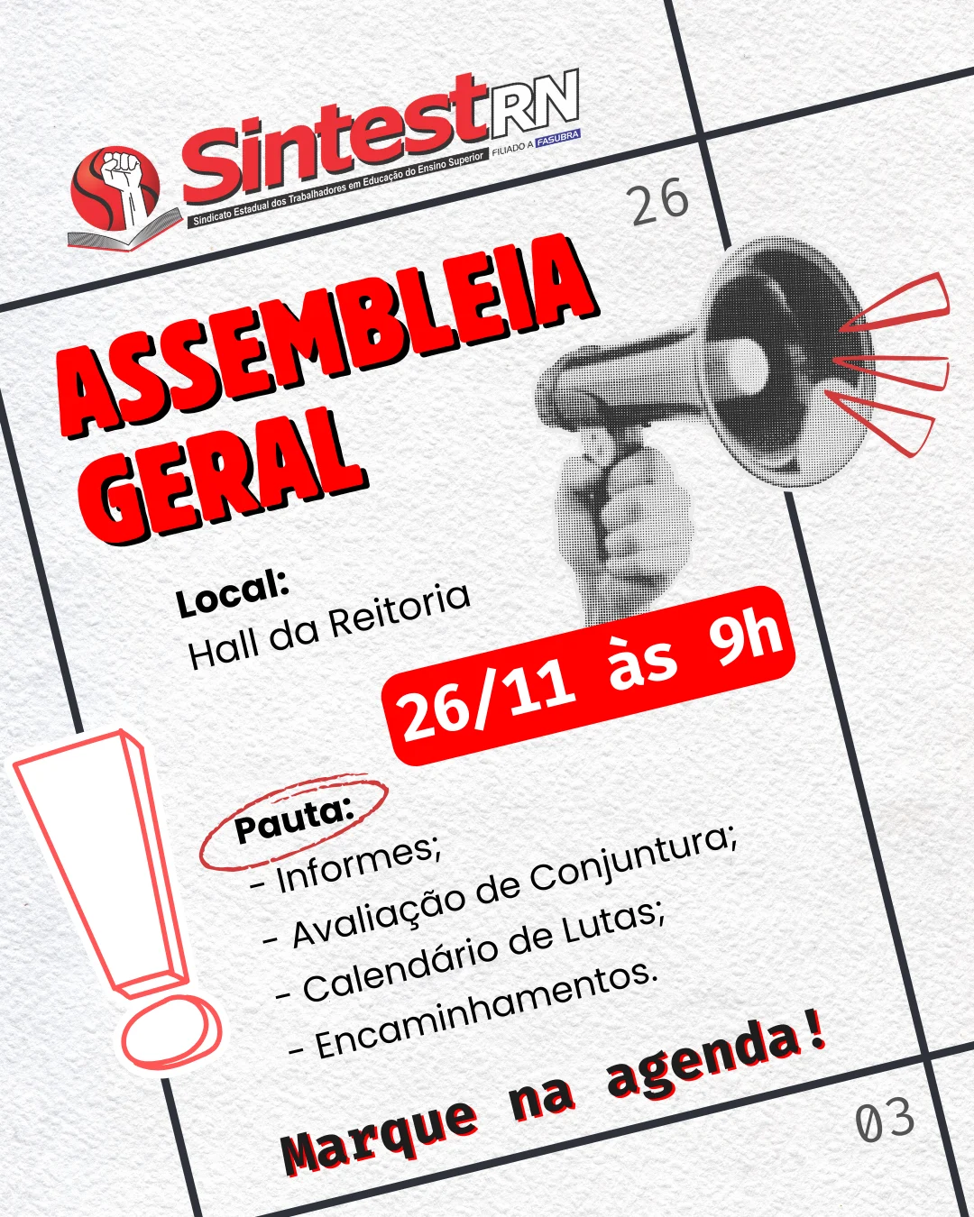 📣🚨 O SINTEST convoca os TAEs da UFRN para a ASSEMBLEIA GERAL na próxima quarta-feira, 26/11. PAUTA: Informes; Avaliação de conjuntura; Calendário de Lutas e Encaminhamentos. 🗓 Data: 26 de novembro (quarta-feira) 🕘 Horário: 9h ...