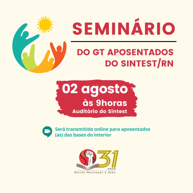 O Sindicato Estadual dos Trabalhadores em Educação do Ensino Superior do Rio Grande do Norte, através da coordenação de aposentados e pensionistas, vai realizar o Seminário do GT Aposentados do Sintest/RN na próxima terça-feira, 02 ...