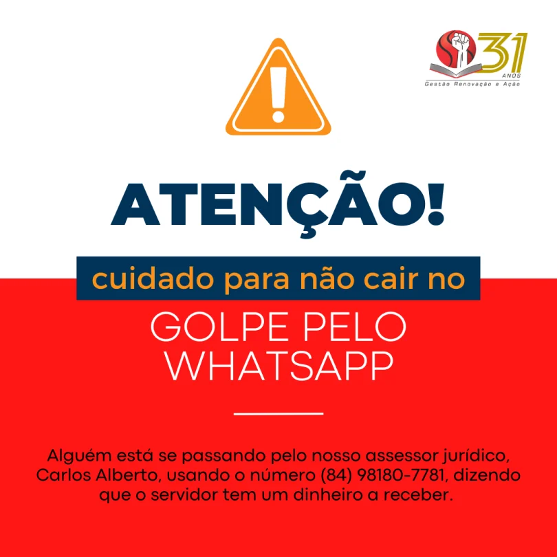 Recebemos o alerta de que alguém está se passando pelo nosso assessor jurídico, Carlos Alberto Marques, e pelo whatsapp, através do número (84) 98180-7781, está enviando mensagens dizendo que o servidor tem um dinheiro à ...
