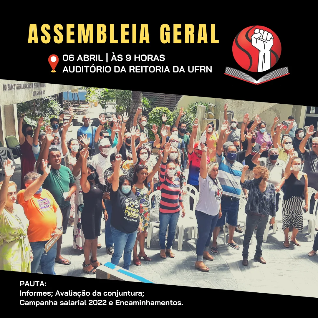Colega servidor, fique atento às nossas atividades e participe da luta pelo reajuste salarial de 19,99%. Venha para a assembleia da categoria, na próxima quarta-feira, 06/04, a partir das 9 horas no auditório da reitoria. ...