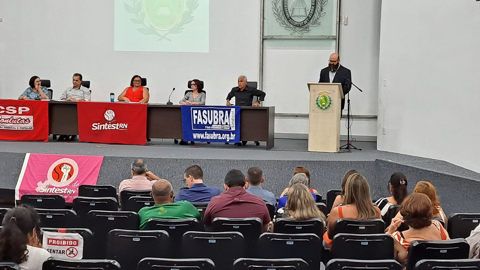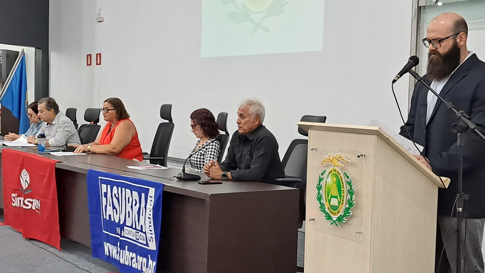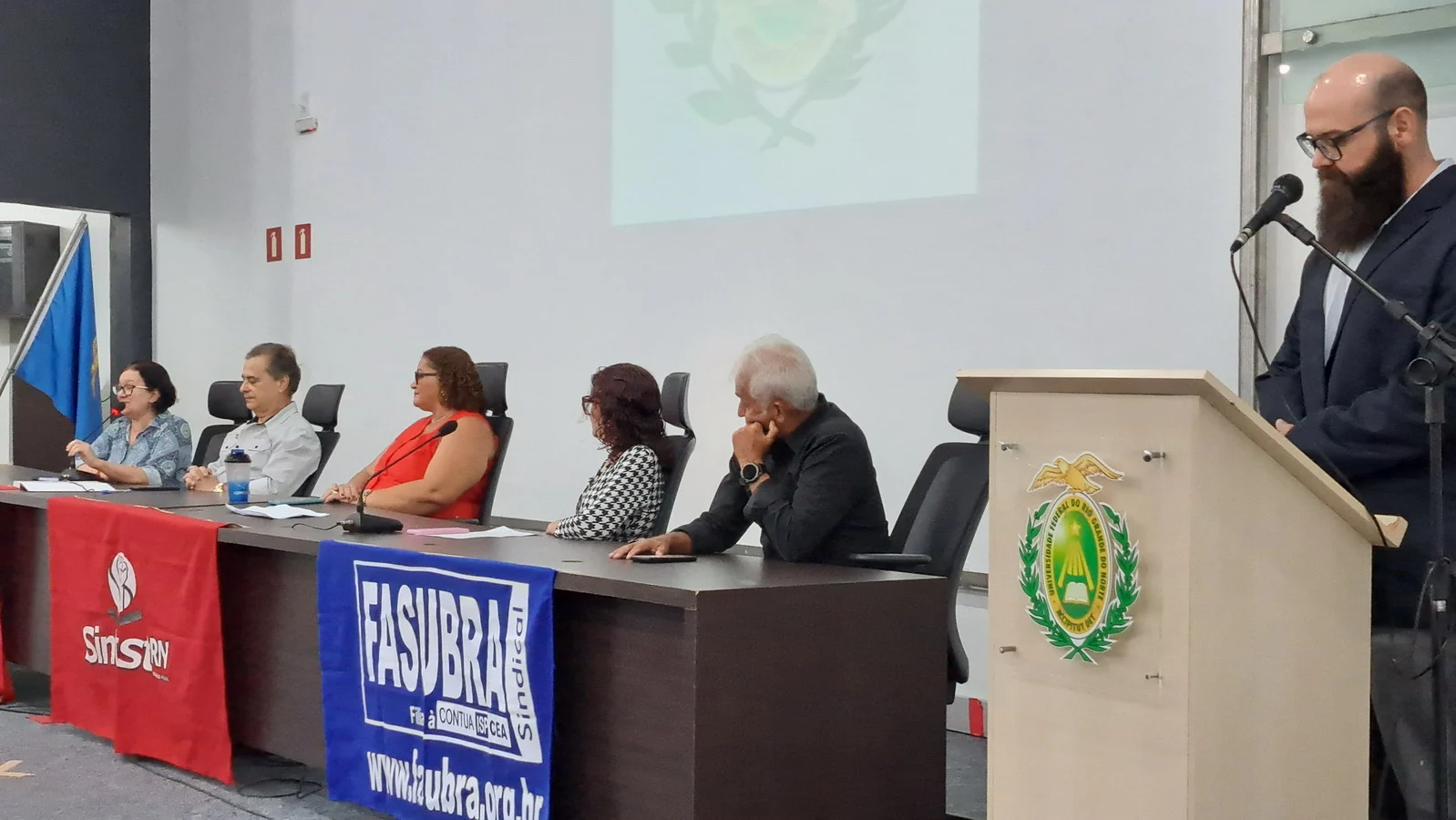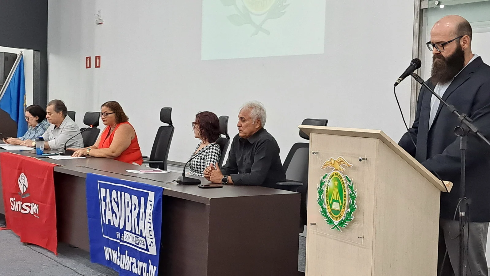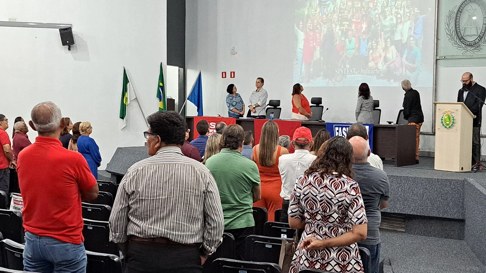 Na manhã desta terça-feira, 10 de dezembro de 2024, os 26 novos dirigentes do SINTEST-RN, eleitos em 13 de novembro, assumiram formalmente seus respectivos cargos em uma cerimônia de posse que aconteceu no auditório da Reitoria da UFRN. O evento foi marcado pela presença de vários ex-dirigentes do sindicato, por representantes da Direção que se encerra e contou com a presença do Vice-Reitor, Henio Miranda e da Pró-Reitora de Gestão de Pessoas, Mirian Dantas, que compuseram a mesa juntamente com Robertinho Silva, representando a FASUBRA, Celita Pessoa, eleita como Coordenadora Geral e Aparecida Dantas, representando a direção que se encerra.