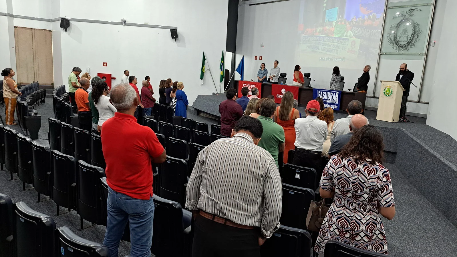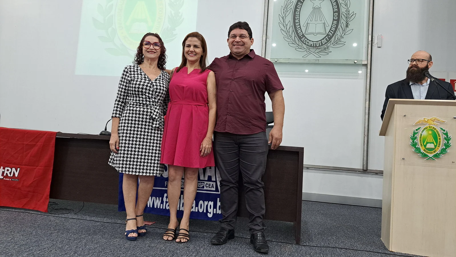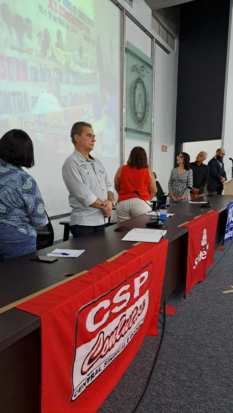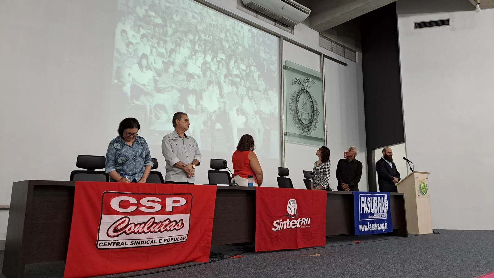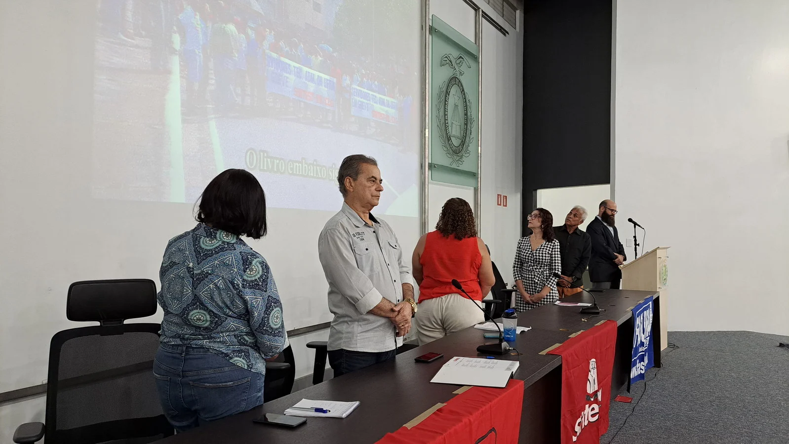 Na manhã desta terça-feira, 10 de dezembro de 2024, os 26 novos dirigentes do SINTEST-RN, eleitos em 13 de novembro, assumiram formalmente seus respectivos cargos em uma cerimônia de posse que aconteceu no auditório da Reitoria da UFRN. O evento foi marcado pela presença de vários ex-dirigentes do sindicato, por representantes da Direção que se encerra e contou com a presença do Vice-Reitor, Henio Miranda e da Pró-Reitora de Gestão de Pessoas, Mirian Dantas, que compuseram a mesa juntamente com Robertinho Silva, representando a FASUBRA, Celita Pessoa, eleita como Coordenadora Geral e Aparecida Dantas, representando a direção que se encerra.