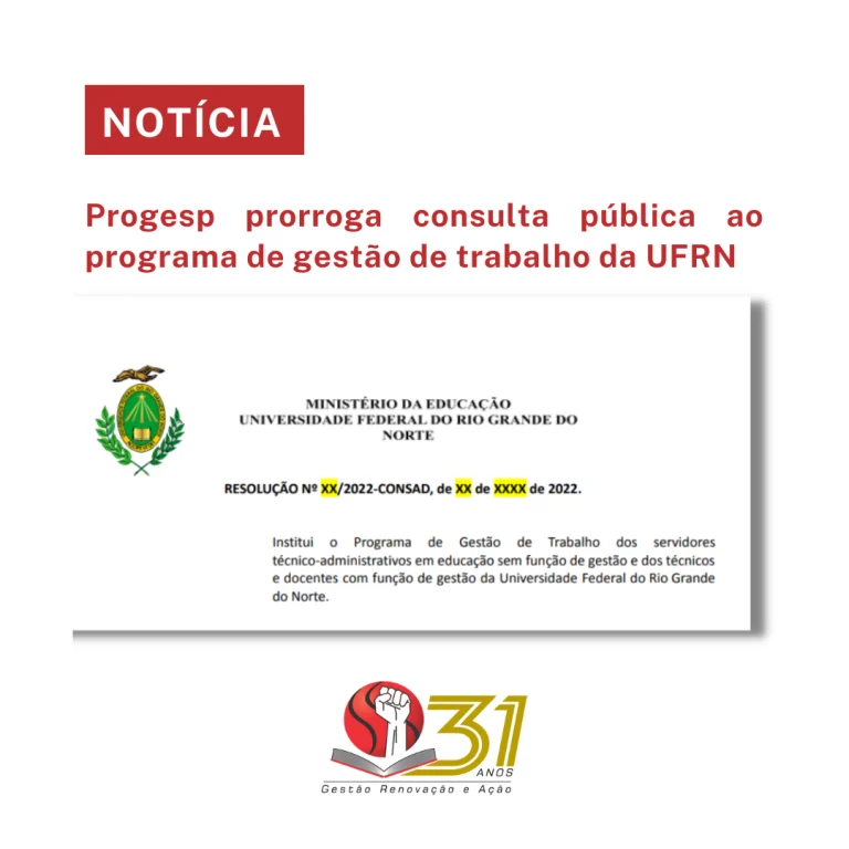 Entre 12 de abril e 2 de maio a UFRN, por meio da Pró-Reitoria de Gestão de Pessoas (Progesp), abriu chamada pública para recebimento de sugestões para o Programa de Gestão de Trabalho (PGT) que tem por finalidade disciplinar a execução das atividades da força de trabalho da Universidade, buscando a eficiência e a qualidade na prestação dos serviços ao usuário.