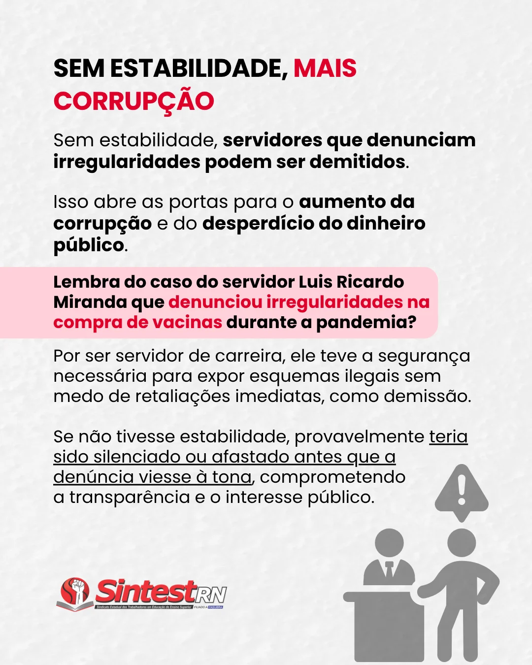 A estabilidade não é privilégio, é um instrumento de defesa da sociedade contra abusos, perseguições políticas e corrupção. Sem ela, servidores podem ser demitidos por pressões políticas, e quem perde é o povo que depende de um serviço público técnico, imparcial e de qualidade.
