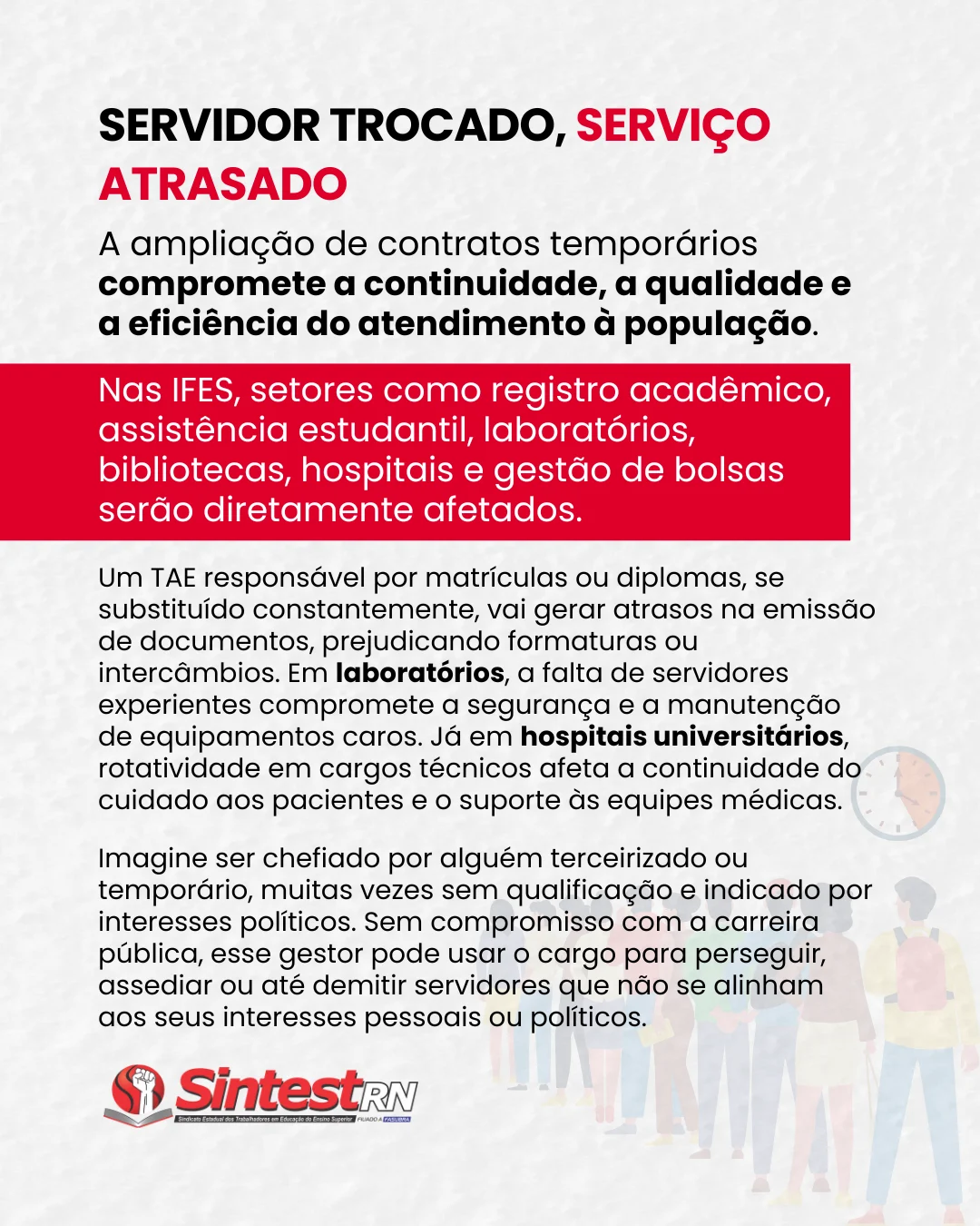 Na próxima semana vamos abordar temas como APOSENTADORIA, REDUÇÃO DE SALÁRIOS, FIM DAS PROGRESSÕES AUTOMÁTICAS, AVALIAÇÃO BASEADA EM PRODUTIVIDADE e SAÚDE MENTAL. Fique atento, compartilhe e mobilize seus colegas. Só a luta coletiva pode barrar esse retrocesso!