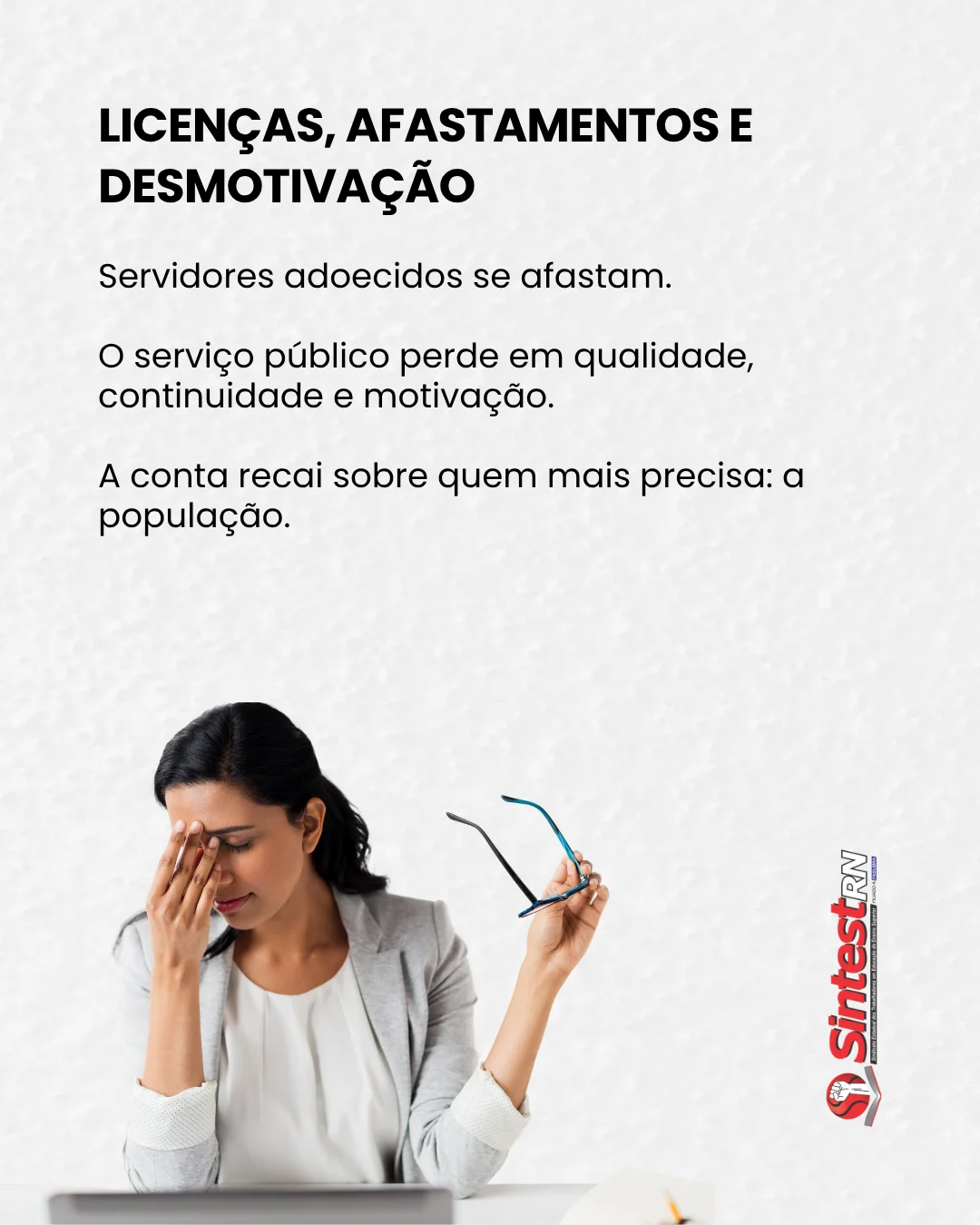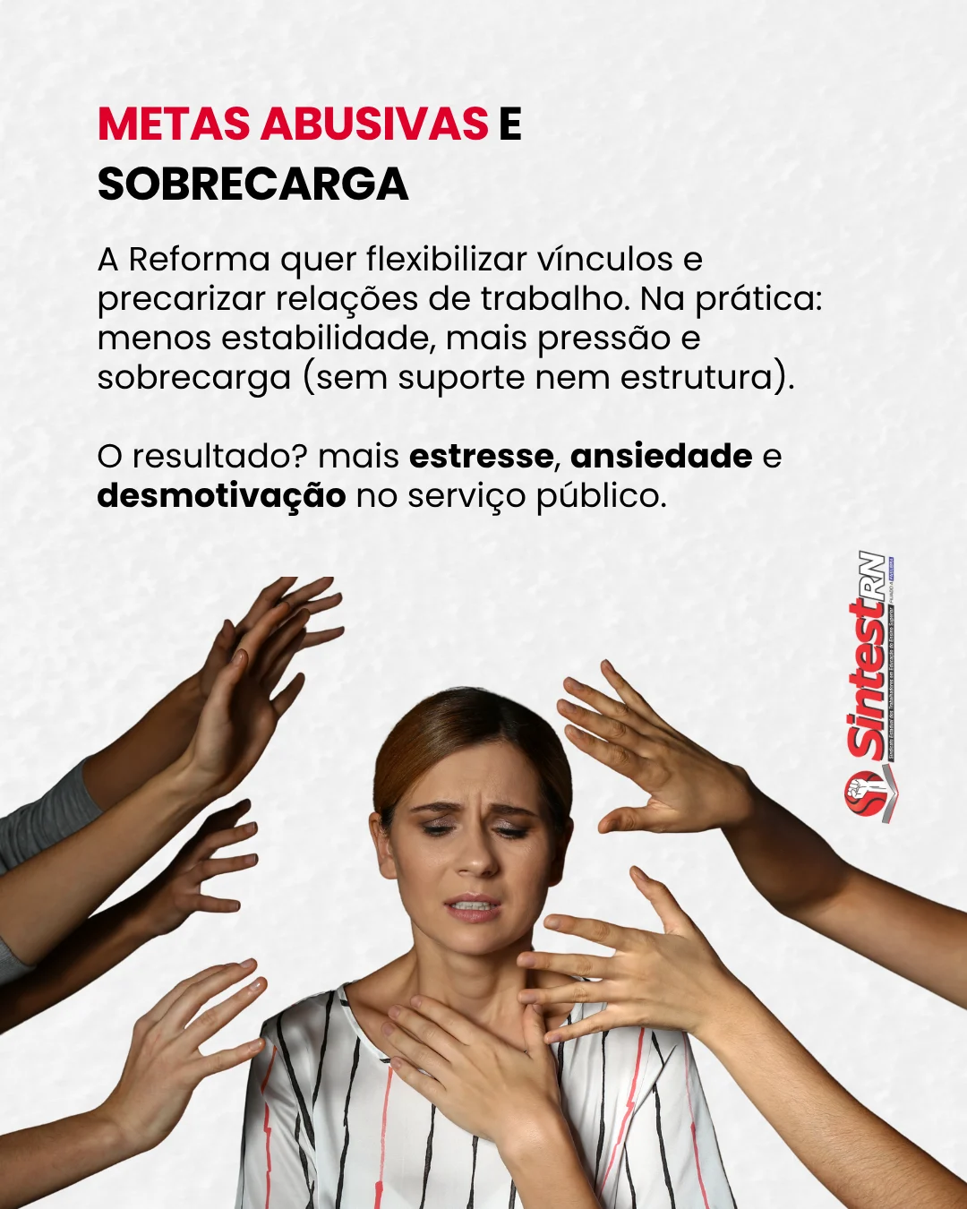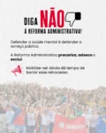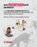 A Reforma Administrativa não afeta só seus direitos. Ela ameaça sua saúde mental. Com mais pressão, sobrecarga de trabalho, metas abusivas e menos estabilidade, o ambiente se torna insustentável. Servidor doente não é eficiência, é descaso!