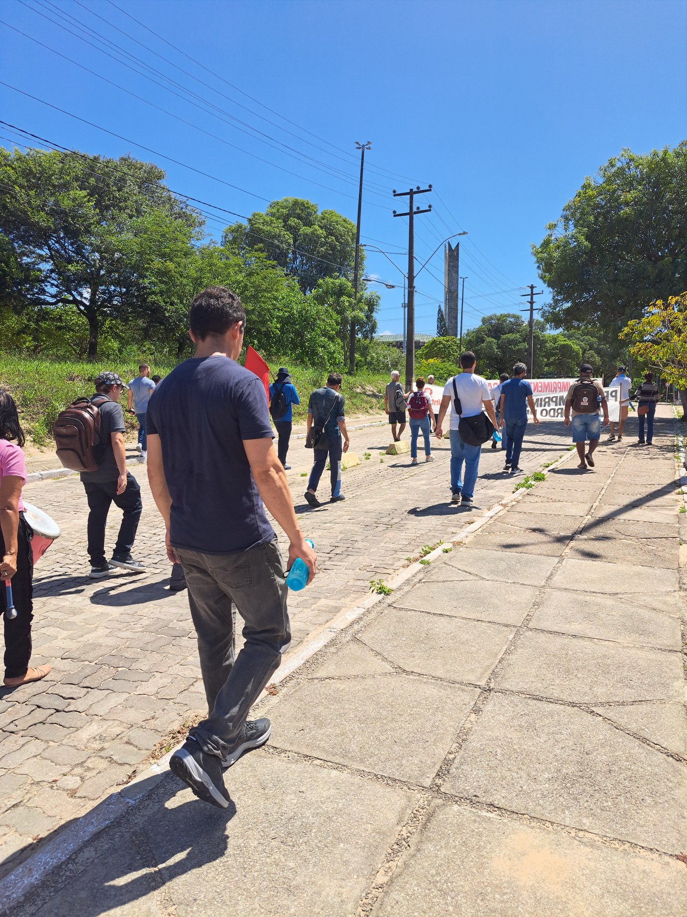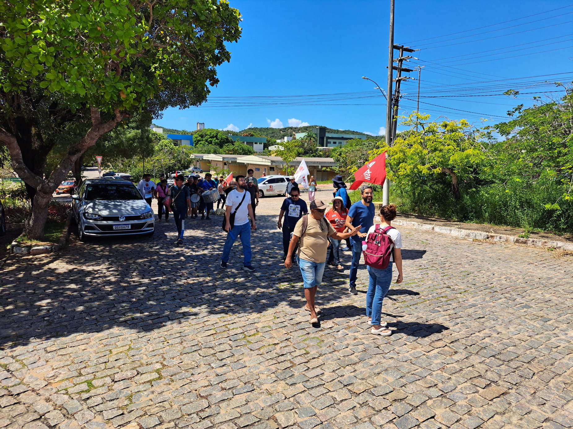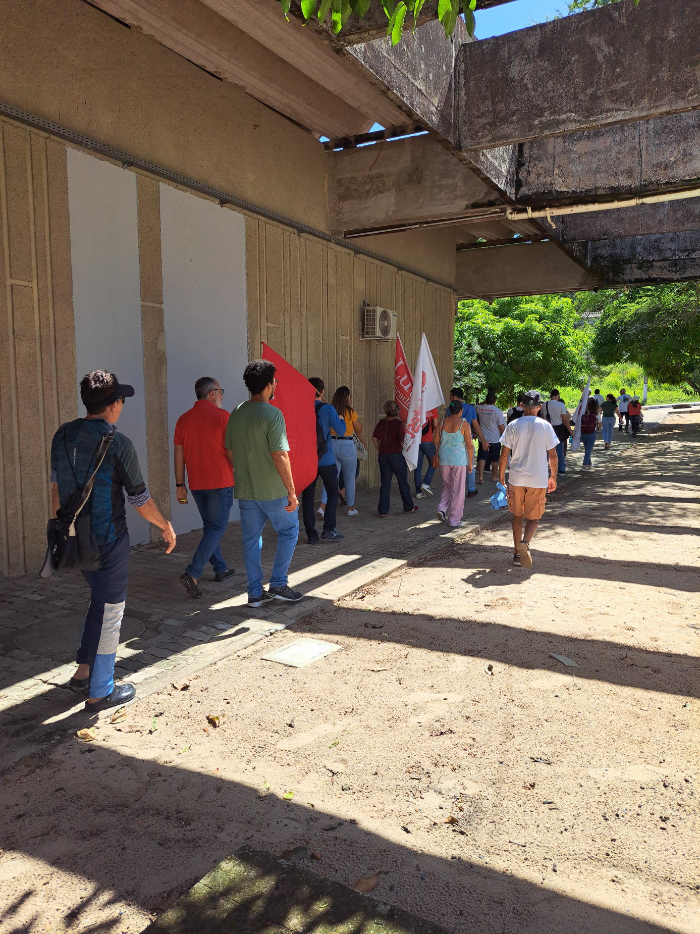 Com apitos, faixas, bandeiras e palavras de ordem, os manifestantes seguiram em caminhada pelo campus universitário, dialogando com estudantes e conclamando mais servidores a se somarem à paralisação.