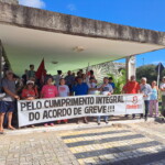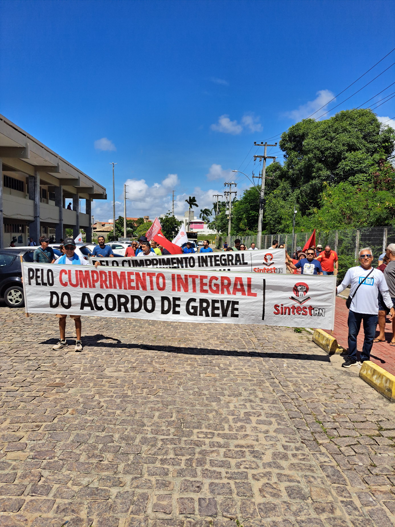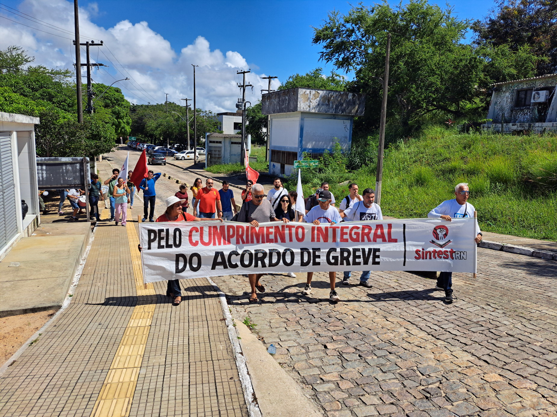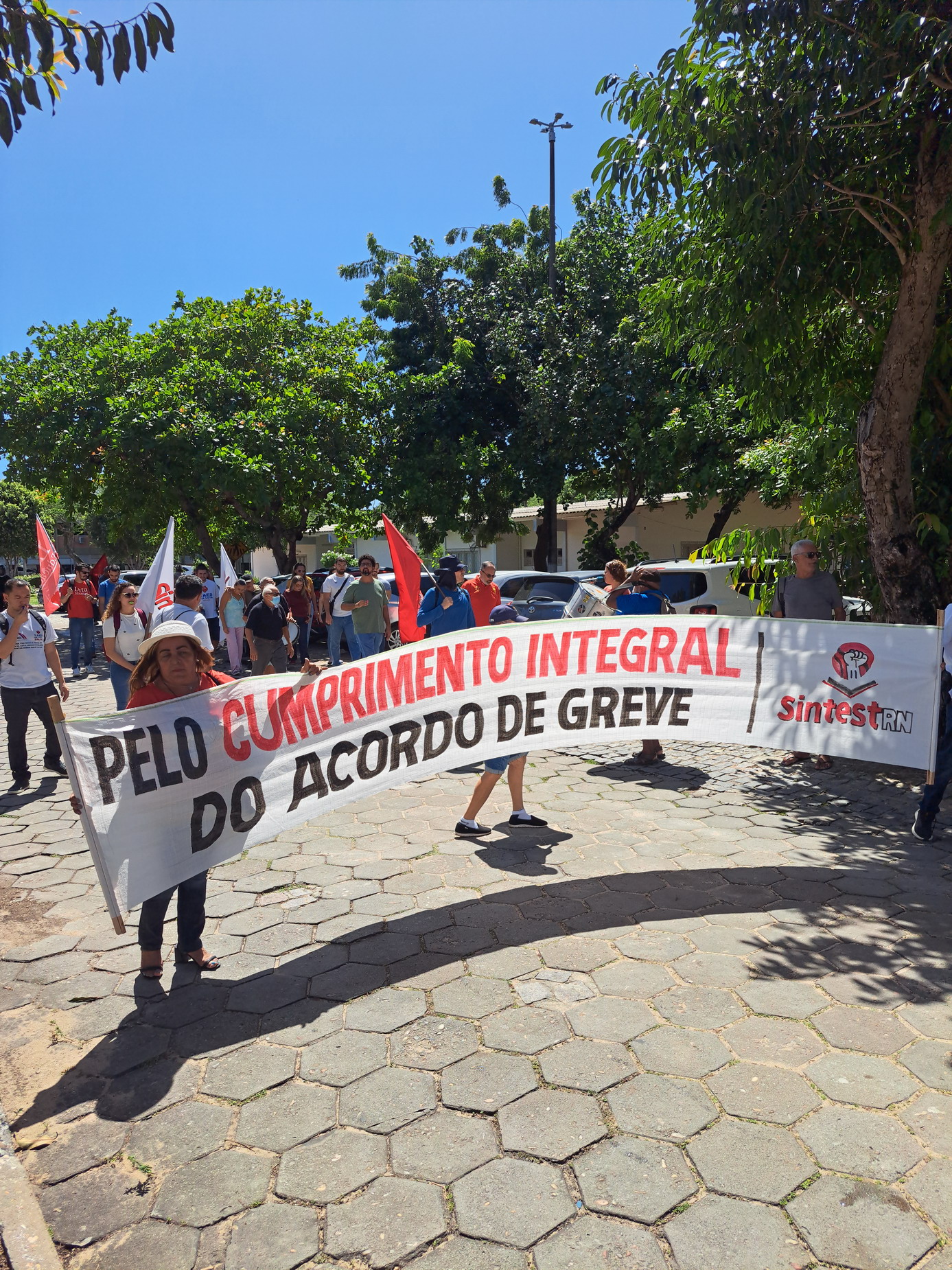 Na manhã desta quinta-feira, 22 de maio, os servidores técnico-administrativos da UFRN realizaram um ato público, com início às 9h, em frente à Reitoria da Universidade. A mobilização foi deliberada na última assembleia do SINTEST-RN, realizada em 19 de maio, e integra a paralisação nacional de 48 horas convocada pela FASUBRA, em defesa do cumprimento integral do acordo de greve.