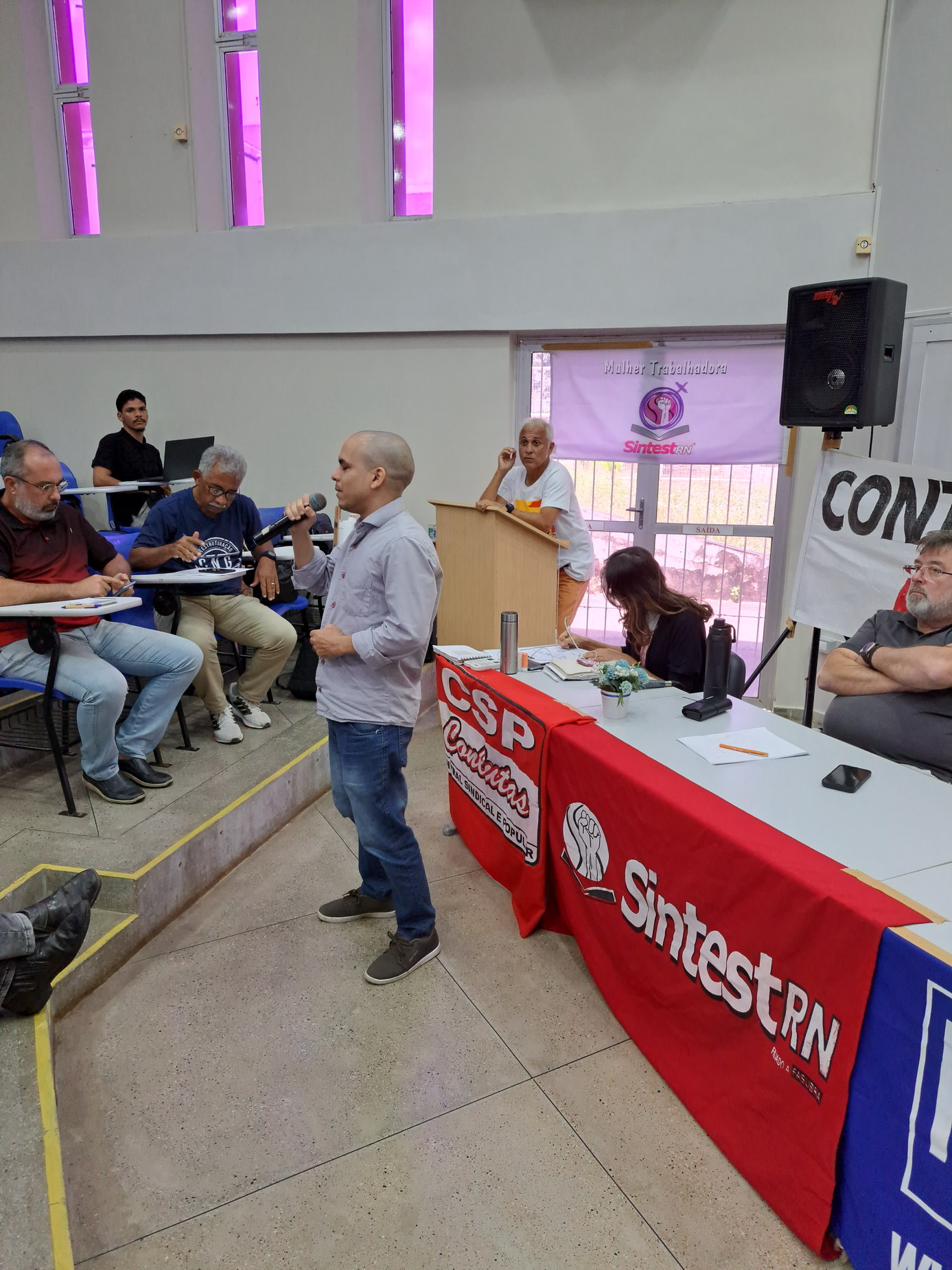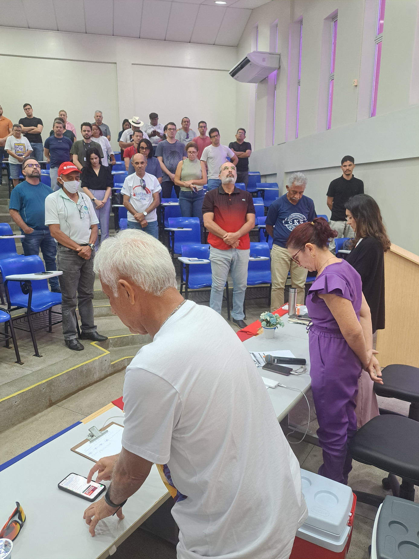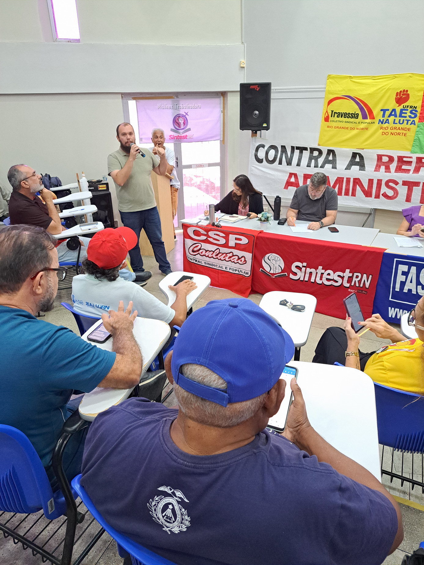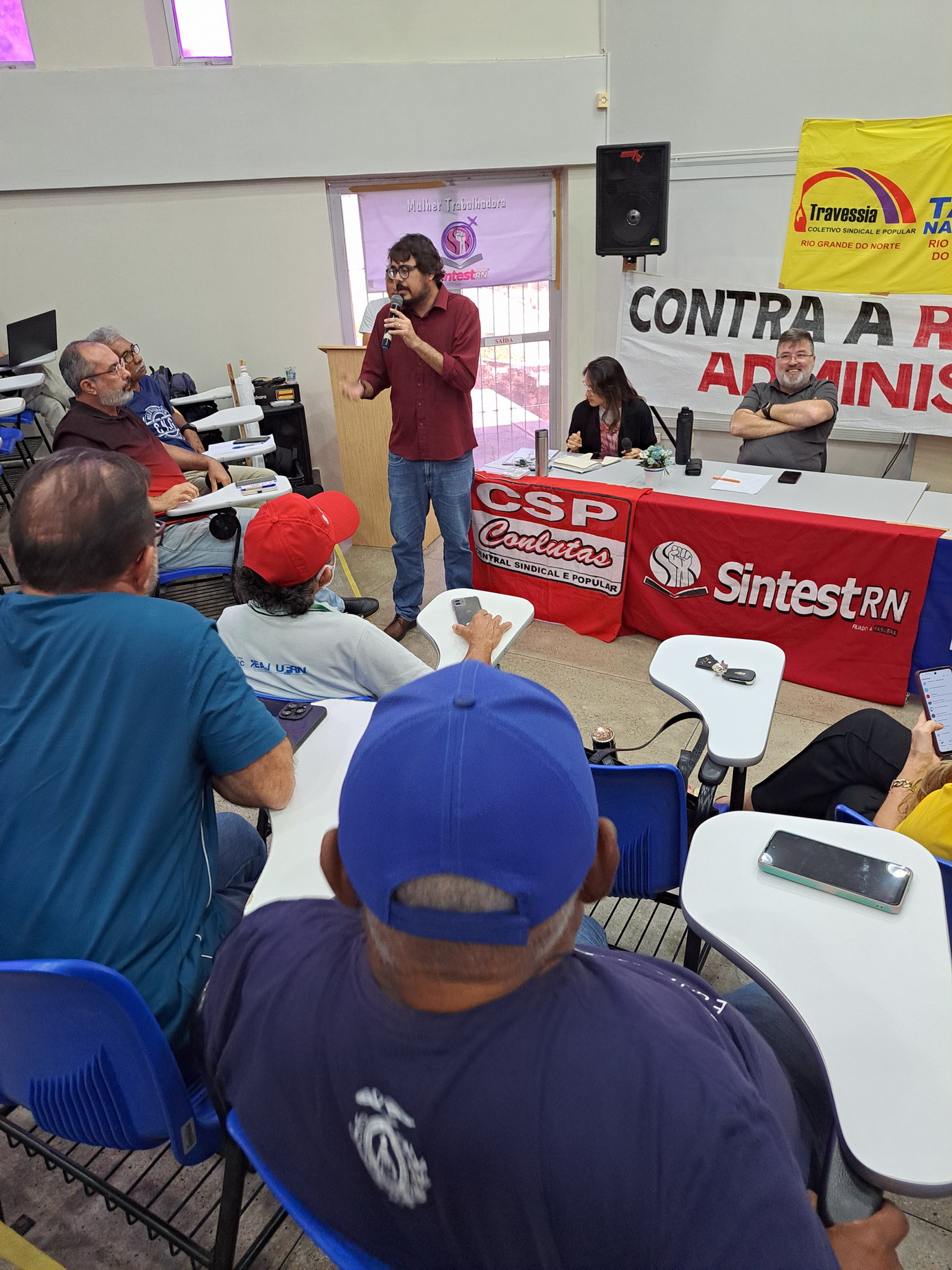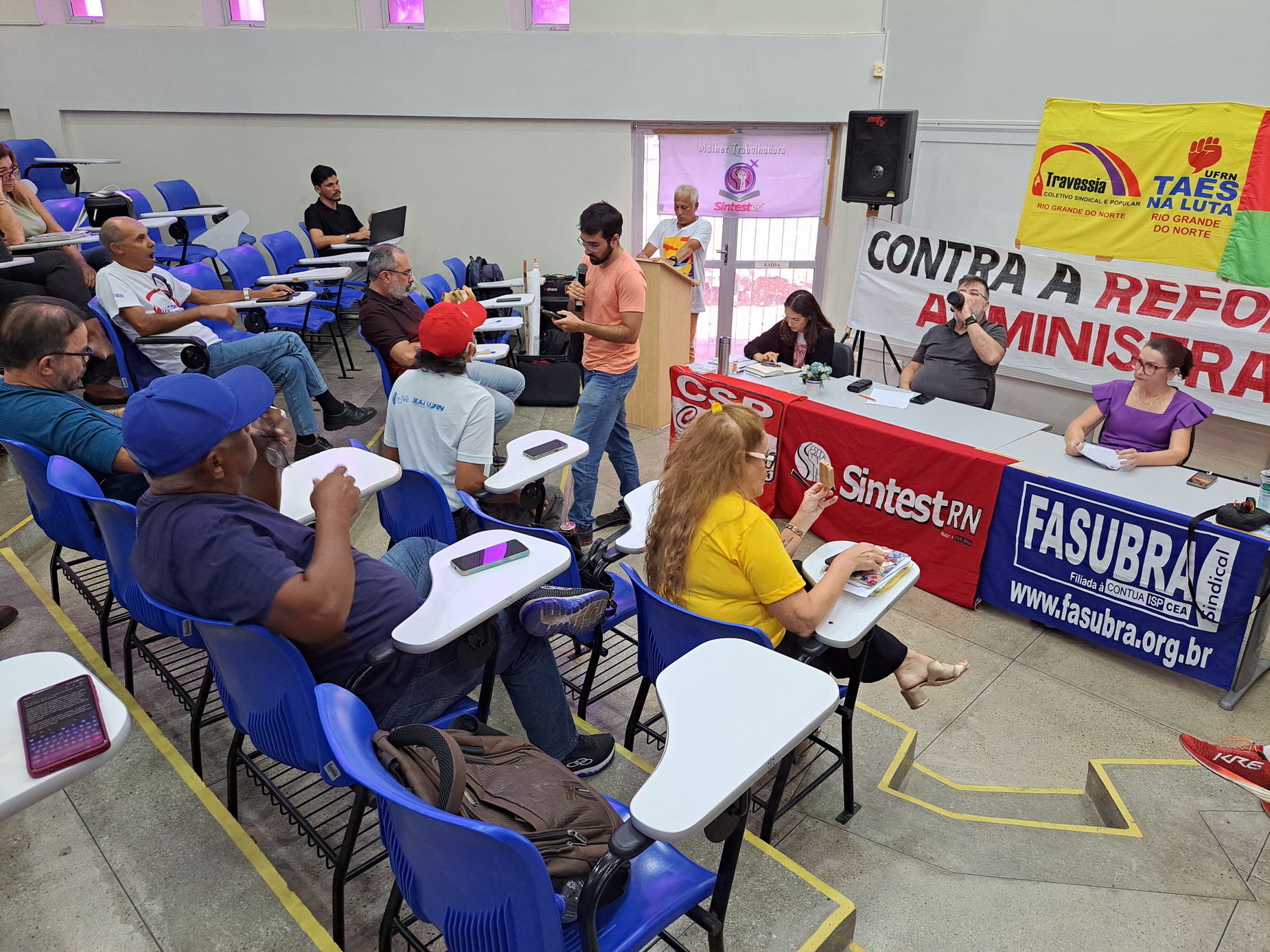 Durante a análise de conjuntura, foram apresentados diversos encaminhamentos. Entre os principais pontos, destacou-se o descumprimento de compromissos assumidos, como a regulamentação do RSC, a implantação da escala 12×60 e a aceleração para aposentados. Também foi ressaltada a necessidade de intensificar a mobilização nas bases e nos setores da UFRN.