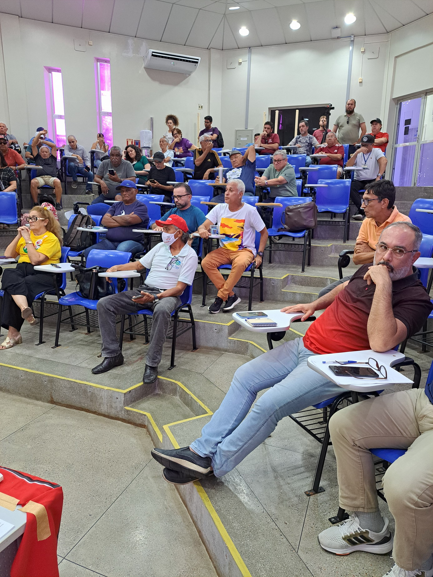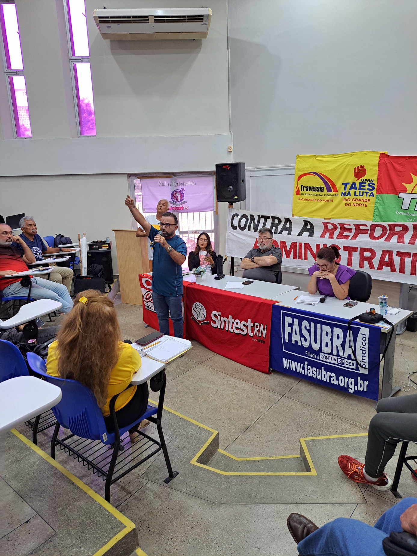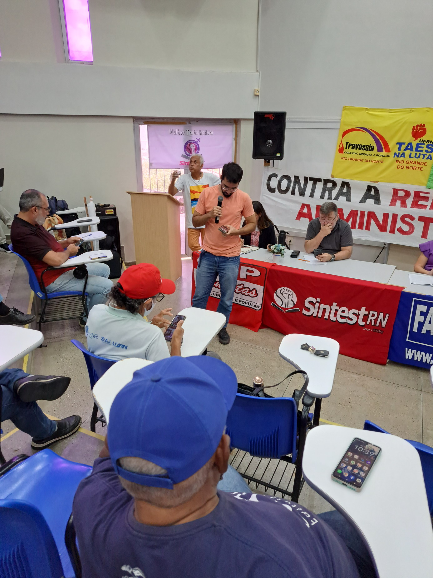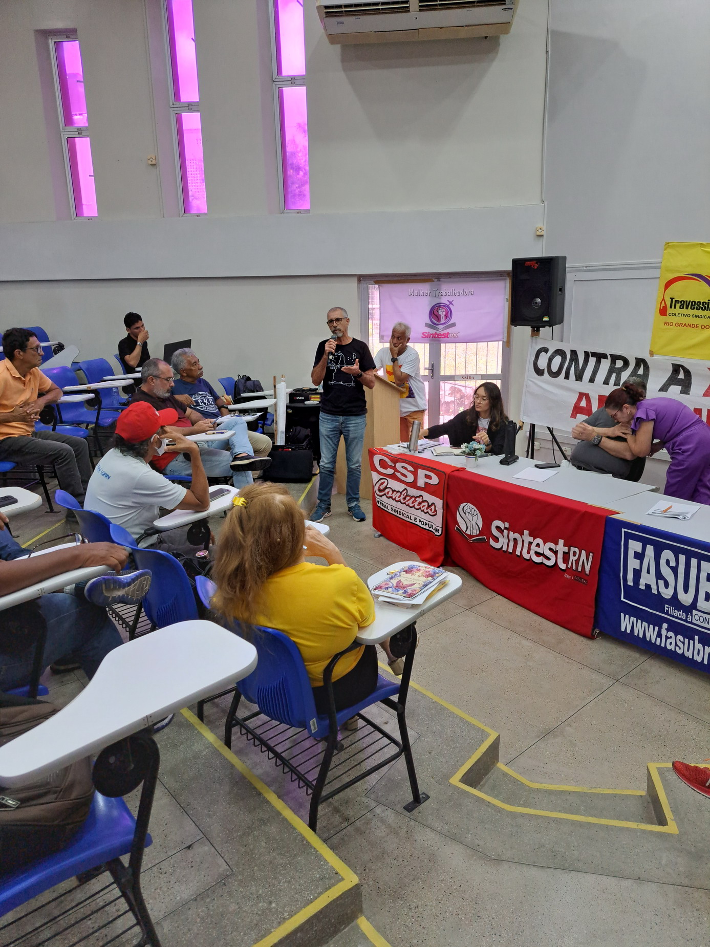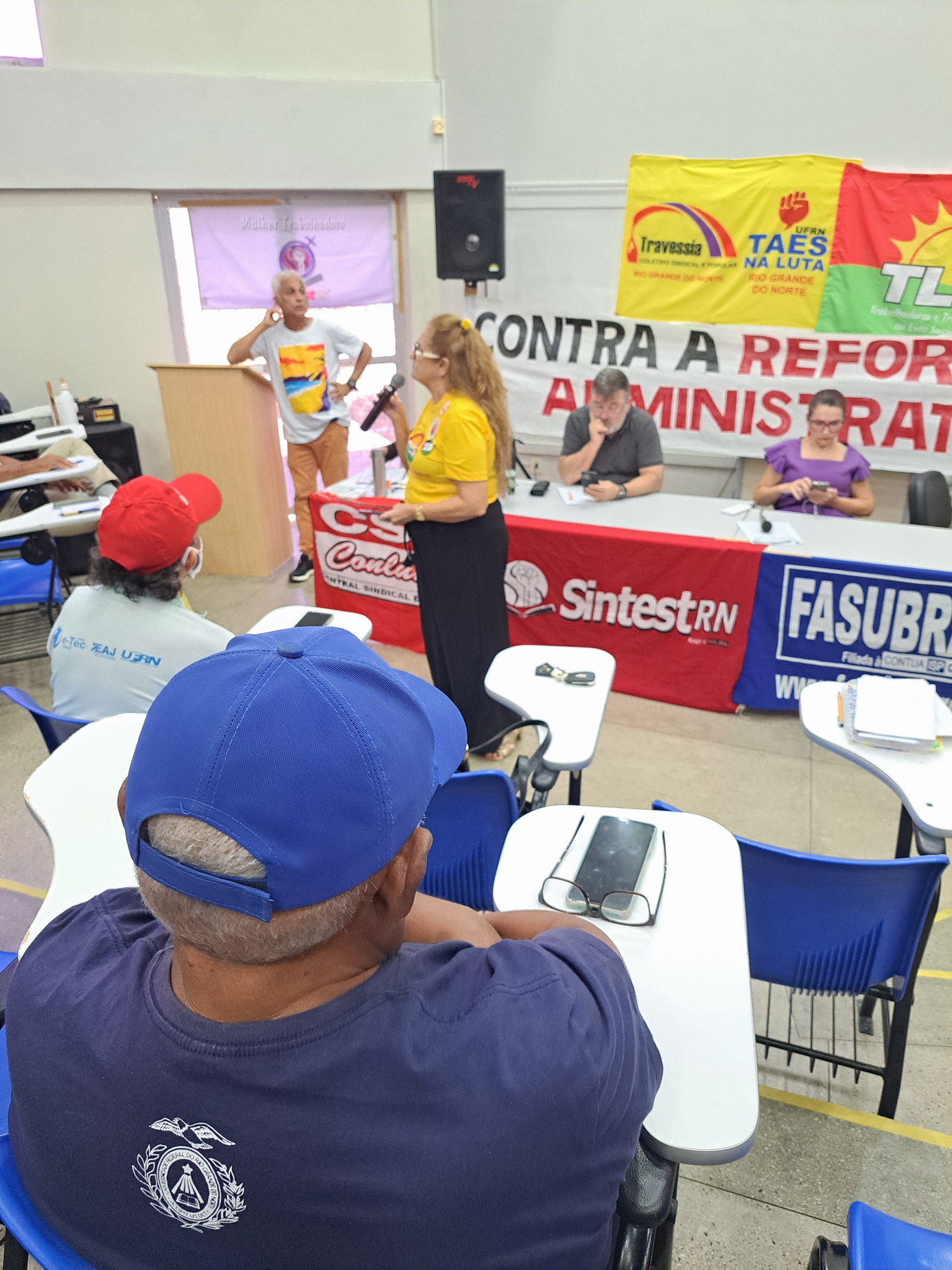 Durante a análise de conjuntura, foram apresentados diversos encaminhamentos. Entre os principais pontos, destacou-se o descumprimento de compromissos assumidos, como a regulamentação do RSC, a implantação da escala 12×60 e a aceleração para aposentados. Também foi ressaltada a necessidade de intensificar a mobilização nas bases e nos setores da UFRN.