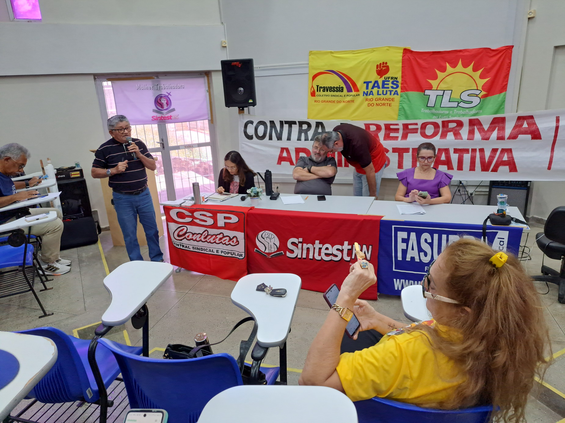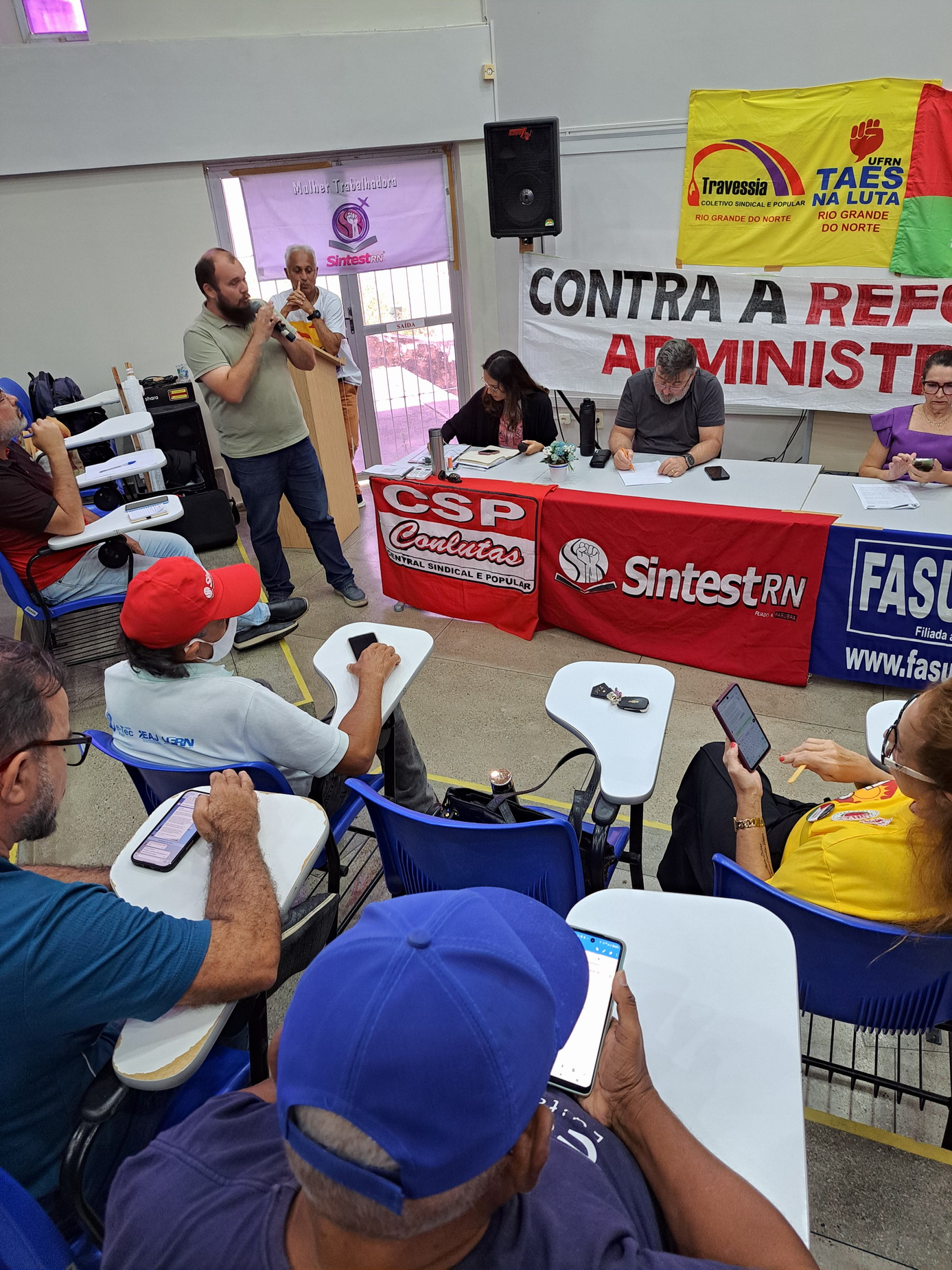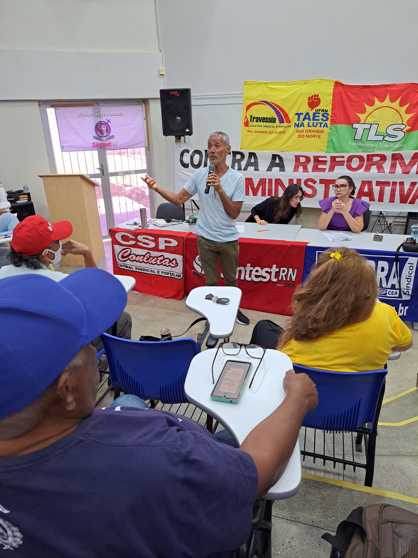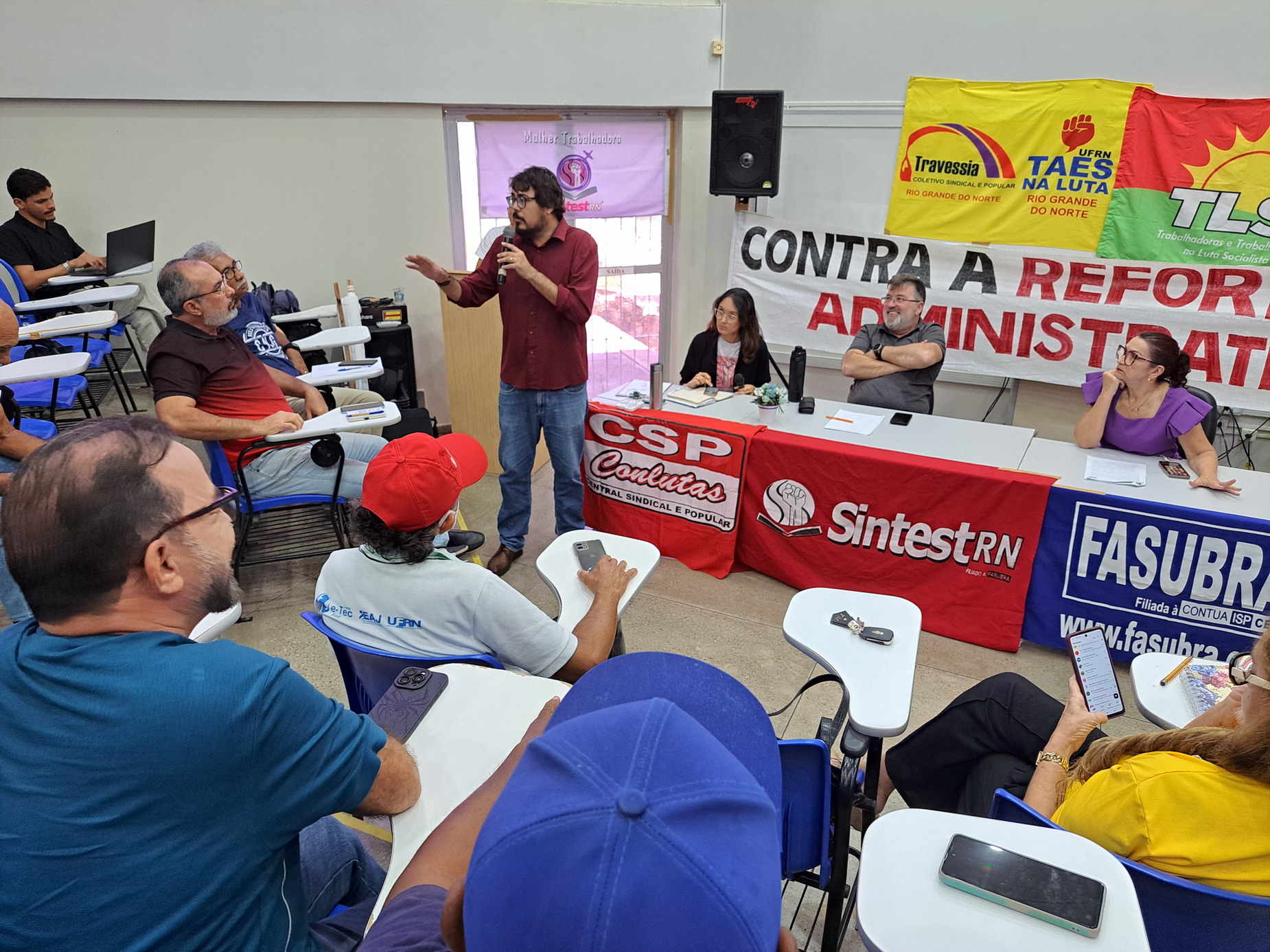 Durante a análise de conjuntura, foram apresentados diversos encaminhamentos. Entre os principais pontos, destacou-se o descumprimento de compromissos assumidos, como a regulamentação do RSC, a implantação da escala 12×60 e a aceleração para aposentados. Também foi ressaltada a necessidade de intensificar a mobilização nas bases e nos setores da UFRN.