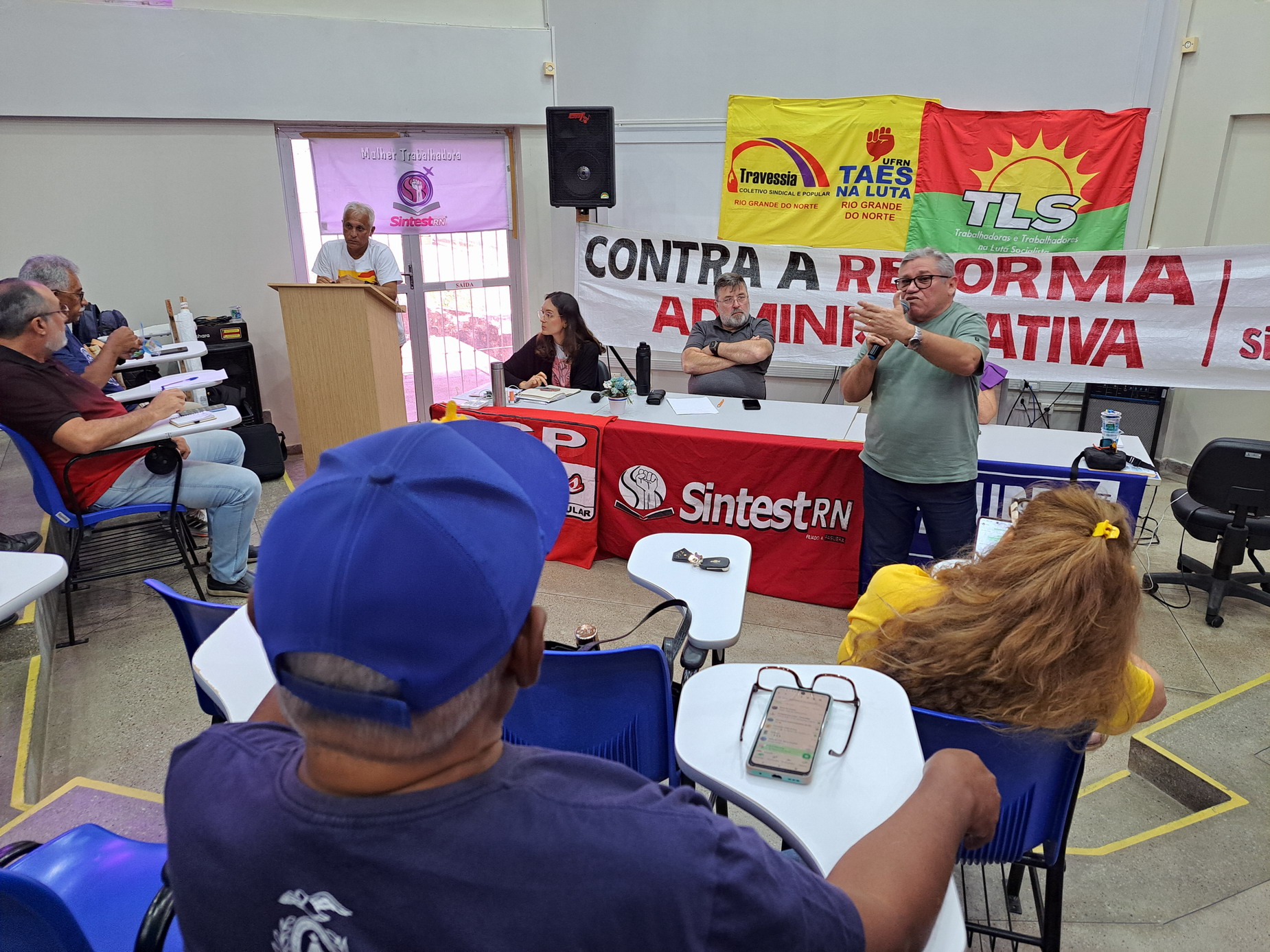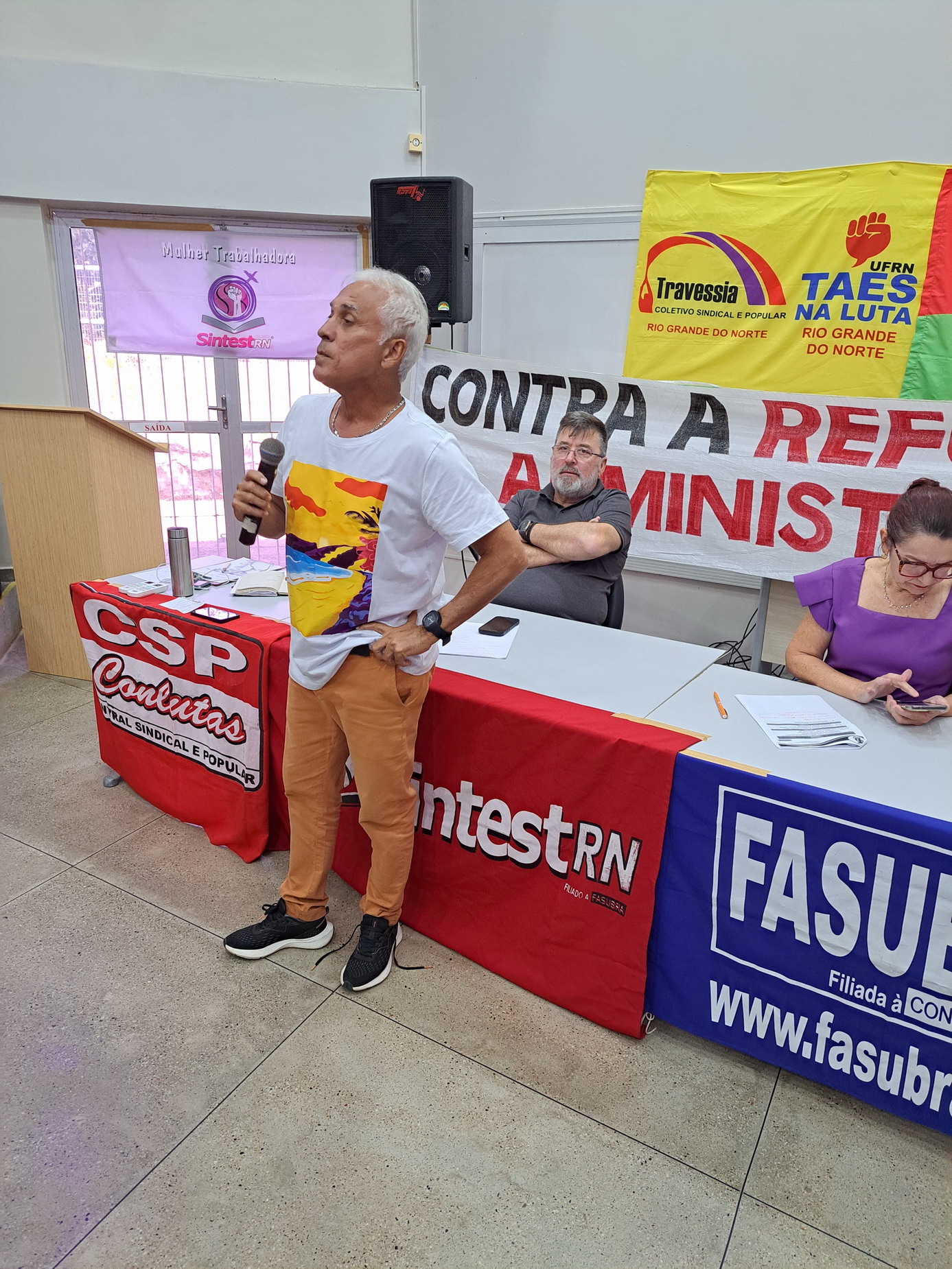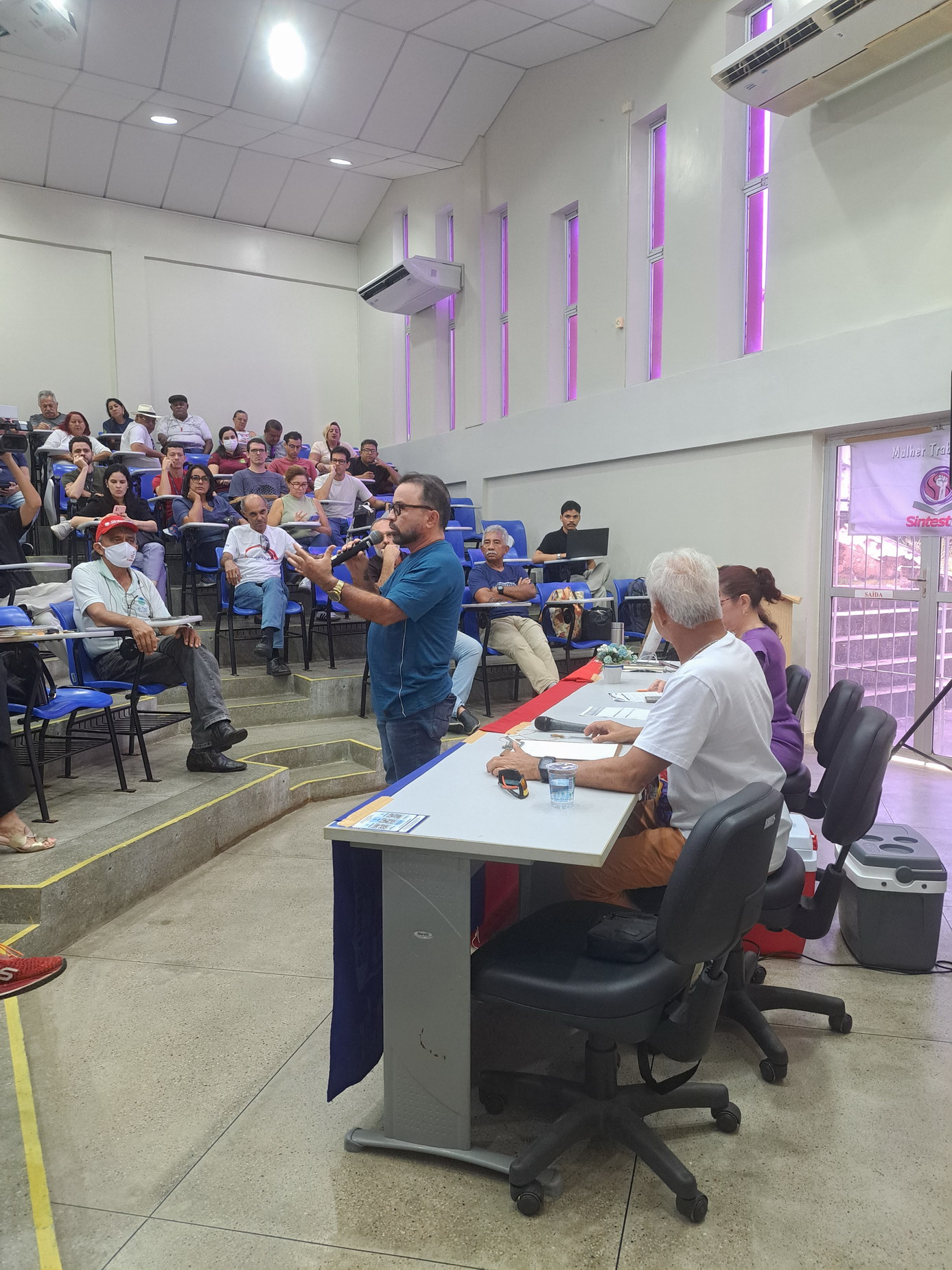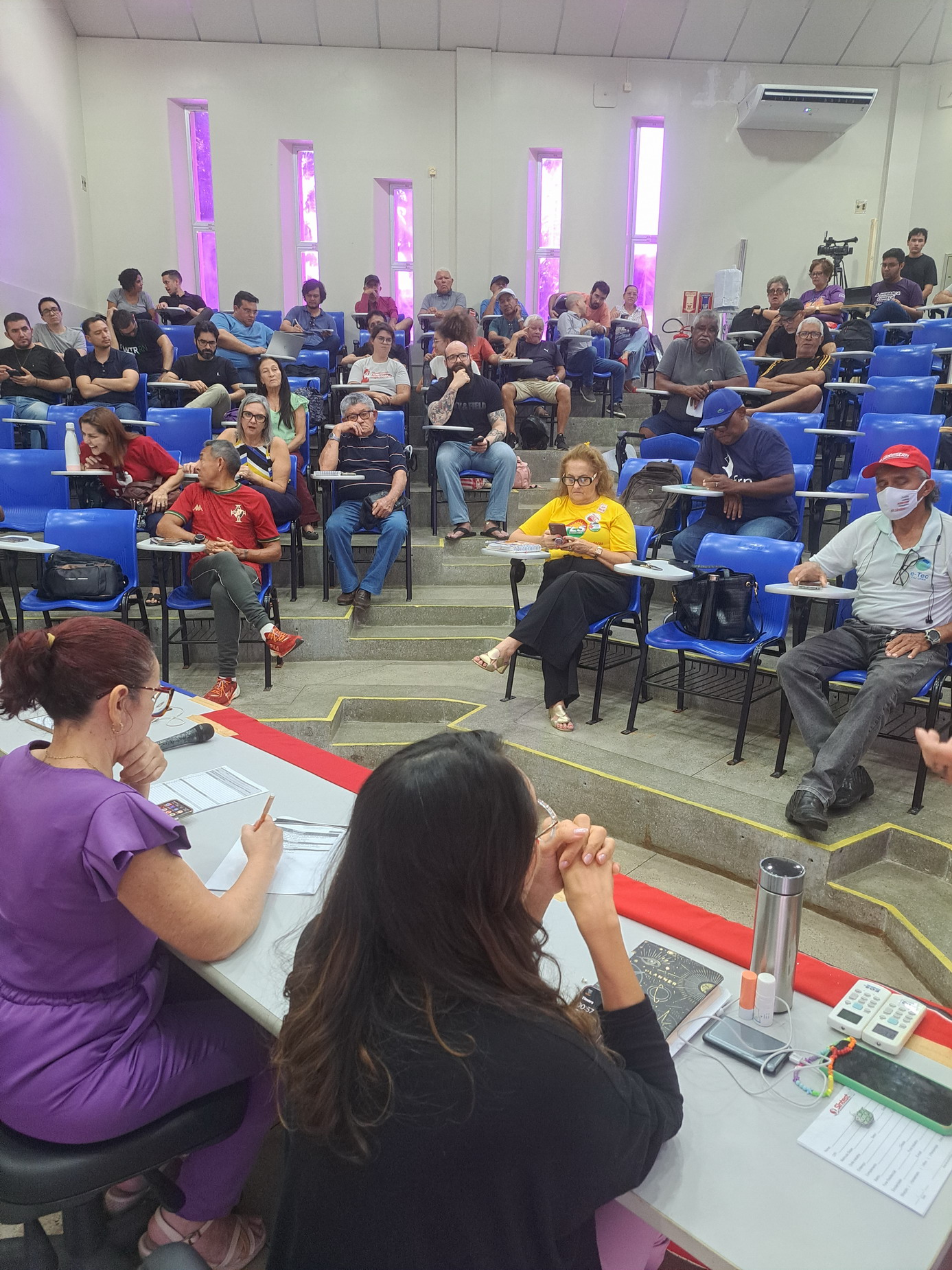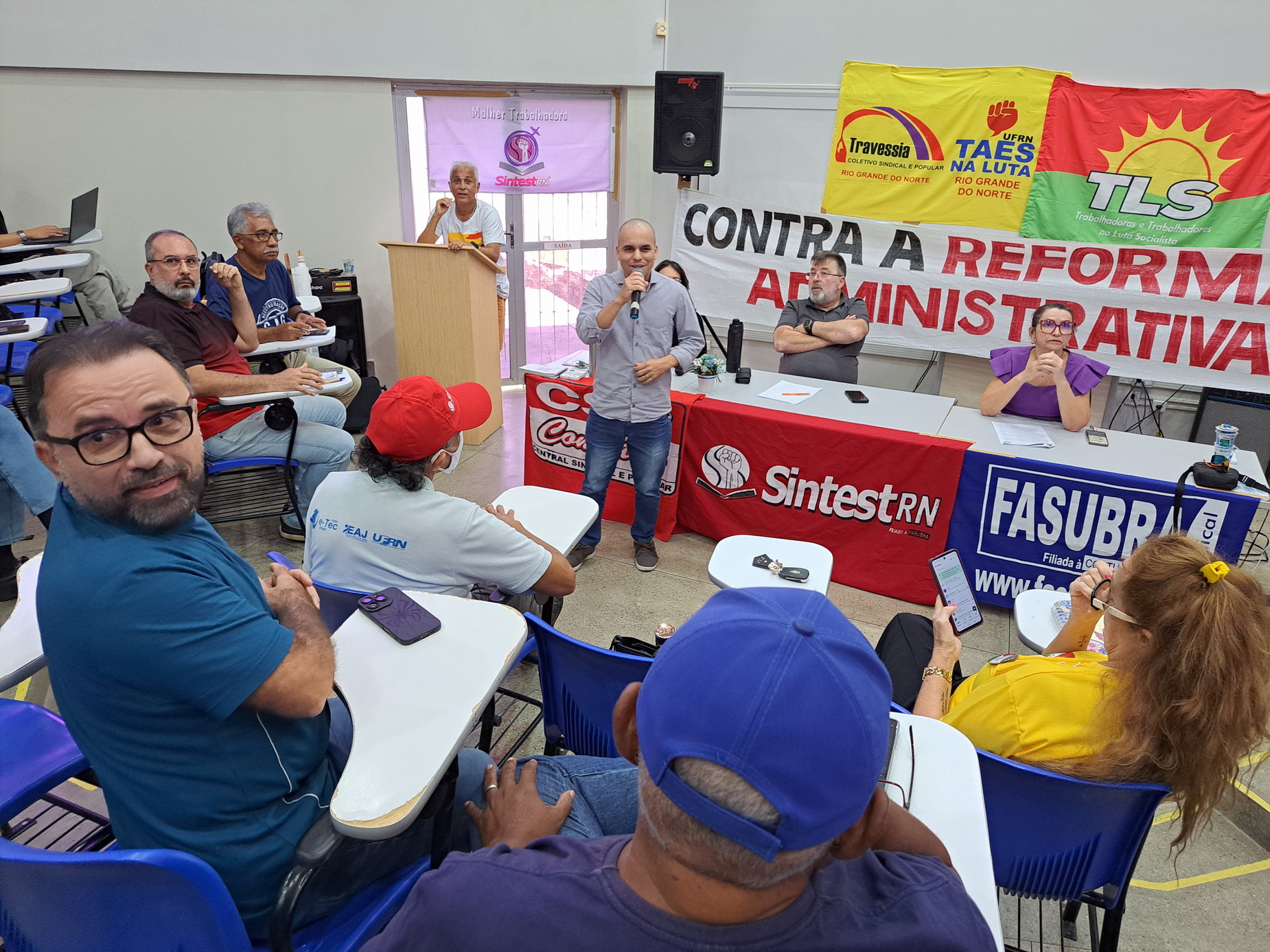 Durante a análise de conjuntura, foram apresentados diversos encaminhamentos. Entre os principais pontos, destacou-se o descumprimento de compromissos assumidos, como a regulamentação do RSC, a implantação da escala 12×60 e a aceleração para aposentados. Também foi ressaltada a necessidade de intensificar a mobilização nas bases e nos setores da UFRN.