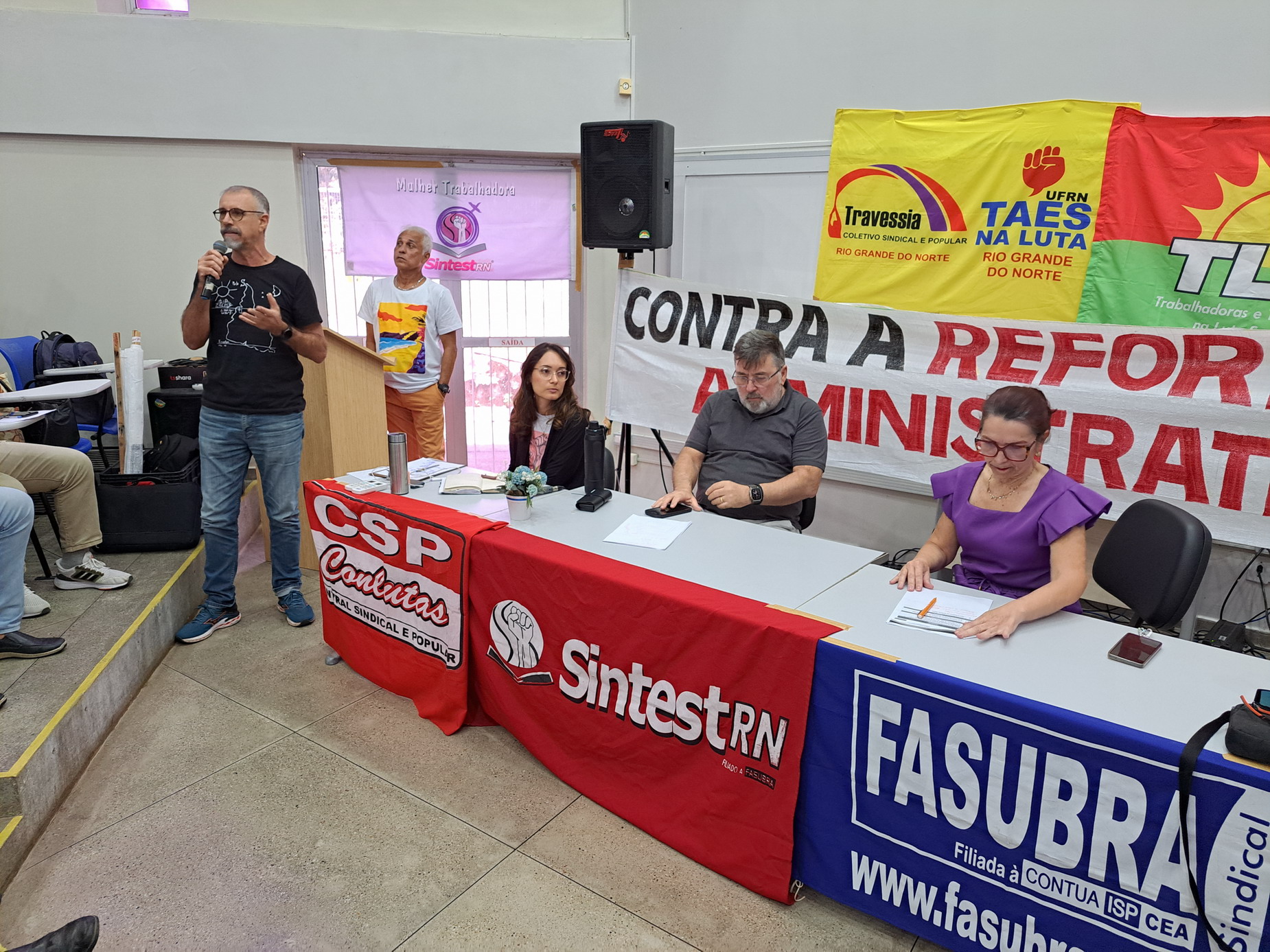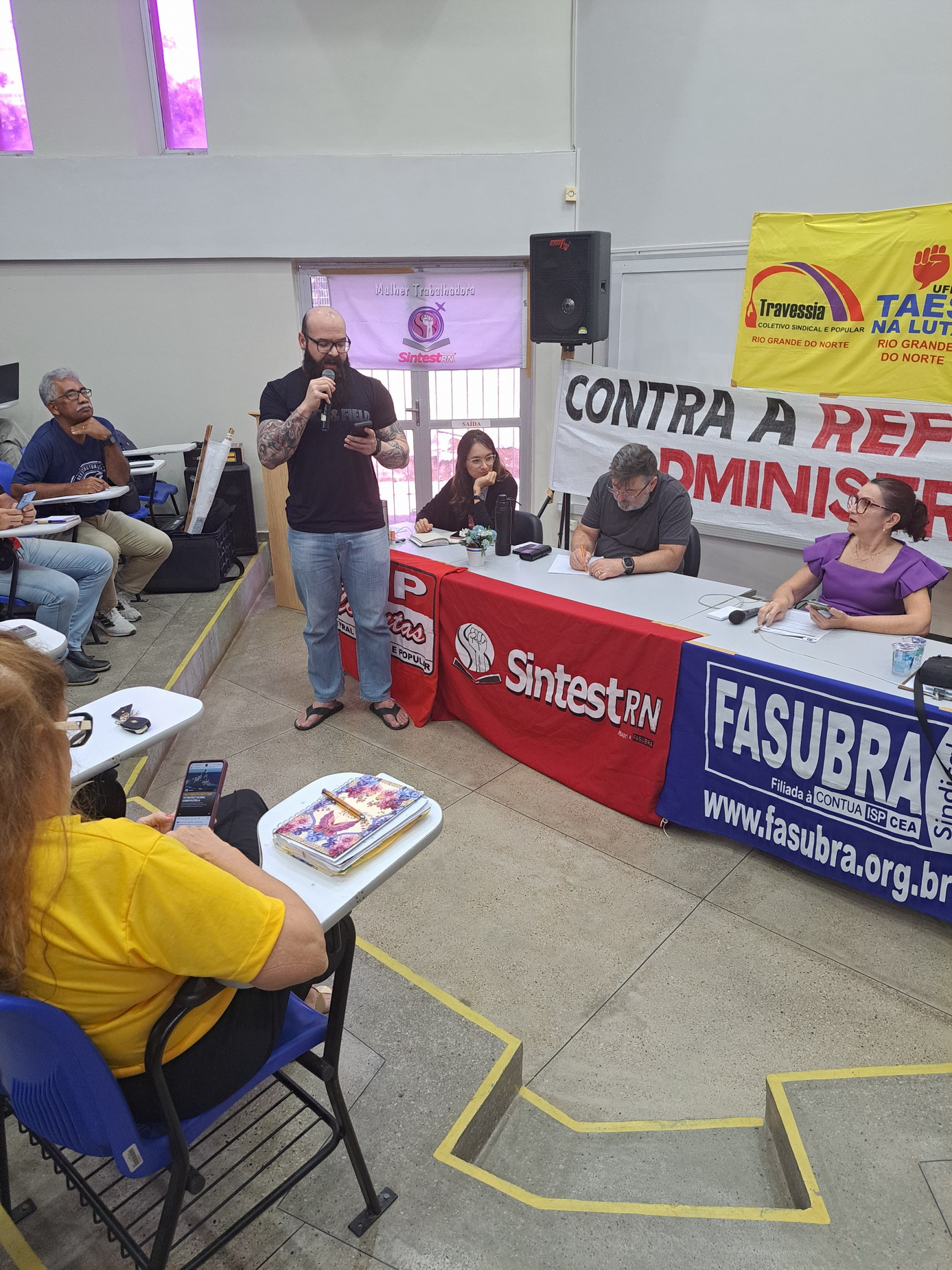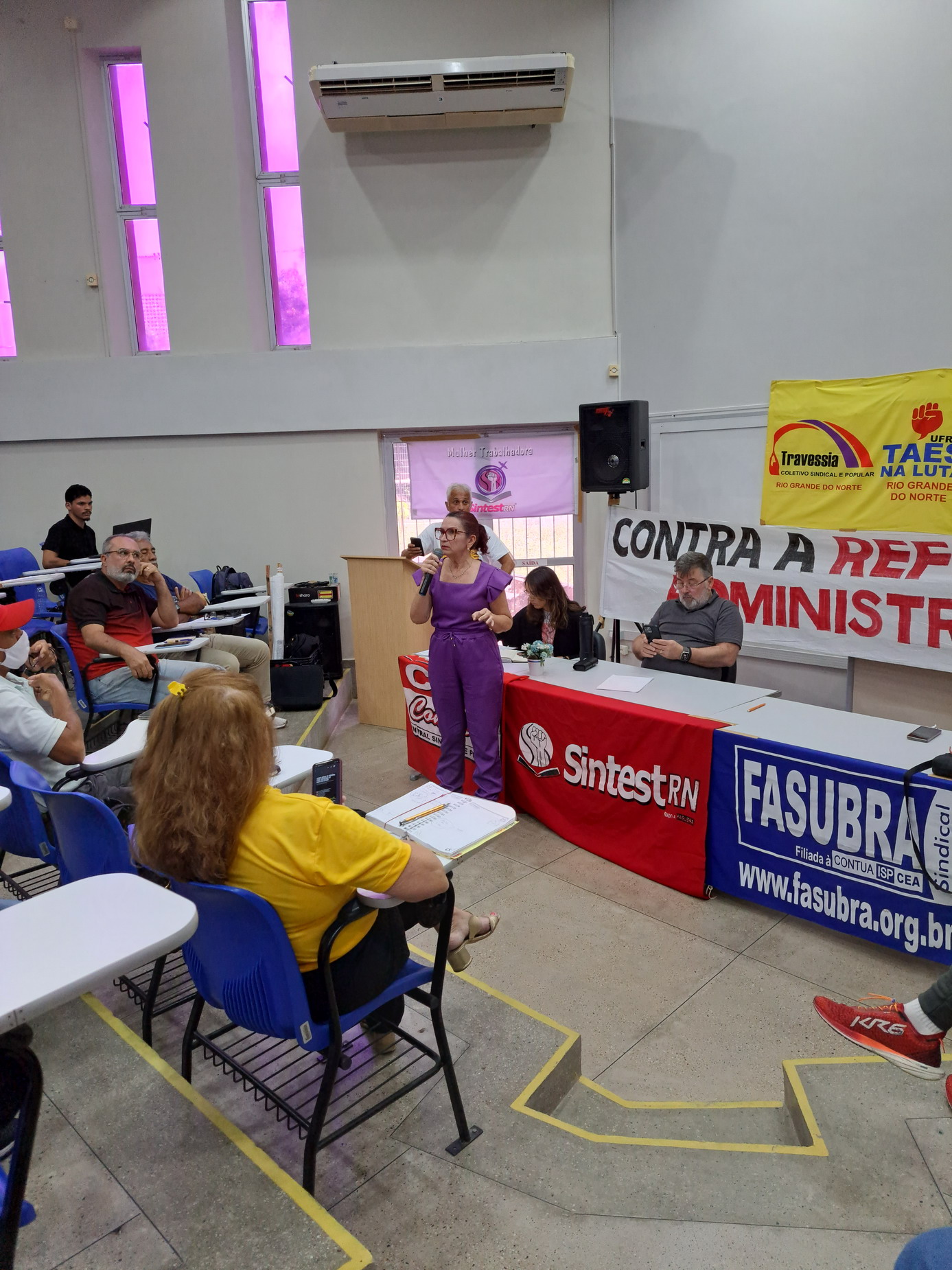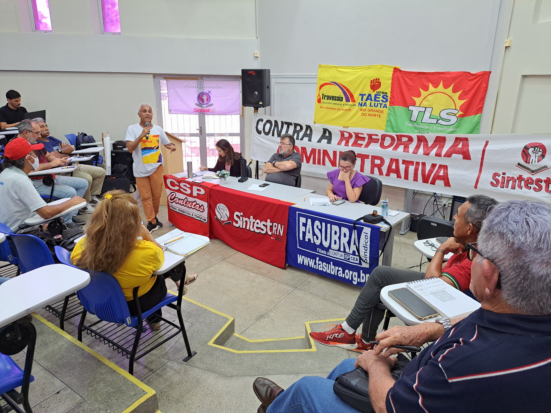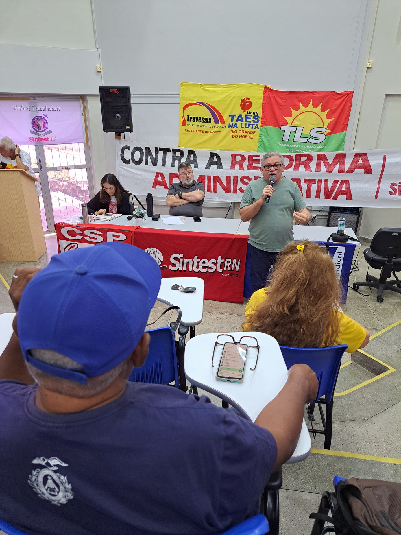 Durante a análise de conjuntura, foram apresentados diversos encaminhamentos. Entre os principais pontos, destacou-se o descumprimento de compromissos assumidos, como a regulamentação do RSC, a implantação da escala 12×60 e a aceleração para aposentados. Também foi ressaltada a necessidade de intensificar a mobilização nas bases e nos setores da UFRN.