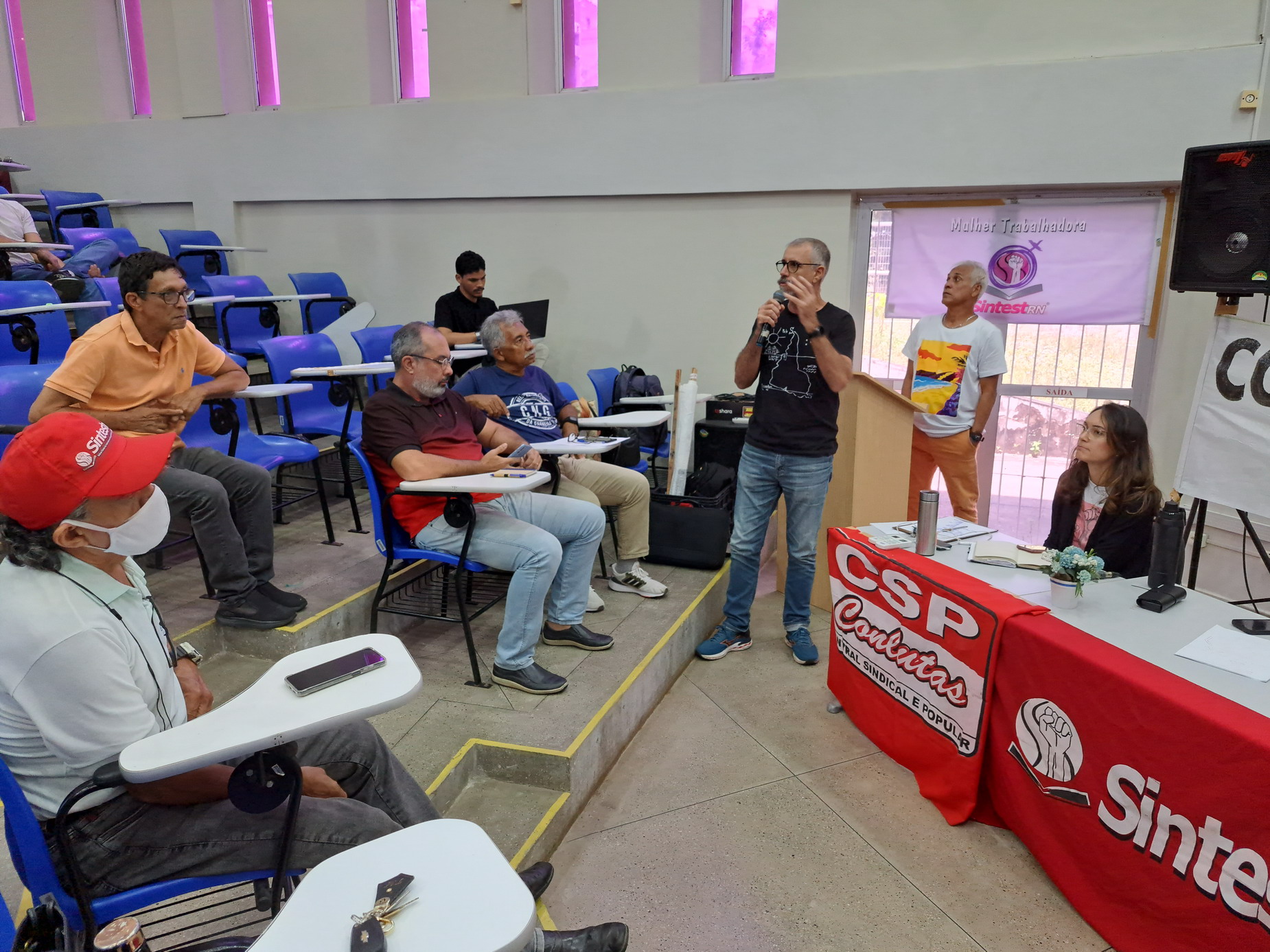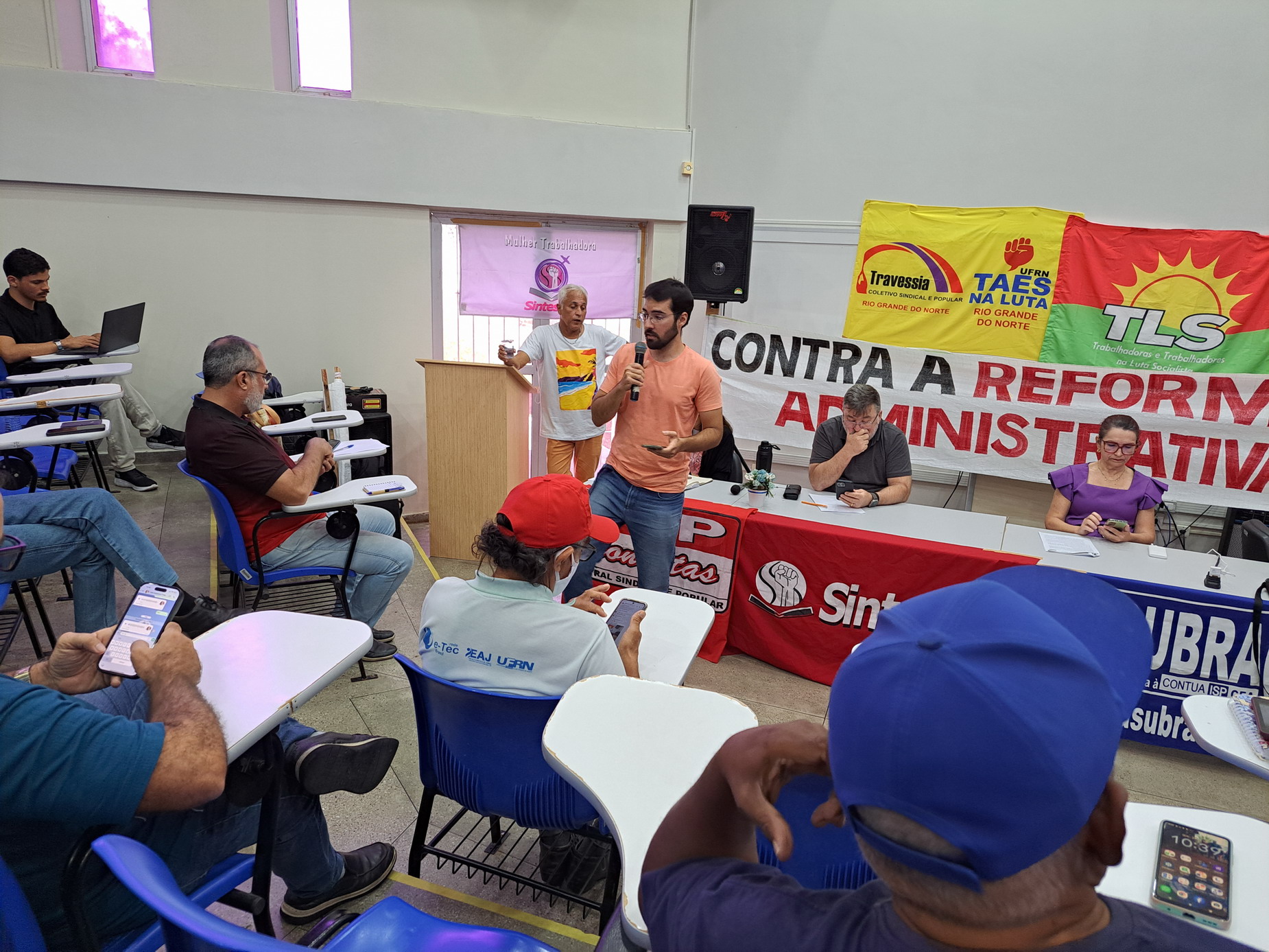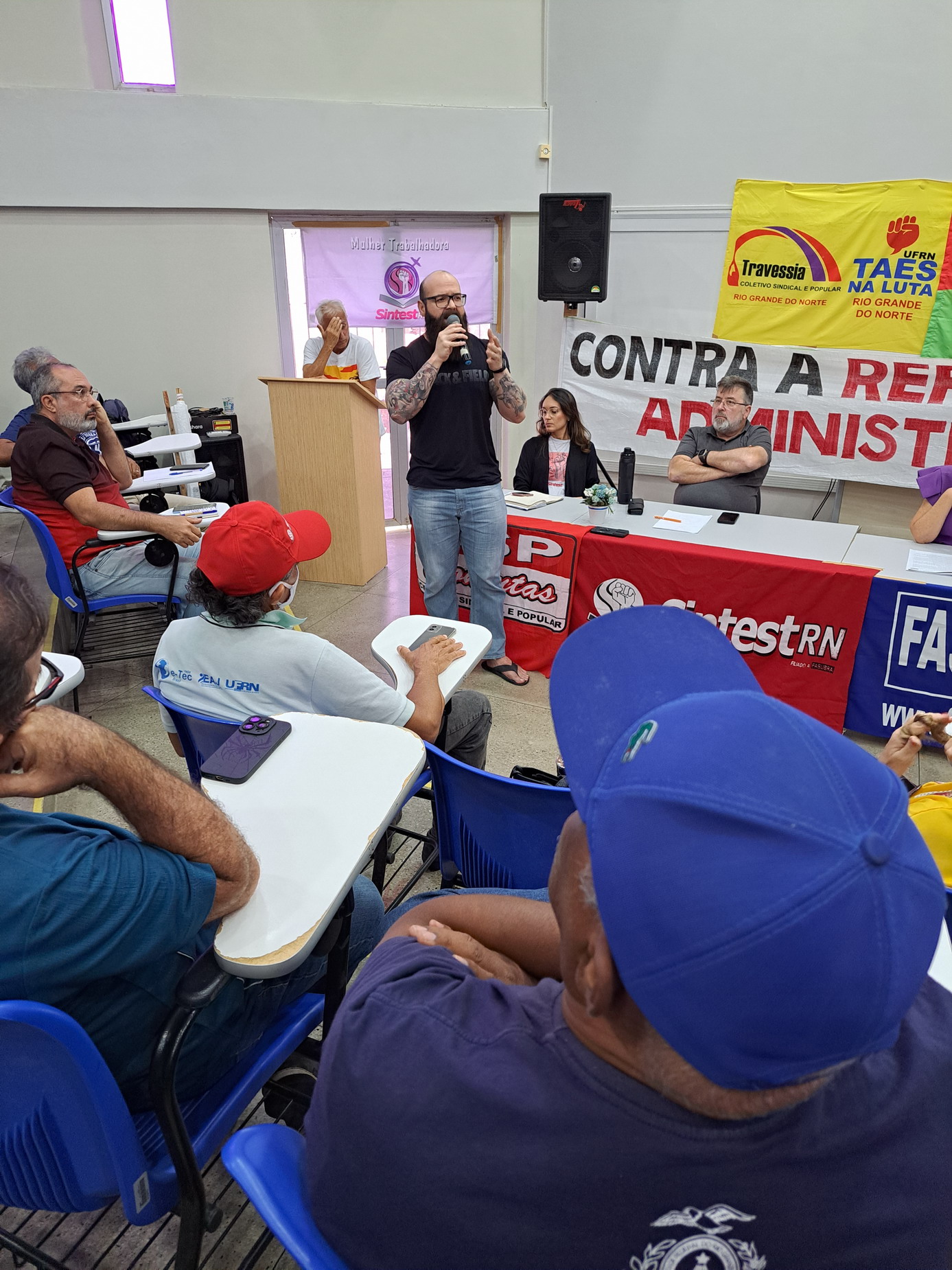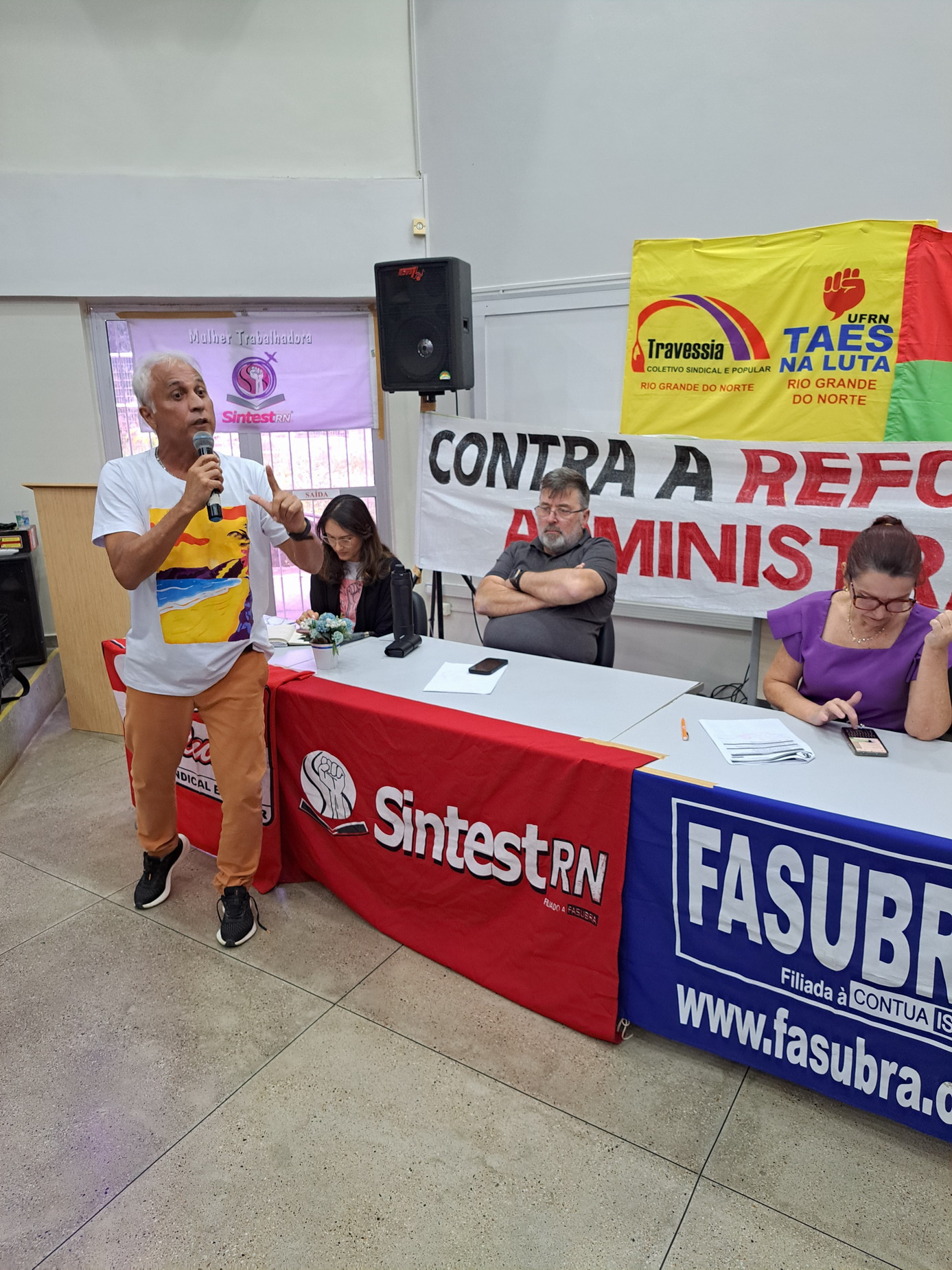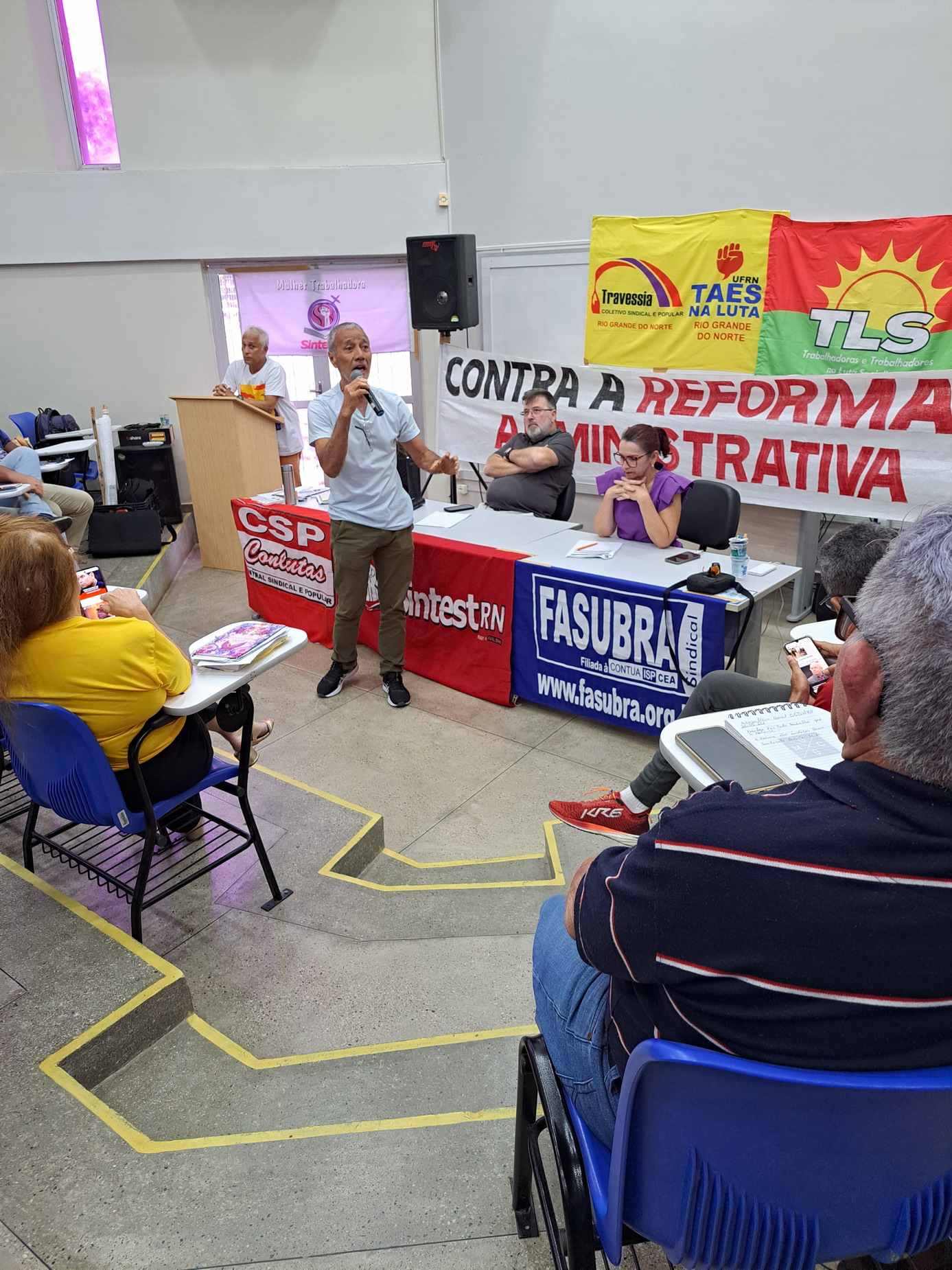 Durante a análise de conjuntura, foram apresentados diversos encaminhamentos. Entre os principais pontos, destacou-se o descumprimento de compromissos assumidos, como a regulamentação do RSC, a implantação da escala 12×60 e a aceleração para aposentados. Também foi ressaltada a necessidade de intensificar a mobilização nas bases e nos setores da UFRN.
