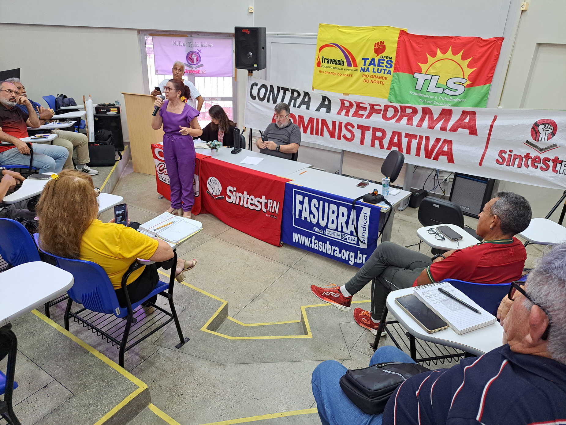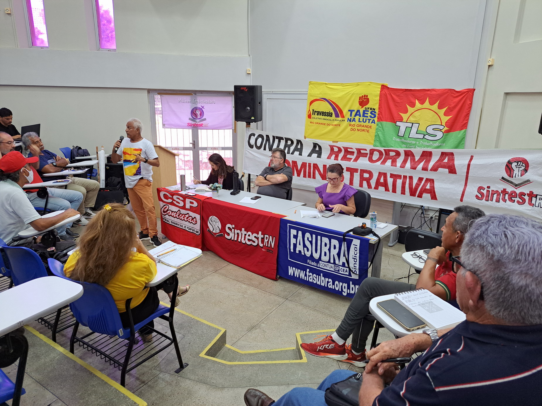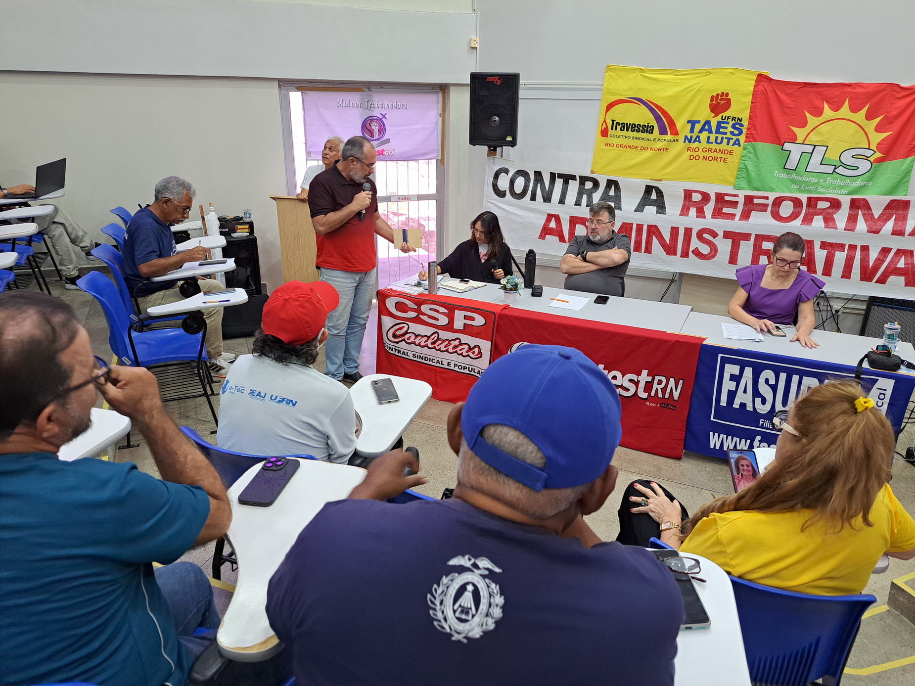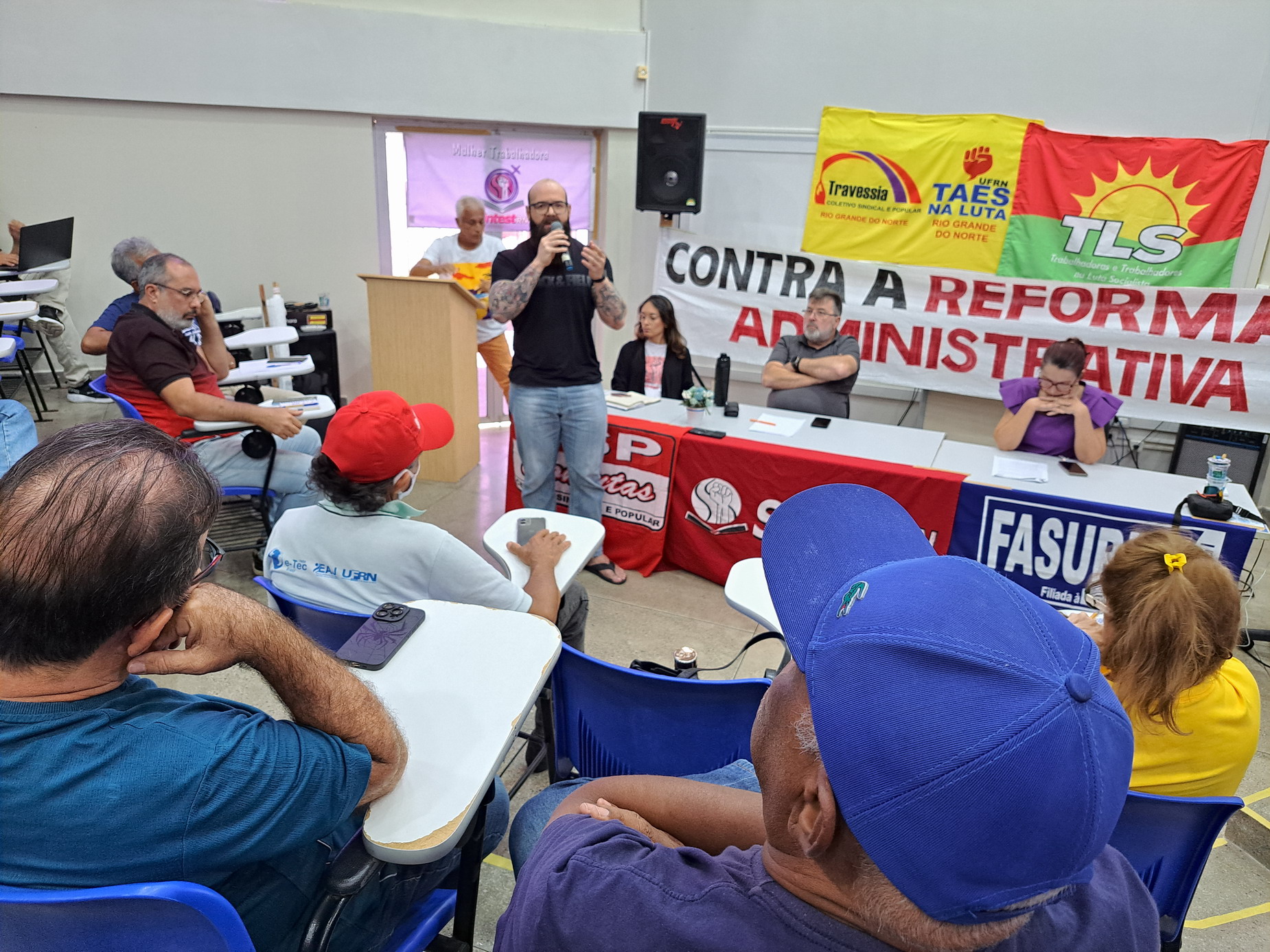 Durante a análise de conjuntura, foram apresentados diversos encaminhamentos. Entre os principais pontos, destacou-se o descumprimento de compromissos assumidos, como a regulamentação do RSC, a implantação da escala 12×60 e a aceleração para aposentados. Também foi ressaltada a necessidade de intensificar a mobilização nas bases e nos setores da UFRN.
