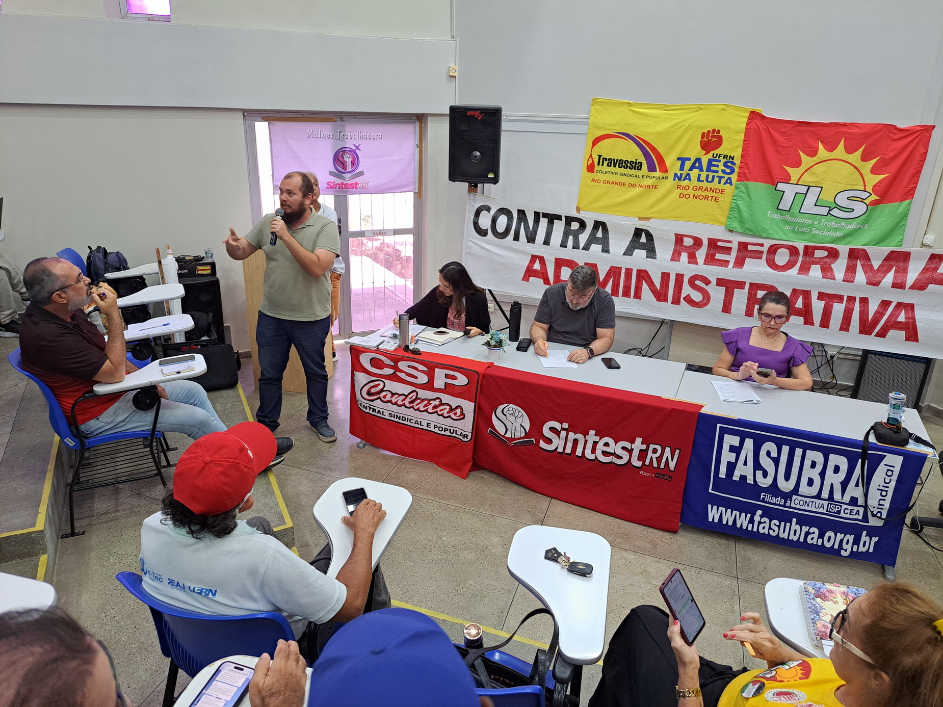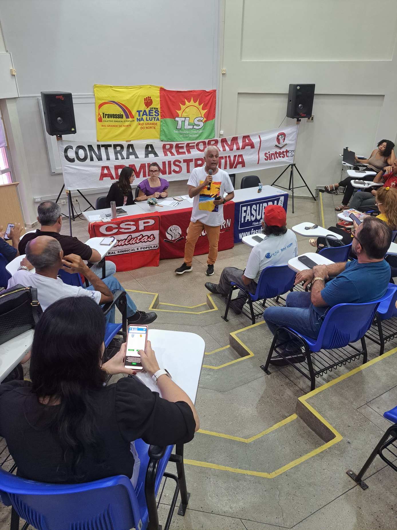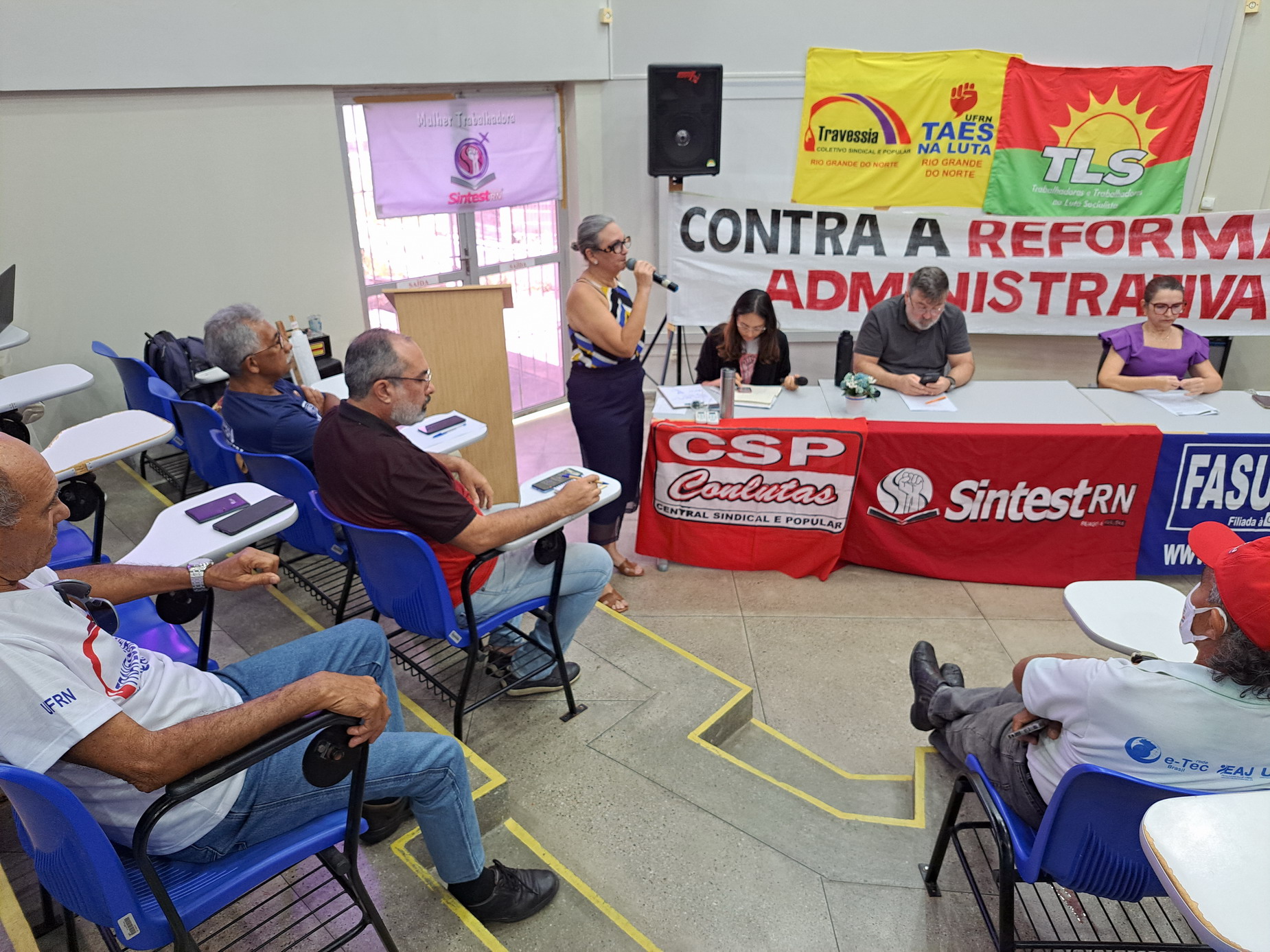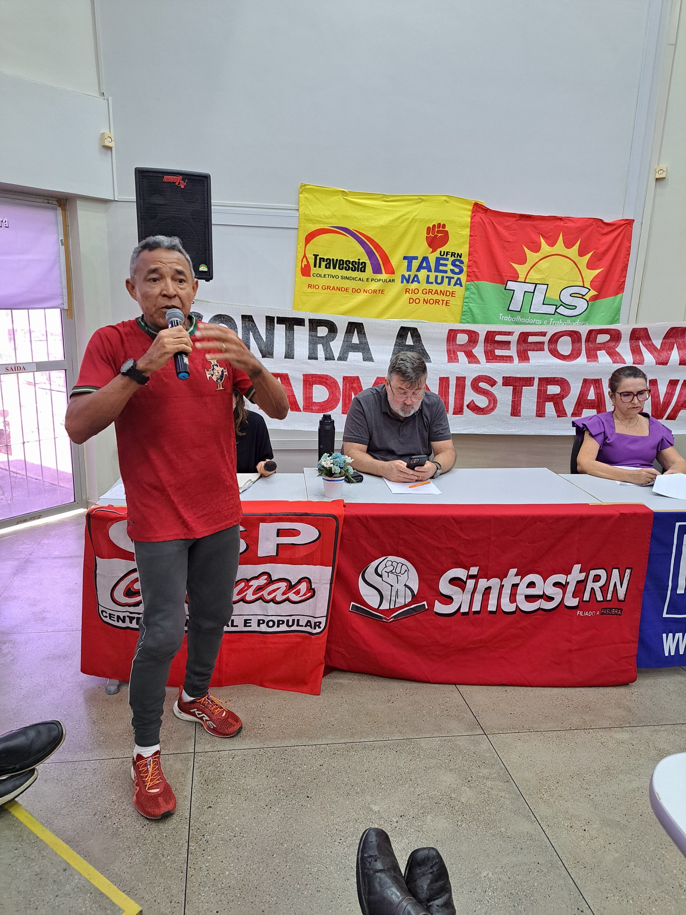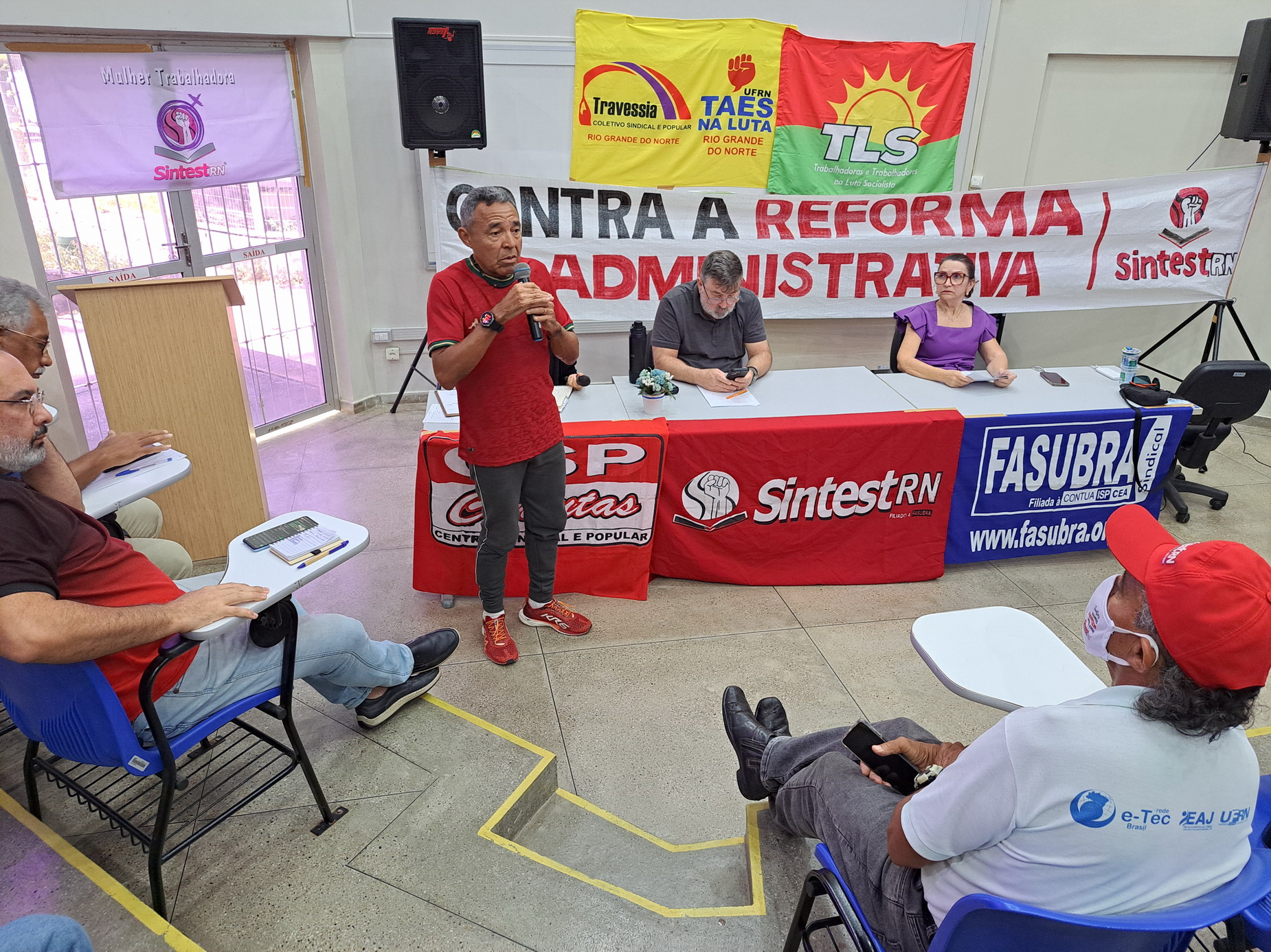 Durante a análise de conjuntura, foram apresentados diversos encaminhamentos. Entre os principais pontos, destacou-se o descumprimento de compromissos assumidos, como a regulamentação do RSC, a implantação da escala 12×60 e a aceleração para aposentados. Também foi ressaltada a necessidade de intensificar a mobilização nas bases e nos setores da UFRN.