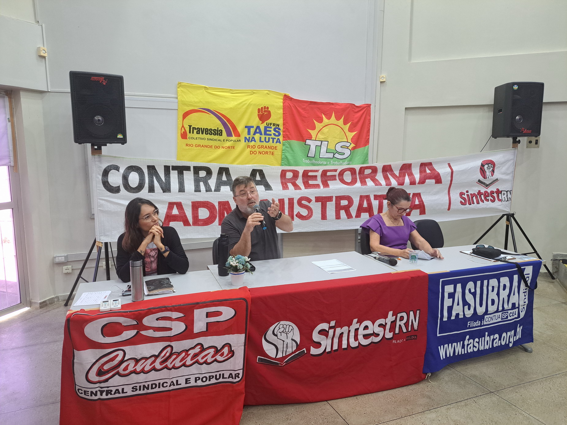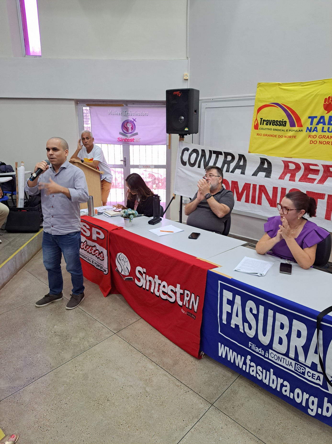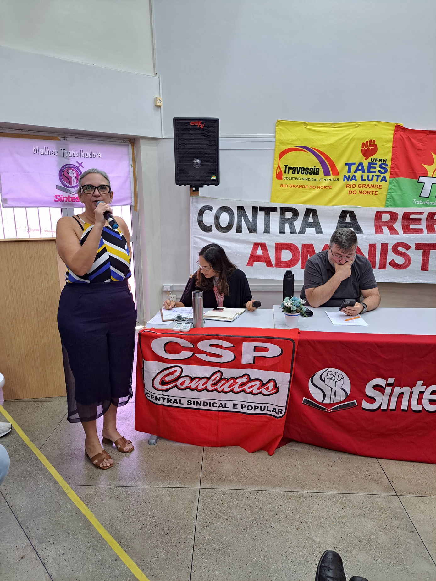 Na manhã desta quarta-feira (24), o SINTEST-RN realizou Assembleia Geral no Anfiteatro B do CCET/UFRN para debater a conjuntura nacional e avaliar a possibilidade de deflagração de uma nova greve dos técnico-administrativos da UFRN. A mesa foi composta por Celita Pessoa (coordenadora geral), Érika Galvão (coordenadora de administração e patrimônio), Roberto Silva (coordenador de políticas sociais) e Carlos Alberto Marques (assessor jurídico da entidade).