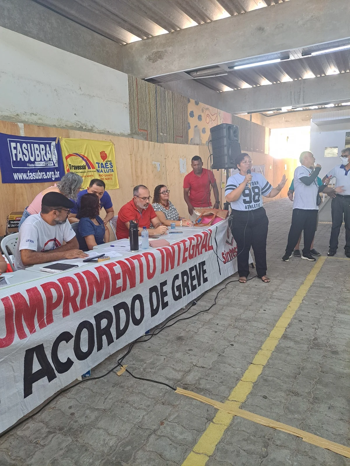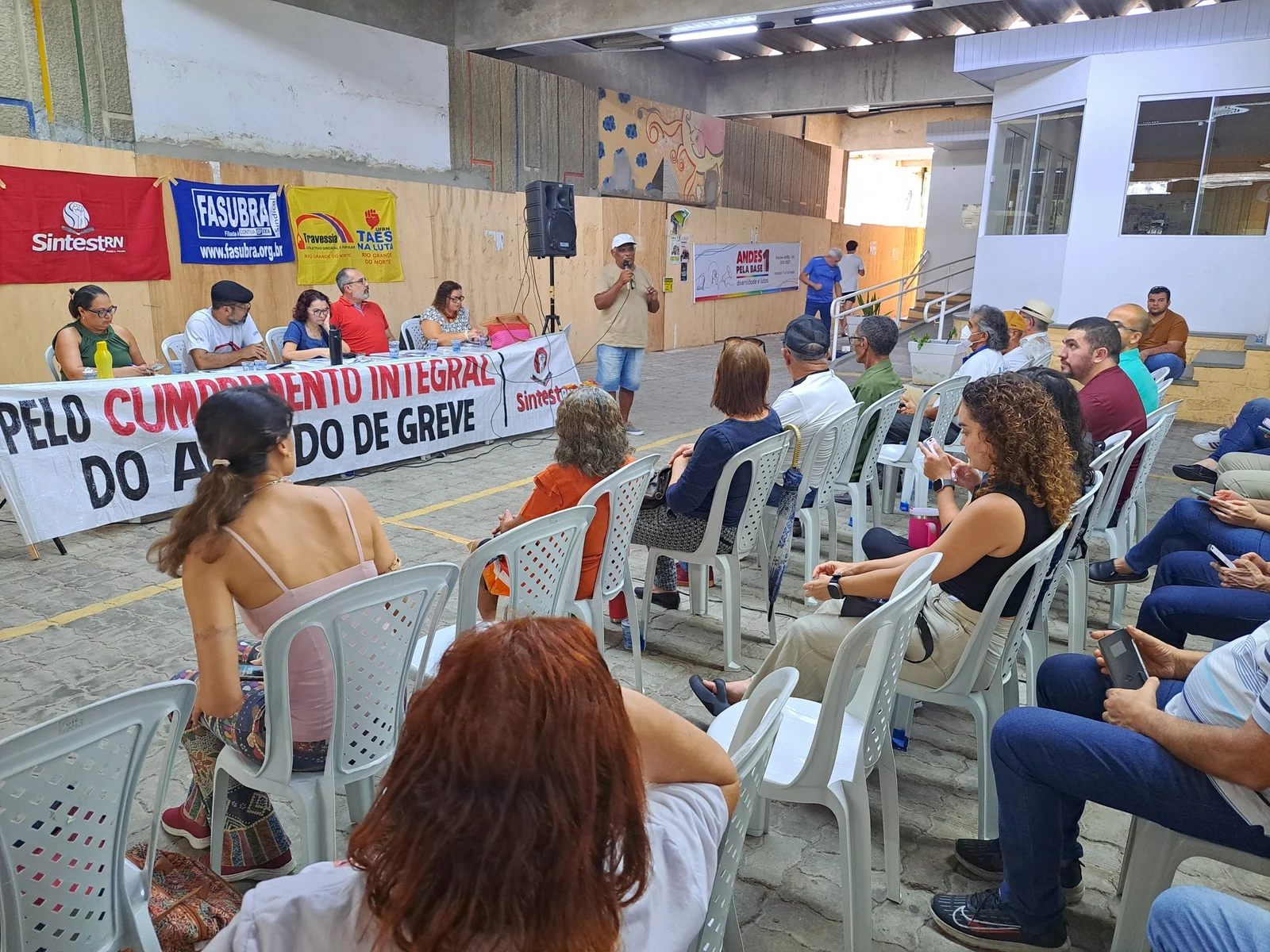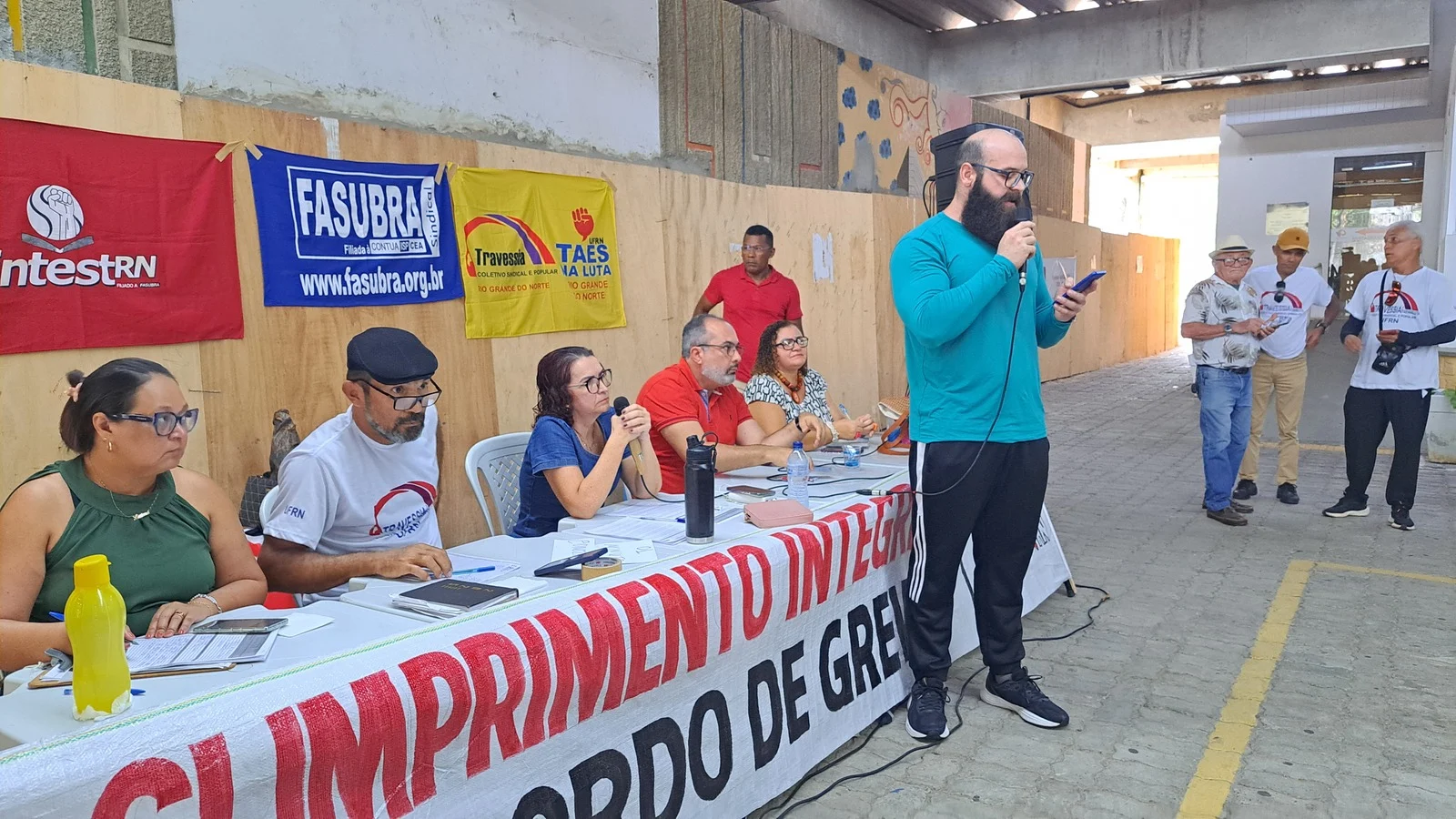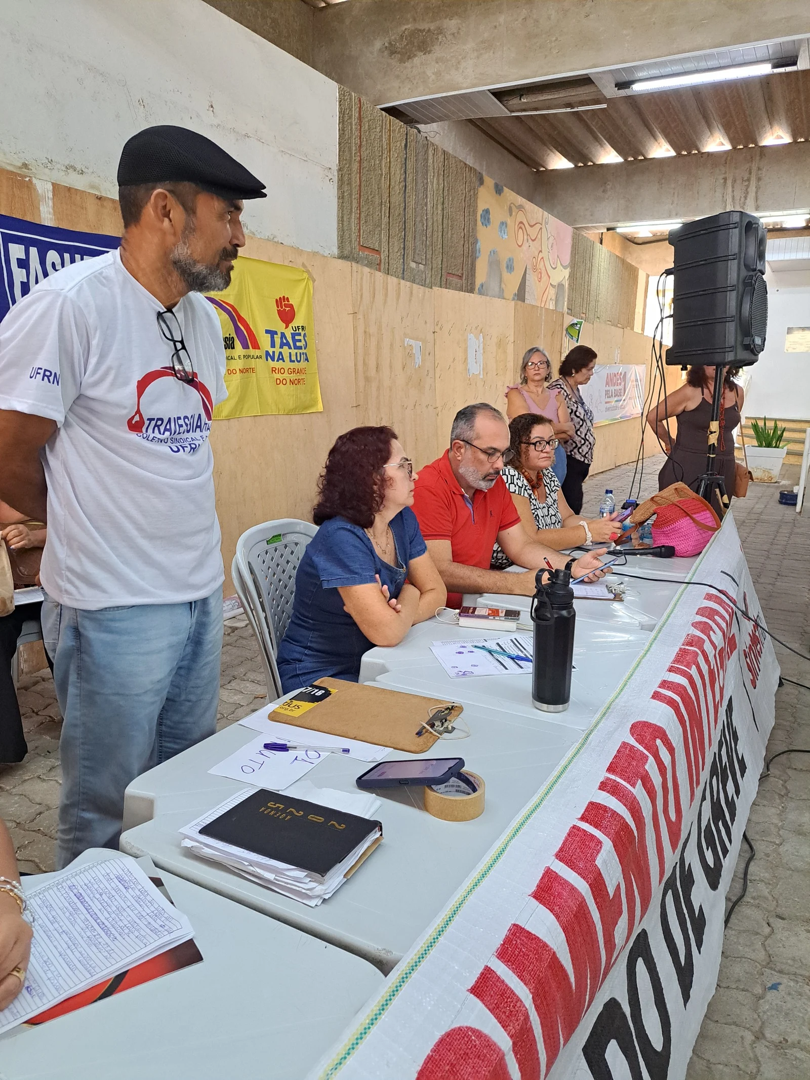 Durante os informes, foram destacados avanços como a confirmação da aceleração da progressão por capacitação pela PROGESP/UFRN e a convocação da FASUBRA para reunião do GT Nacional do PCCTAE no MGI, em 23 de maio, cuja pauta inclui a jornada de 30h, reposicionamento dos aposentados, regulamentação do plantão 12×60 e outras demandas da categoria.