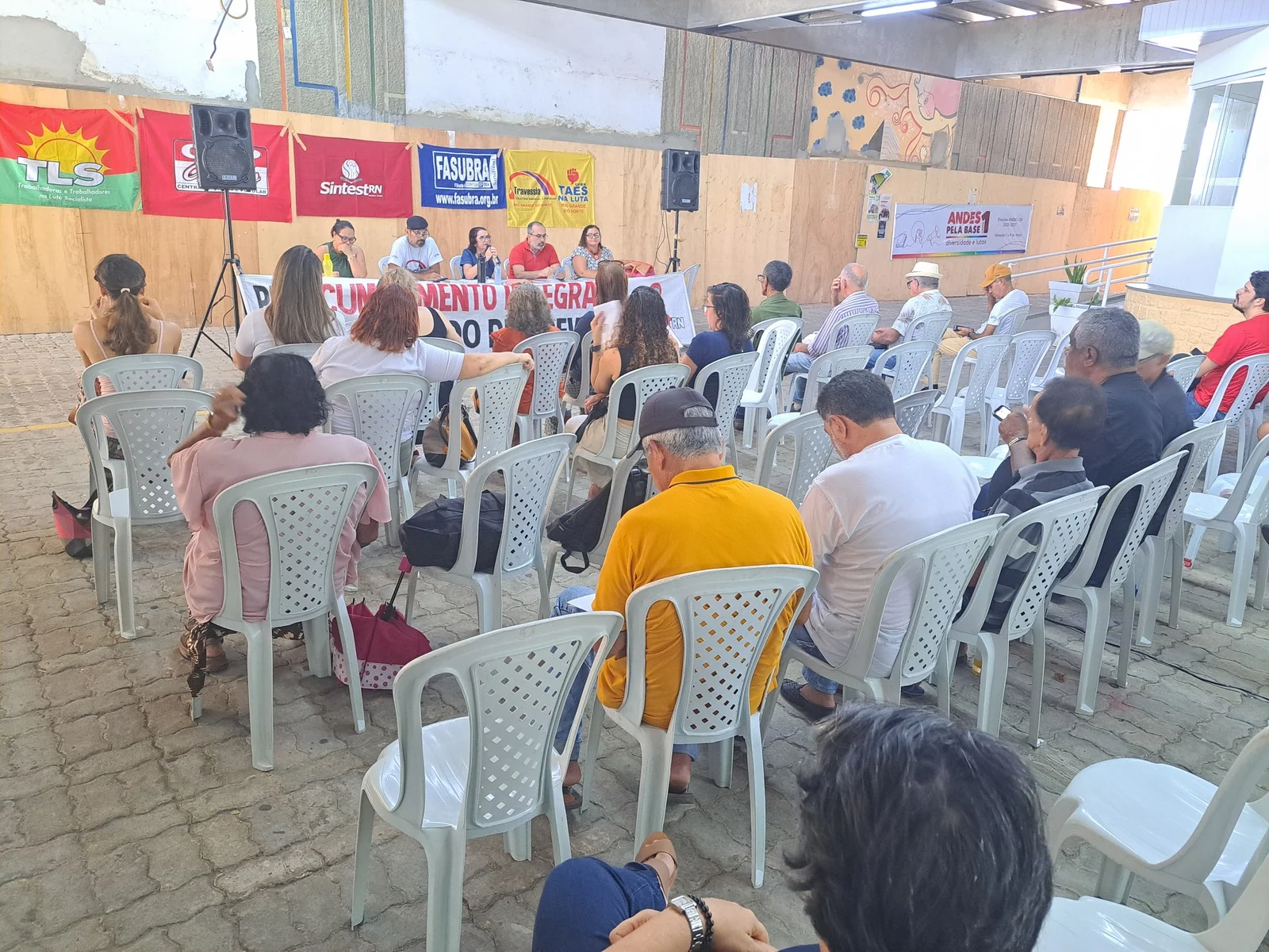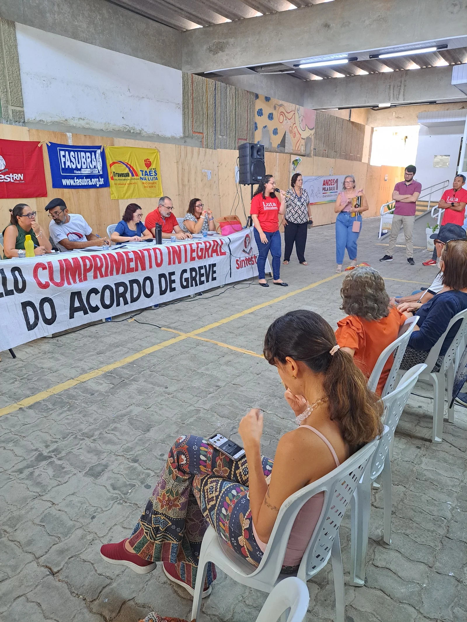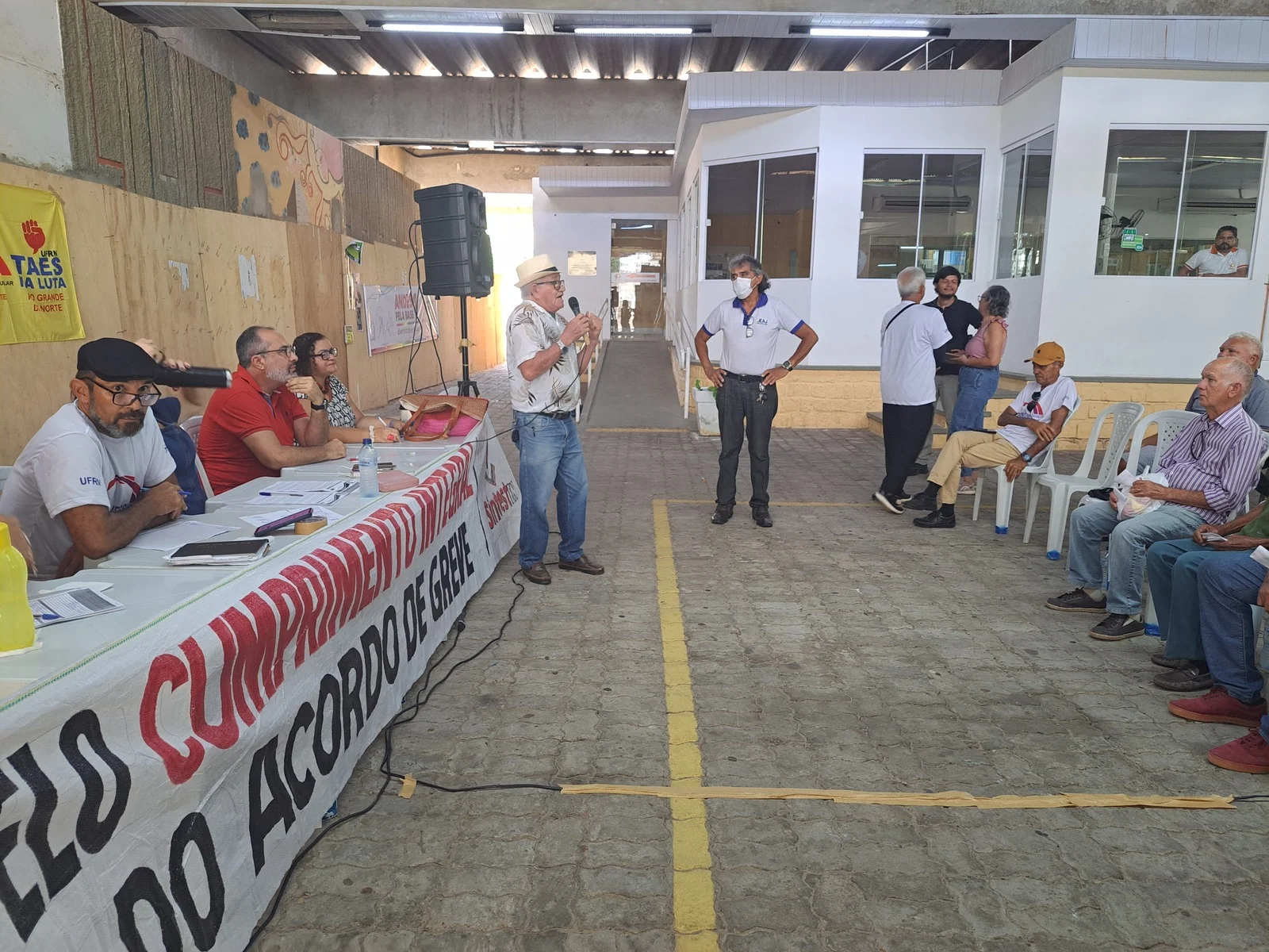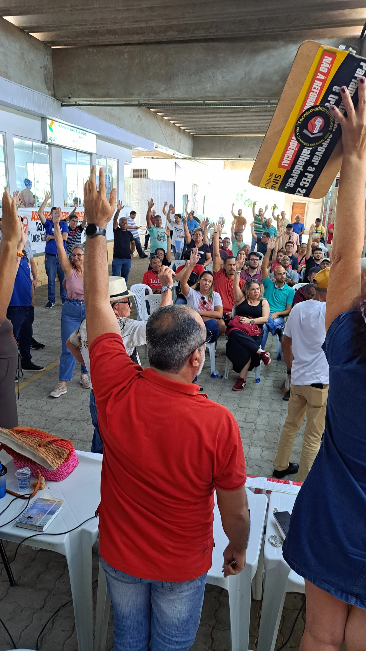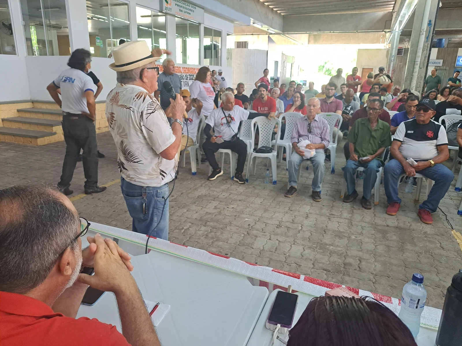Durante os informes, foram destacados avanços como a confirmação da aceleração da progressão por capacitação pela PROGESP/UFRN e a convocação da FASUBRA para reunião do GT Nacional do PCCTAE no MGI, em 23 de maio, cuja pauta inclui a jornada de 30h, reposicionamento dos aposentados, regulamentação do plantão 12×60 e outras demandas da categoria.