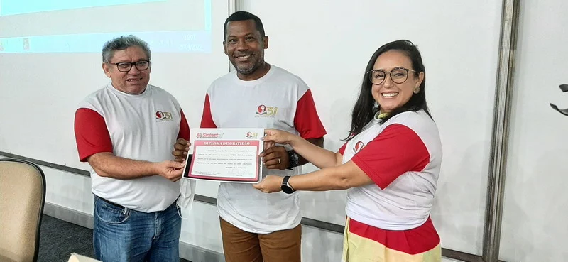 Antes de concluir a programação do evento, o Sintest/RN homenageou os servidores filiados Ieda Salviano e Francisco de Assis (Fran), que fazem parte da história da entidade, tendo participado ativamente da fundação e das lutas do sindicato nesses 31 anos. Ieda agradeceu a homenagem e convocou os presentes a se mobilizarem junto ao sindicato. Fran, que não pôde participar do evento, enviou um vídeo, que foi exibido para todos os presentes, no qual registra sua felicidade pelos 31 anos da entidade que ajudou a construir. O Sintest/RN também prestou homenagem à funcionária mais antiga da entidade, Vitória Maria dos Santos, que também não pôde comparecer ao evento e foi representada pelo também funcionário da entidade, Jaildo Dantas.