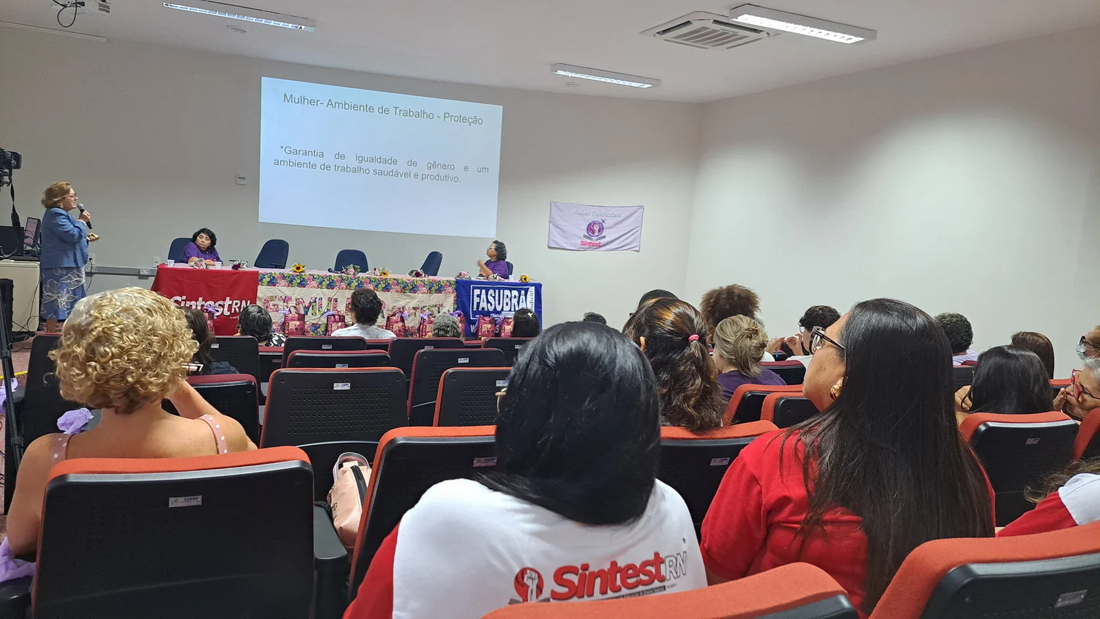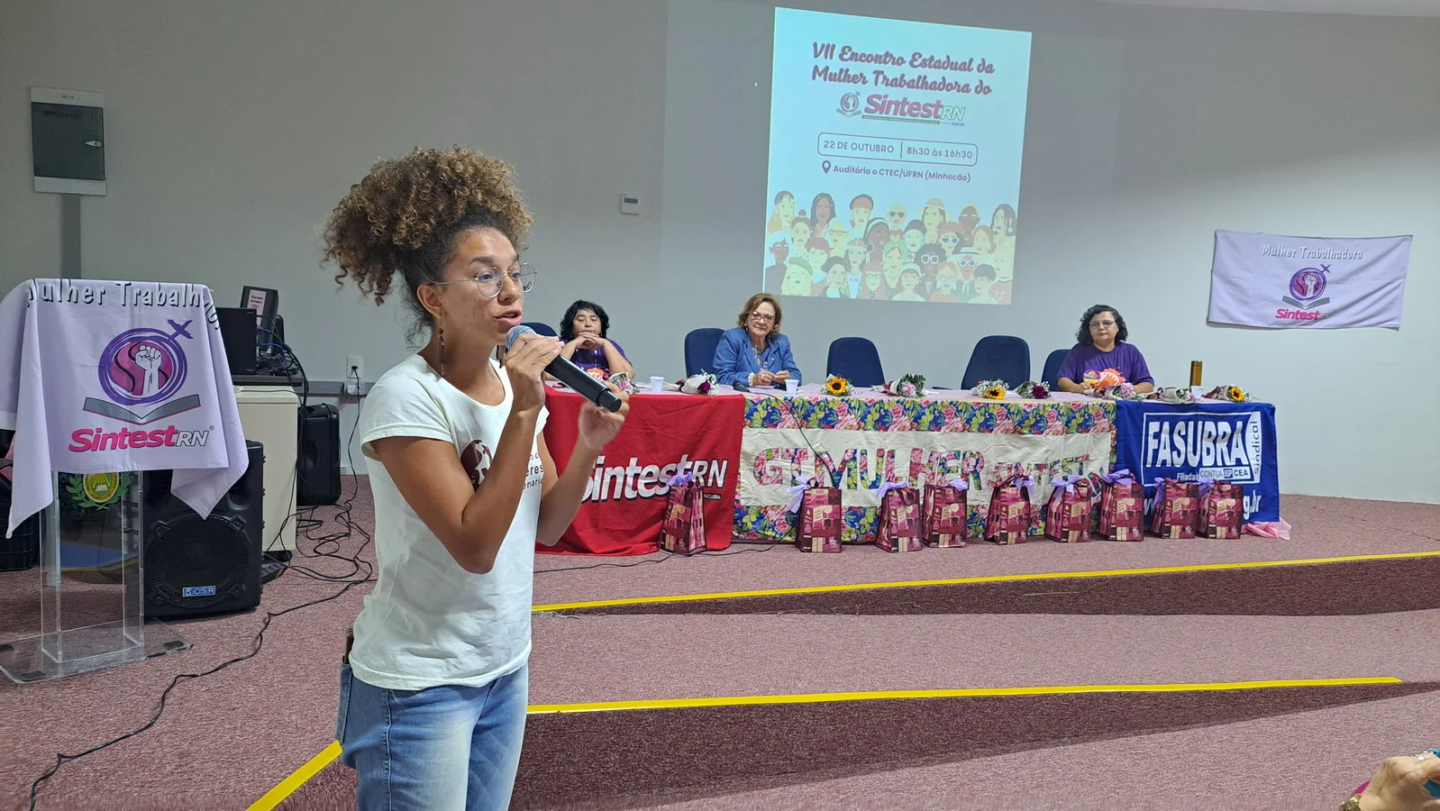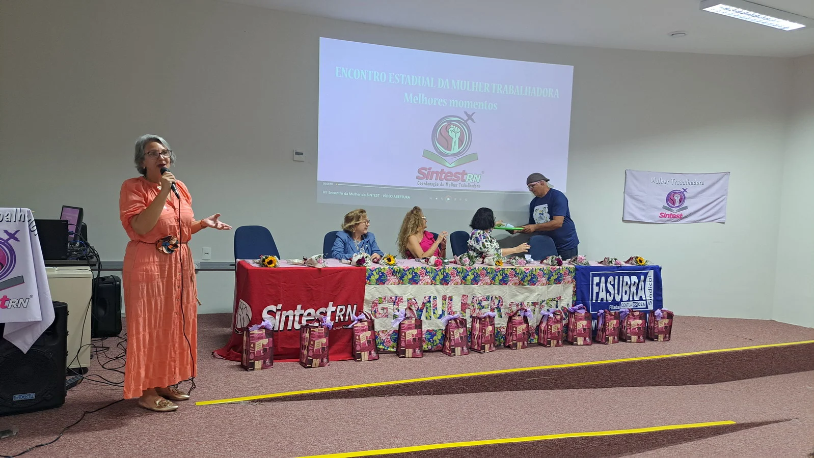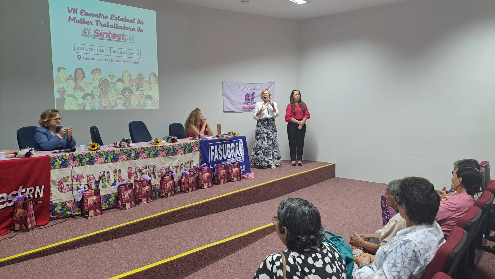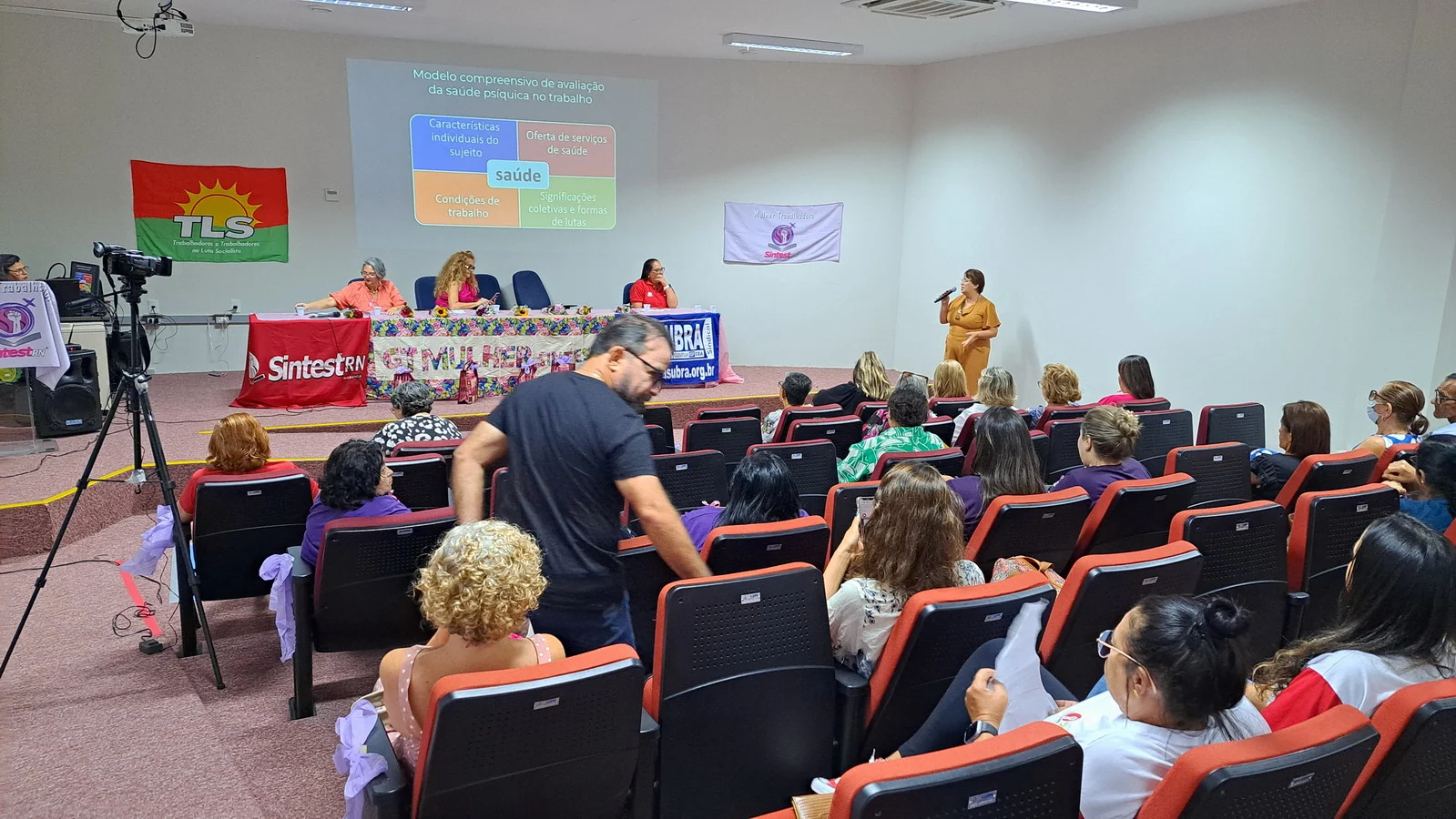 Após o almoço, a programação seguiu durante a tarde com palestras da psicóloga Maria Teresa Pires Costa (Docente da área de Gestão de Pessoas do Departamento de Administração Pública. Psicóloga, Mestre em Administração, Doutora em Psicologia com Pós-Doc em Psicologia da Saúde. Estuda a Saúde Mental no Trabalho e as Condições de Trabalho) que falou sobre “Saúde mental e adoecimento das mulheres nos espaços de trabalho”. Em seguida, Tházia Maria de Almeida Maia, Coordenadora da Mulher Trabalhadora do SINTEST-RN realizou uma Roda de conversa, dinâmicas em grupo e sorteio de brindes.