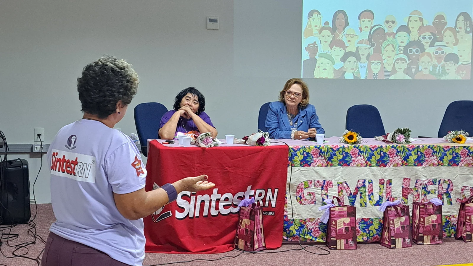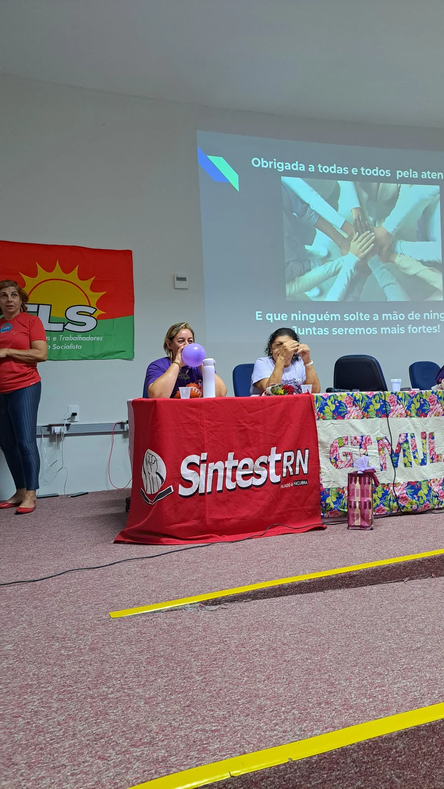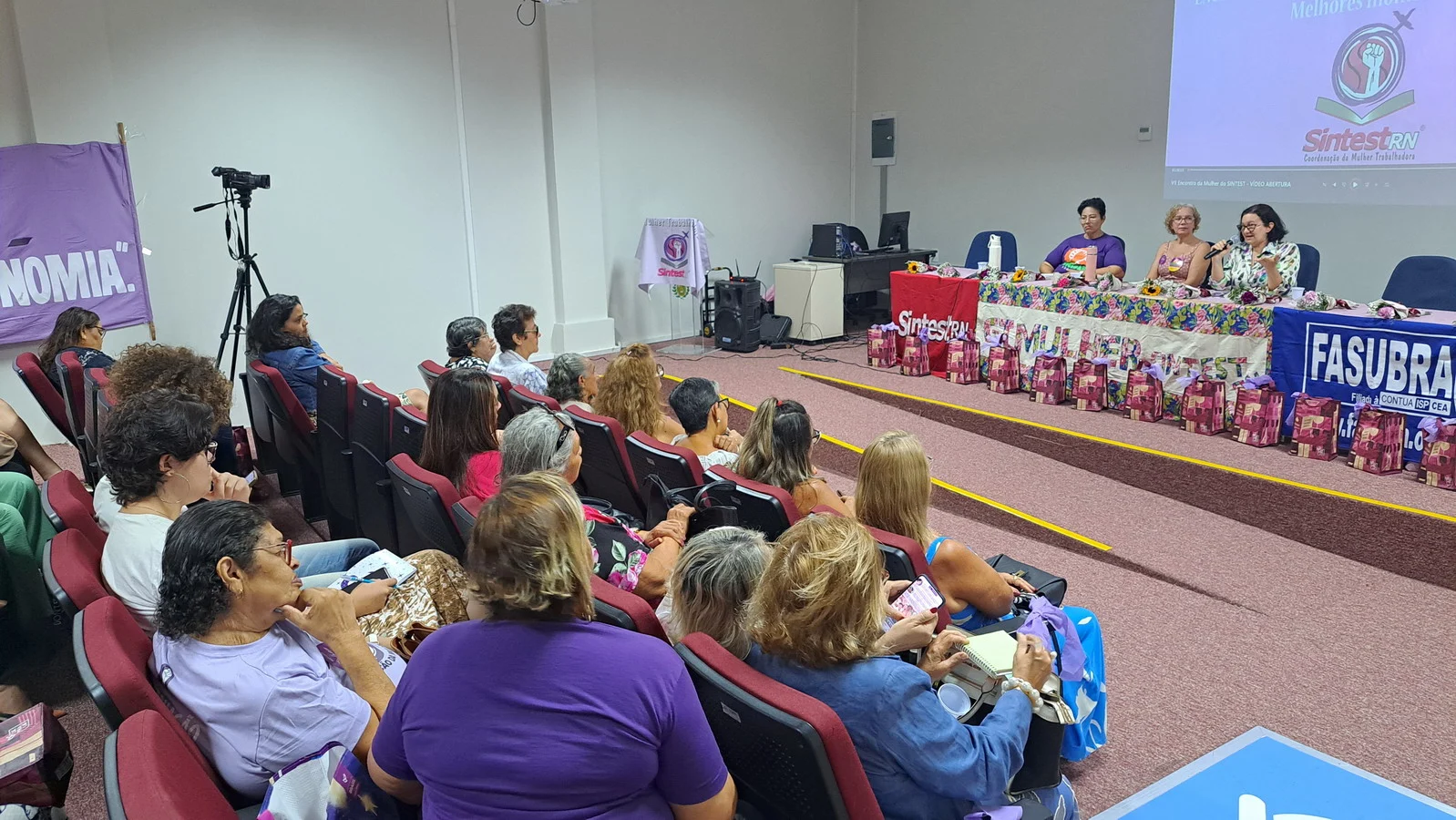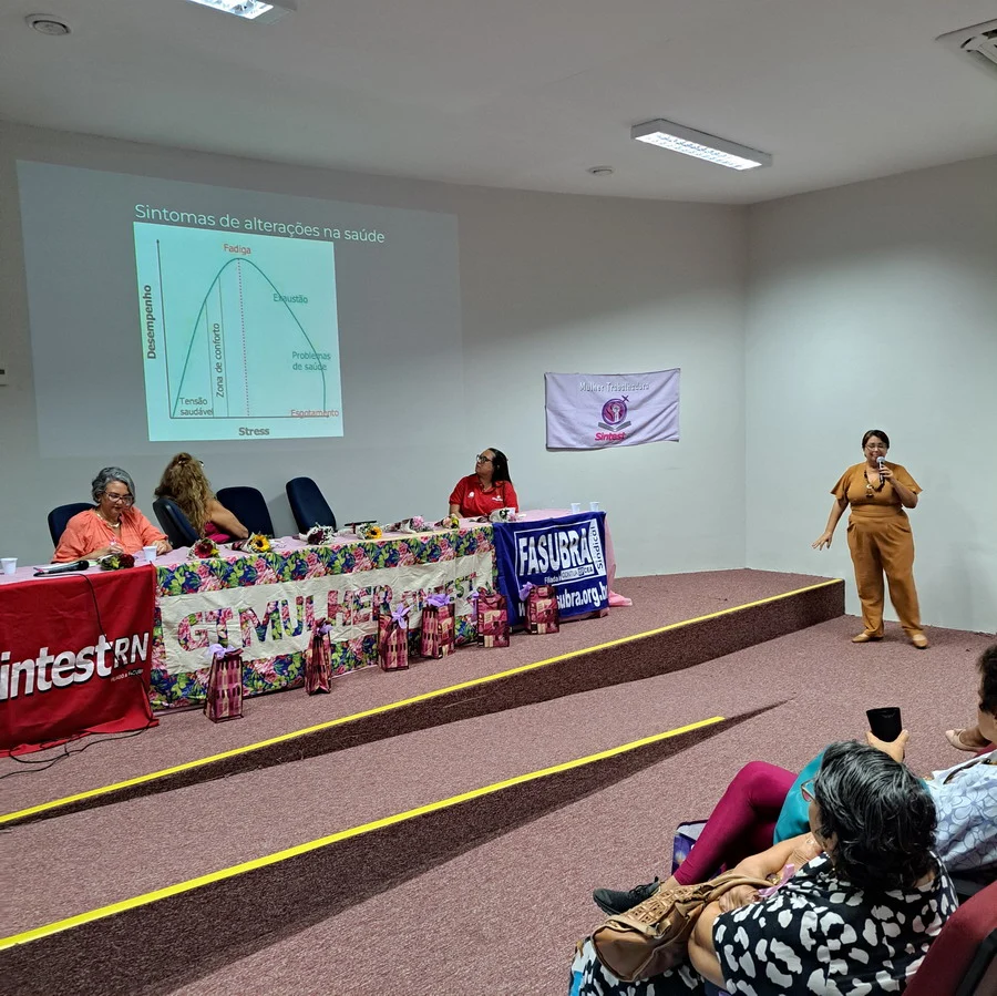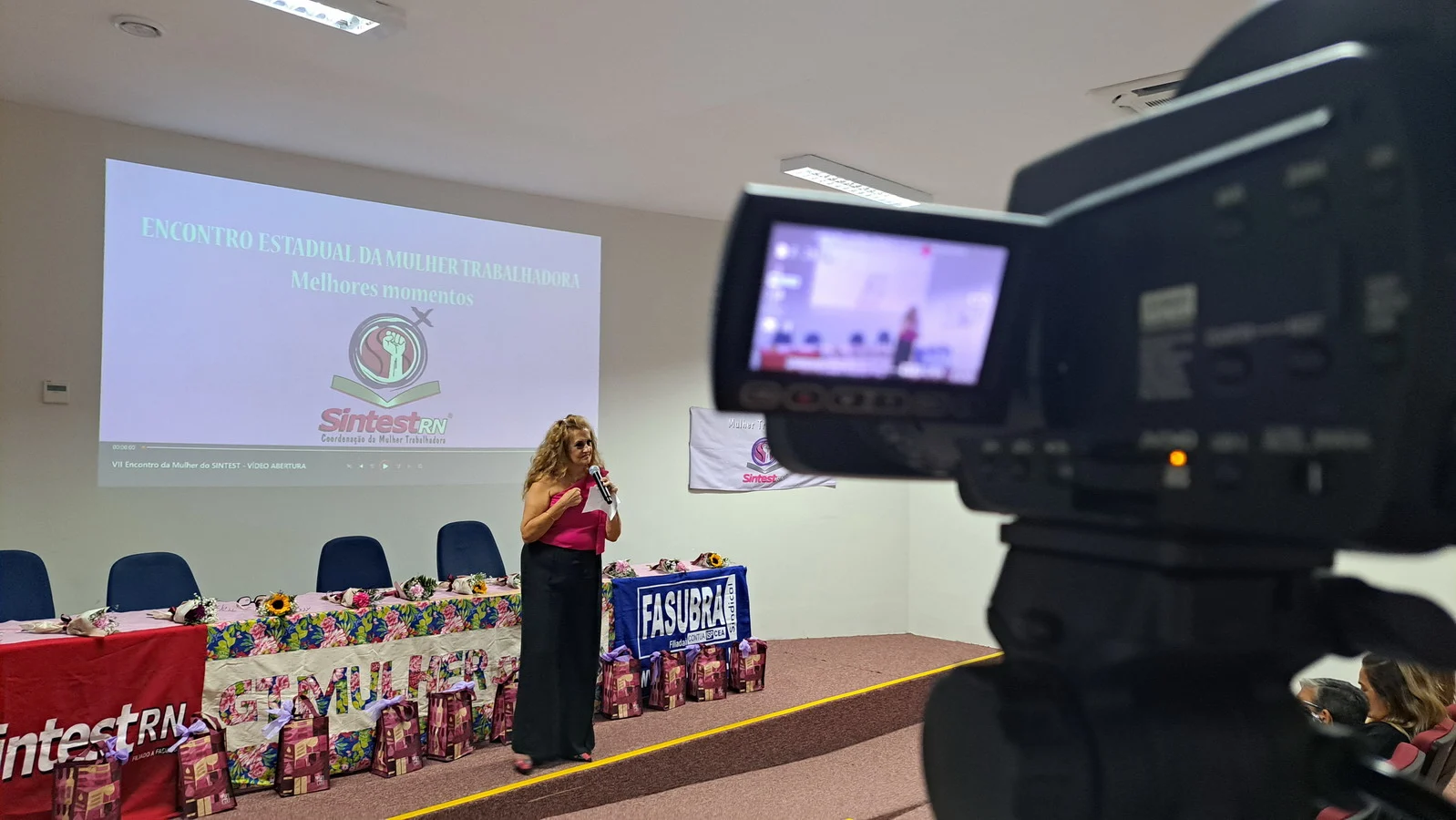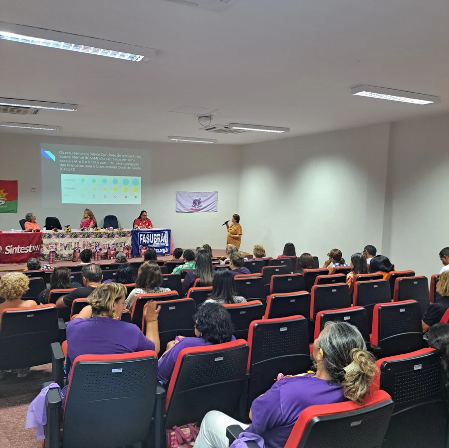 Após o almoço, a programação seguiu durante a tarde com palestras da psicóloga Maria Teresa Pires Costa (Docente da área de Gestão de Pessoas do Departamento de Administração Pública. Psicóloga, Mestre em Administração, Doutora em Psicologia com Pós-Doc em Psicologia da Saúde. Estuda a Saúde Mental no Trabalho e as Condições de Trabalho) que falou sobre “Saúde mental e adoecimento das mulheres nos espaços de trabalho”. Em seguida, Tházia Maria de Almeida Maia, Coordenadora da Mulher Trabalhadora do SINTEST-RN realizou uma Roda de conversa, dinâmicas em grupo e sorteio de brindes.
