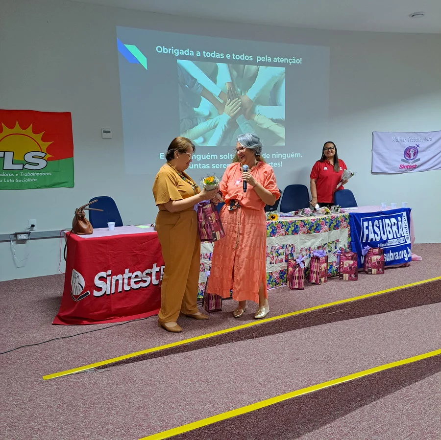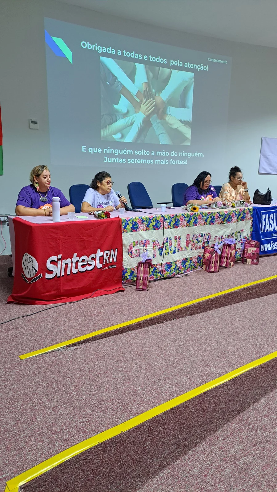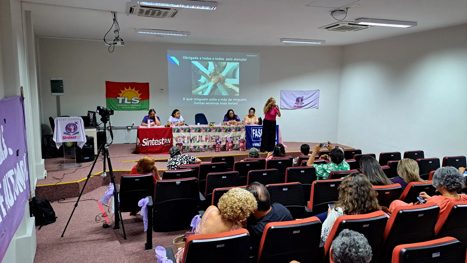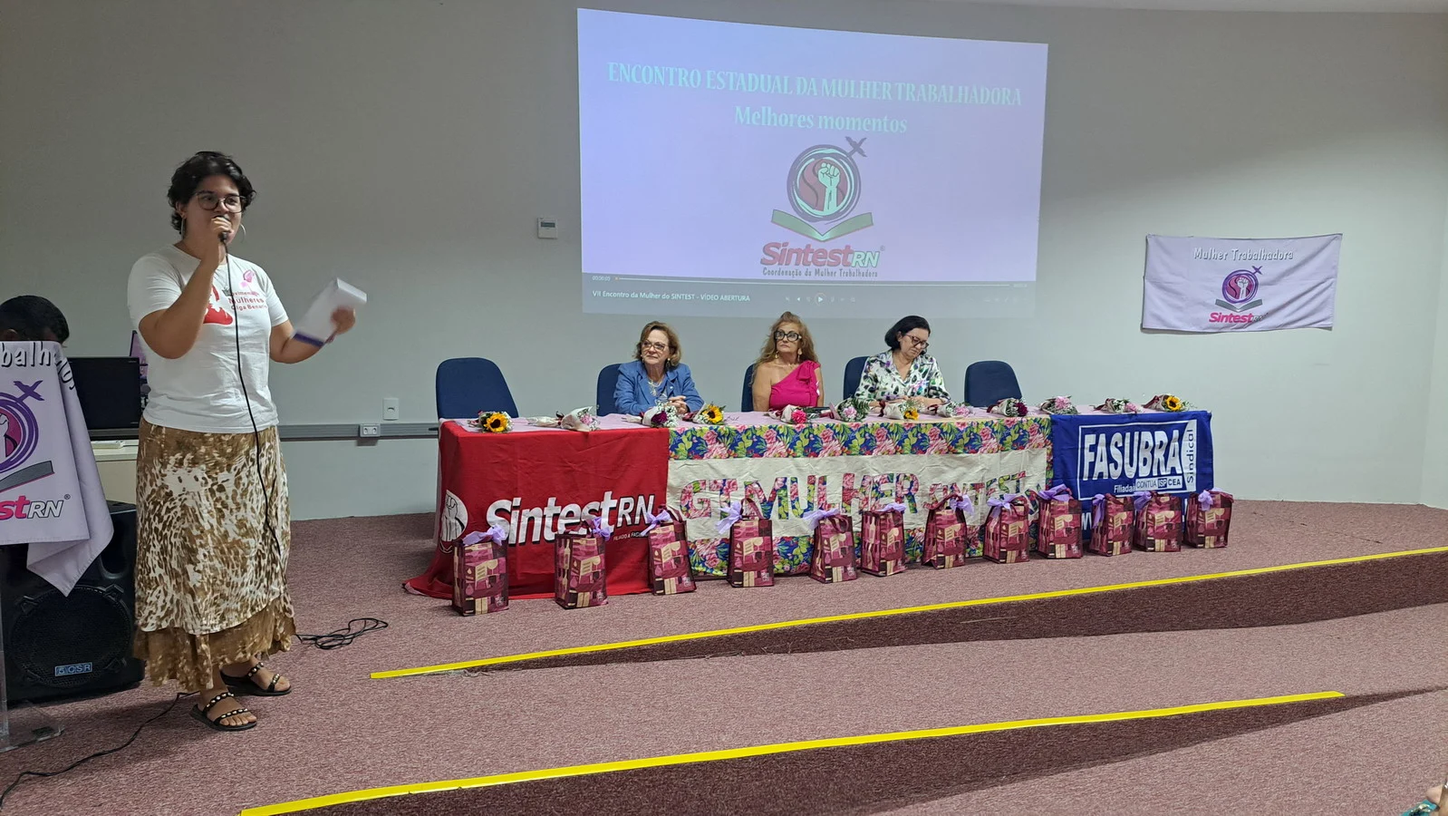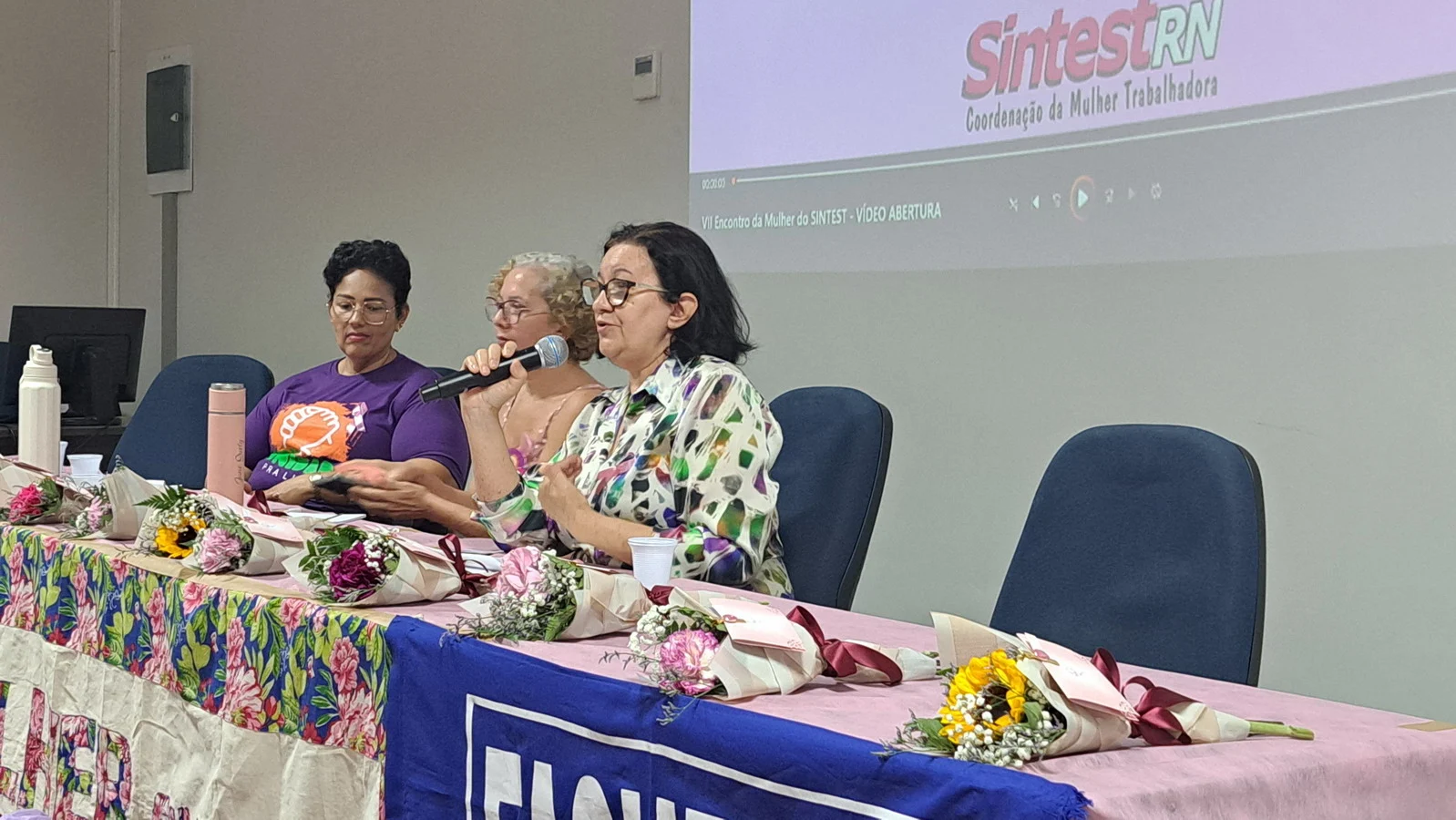 Após o almoço, a programação seguiu durante a tarde com palestras da psicóloga Maria Teresa Pires Costa (Docente da área de Gestão de Pessoas do Departamento de Administração Pública. Psicóloga, Mestre em Administração, Doutora em Psicologia com Pós-Doc em Psicologia da Saúde. Estuda a Saúde Mental no Trabalho e as Condições de Trabalho) que falou sobre “Saúde mental e adoecimento das mulheres nos espaços de trabalho”. Em seguida, Tházia Maria de Almeida Maia, Coordenadora da Mulher Trabalhadora do SINTEST-RN realizou uma Roda de conversa, dinâmicas em grupo e sorteio de brindes.