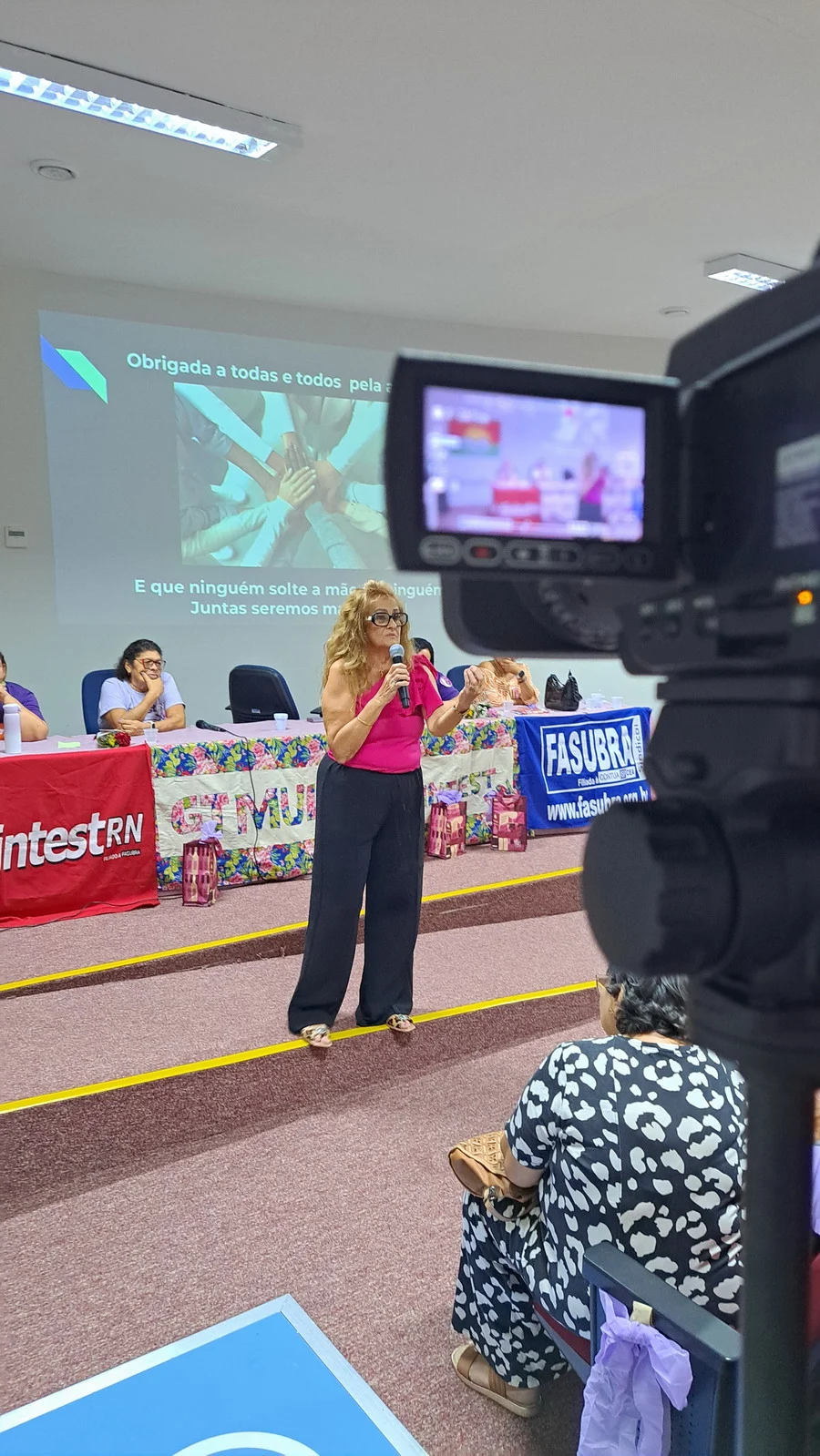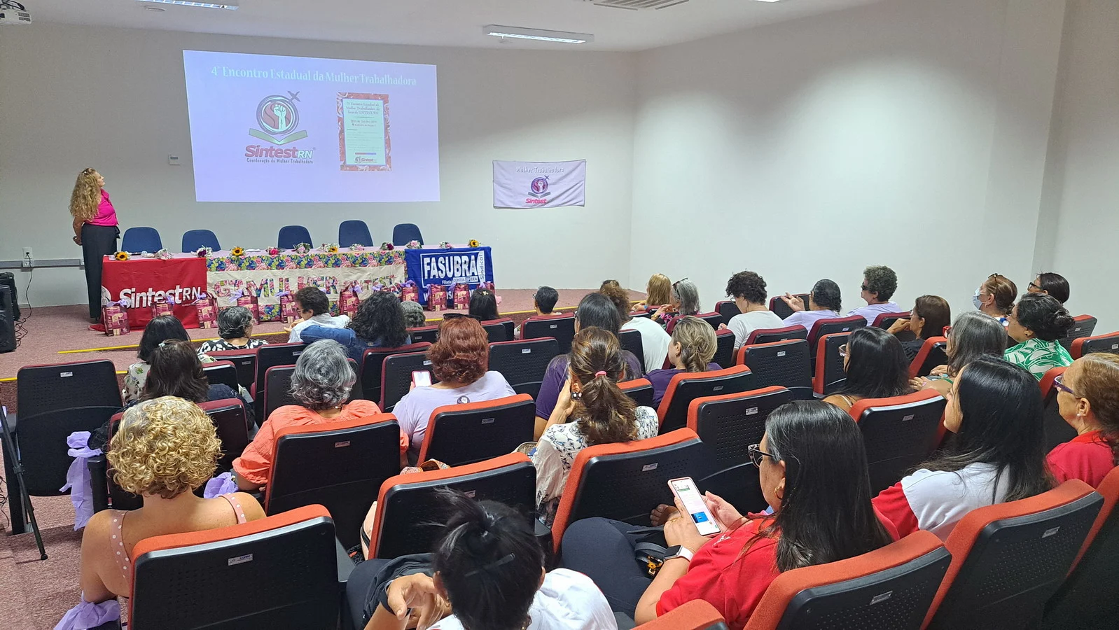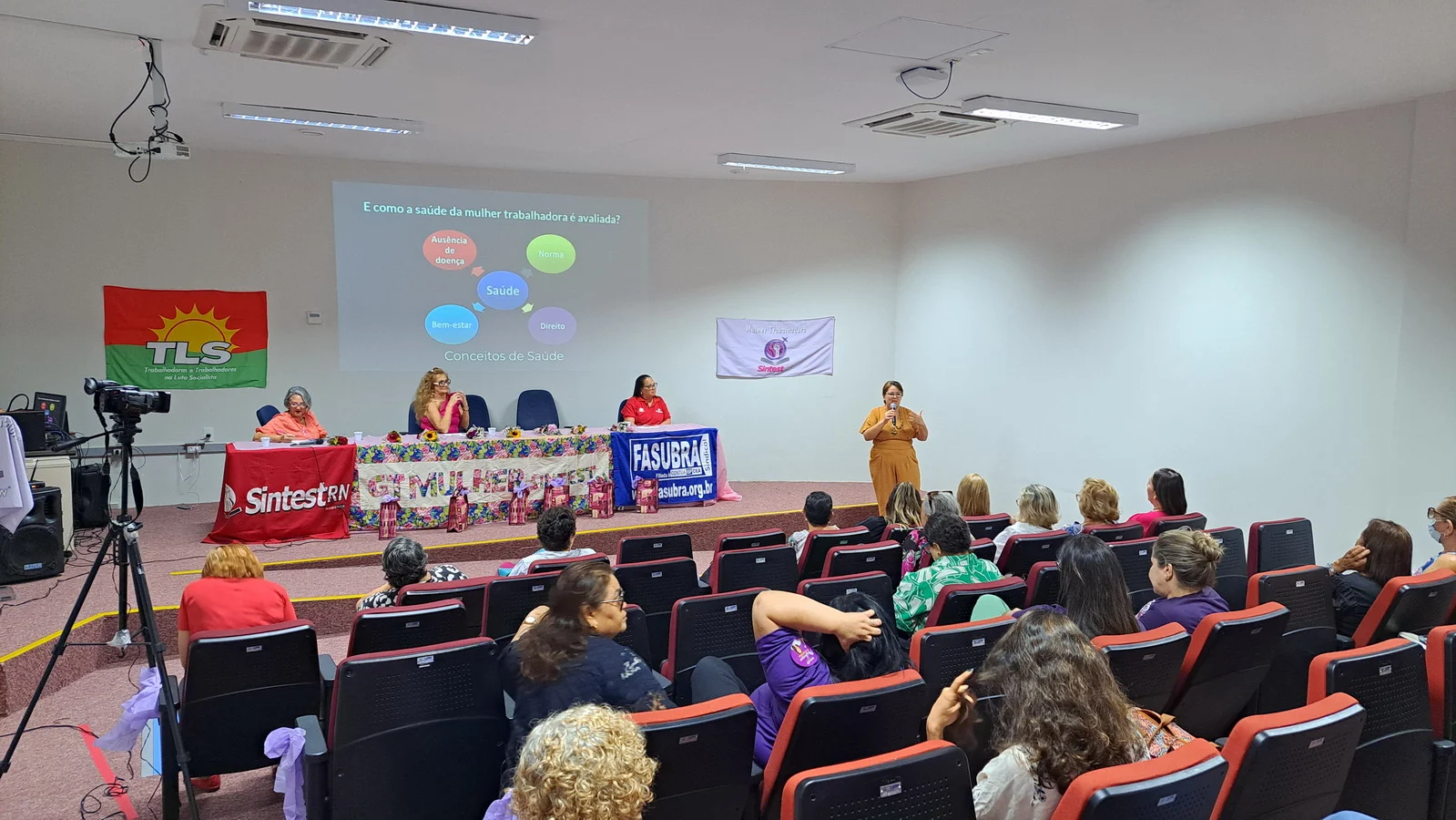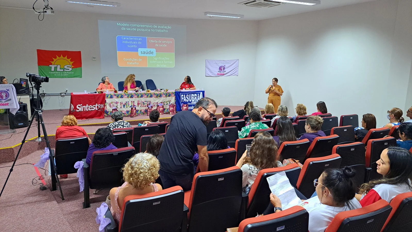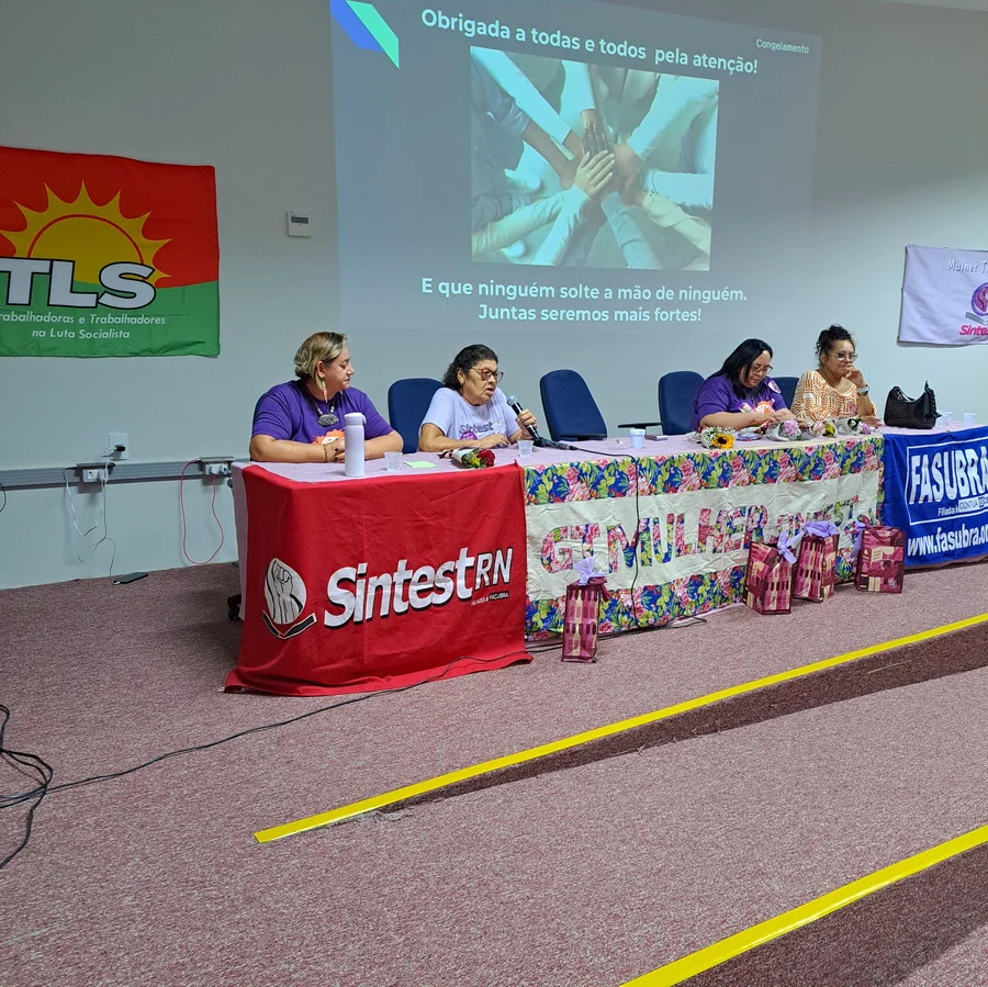 Após o almoço, a programação seguiu durante a tarde com palestras da psicóloga Maria Teresa Pires Costa (Docente da área de Gestão de Pessoas do Departamento de Administração Pública. Psicóloga, Mestre em Administração, Doutora em Psicologia com Pós-Doc em Psicologia da Saúde. Estuda a Saúde Mental no Trabalho e as Condições de Trabalho) que falou sobre “Saúde mental e adoecimento das mulheres nos espaços de trabalho”. Em seguida, Tházia Maria de Almeida Maia, Coordenadora da Mulher Trabalhadora do SINTEST-RN realizou uma Roda de conversa, dinâmicas em grupo e sorteio de brindes.