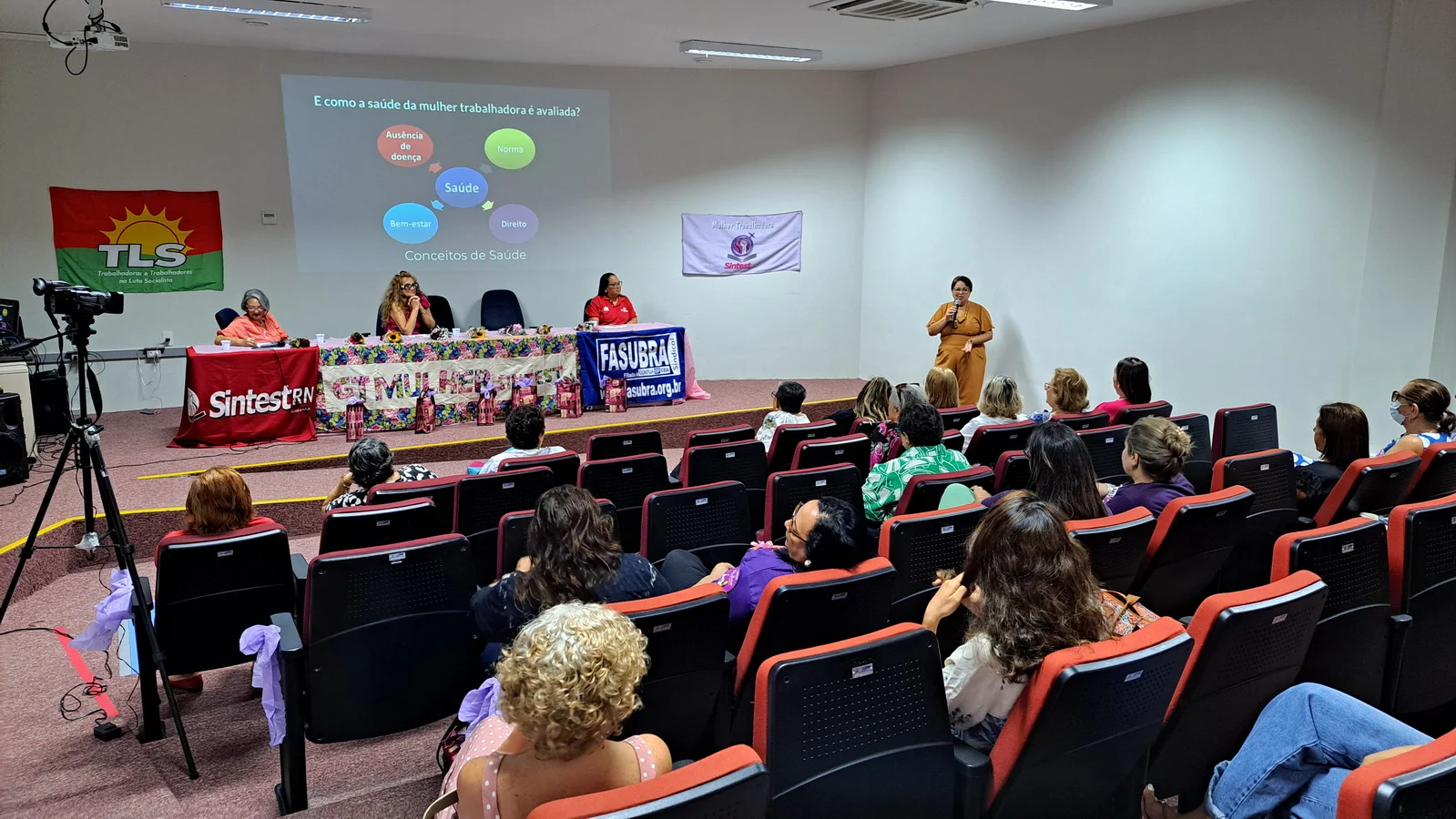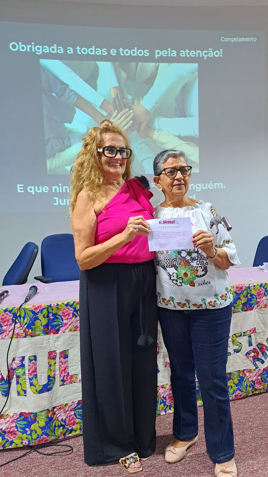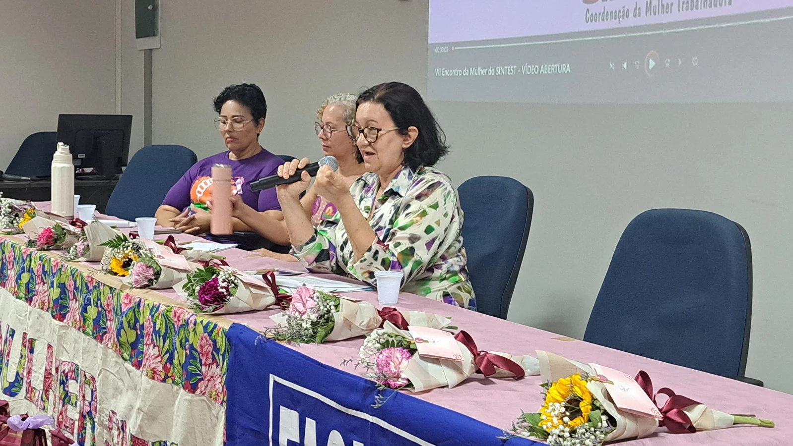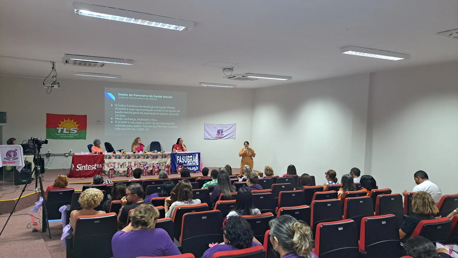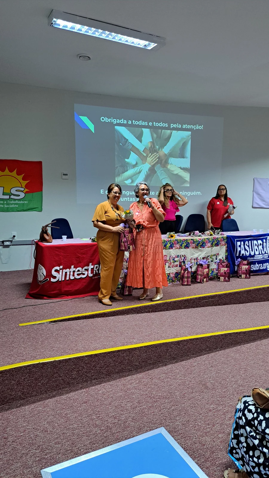 Após o almoço, a programação seguiu durante a tarde com palestras da psicóloga Maria Teresa Pires Costa (Docente da área de Gestão de Pessoas do Departamento de Administração Pública. Psicóloga, Mestre em Administração, Doutora em Psicologia com Pós-Doc em Psicologia da Saúde. Estuda a Saúde Mental no Trabalho e as Condições de Trabalho) que falou sobre “Saúde mental e adoecimento das mulheres nos espaços de trabalho”. Em seguida, Tházia Maria de Almeida Maia, Coordenadora da Mulher Trabalhadora do SINTEST-RN realizou uma Roda de conversa, dinâmicas em grupo e sorteio de brindes.