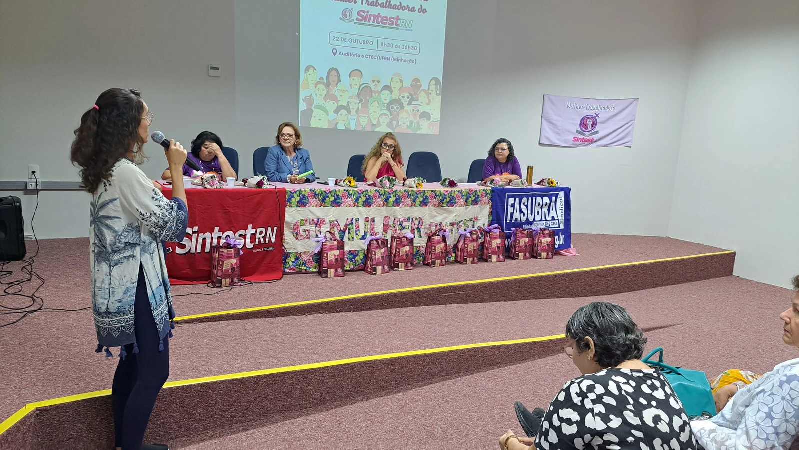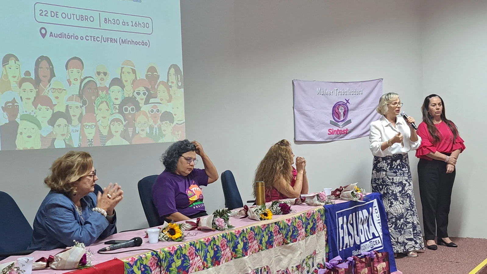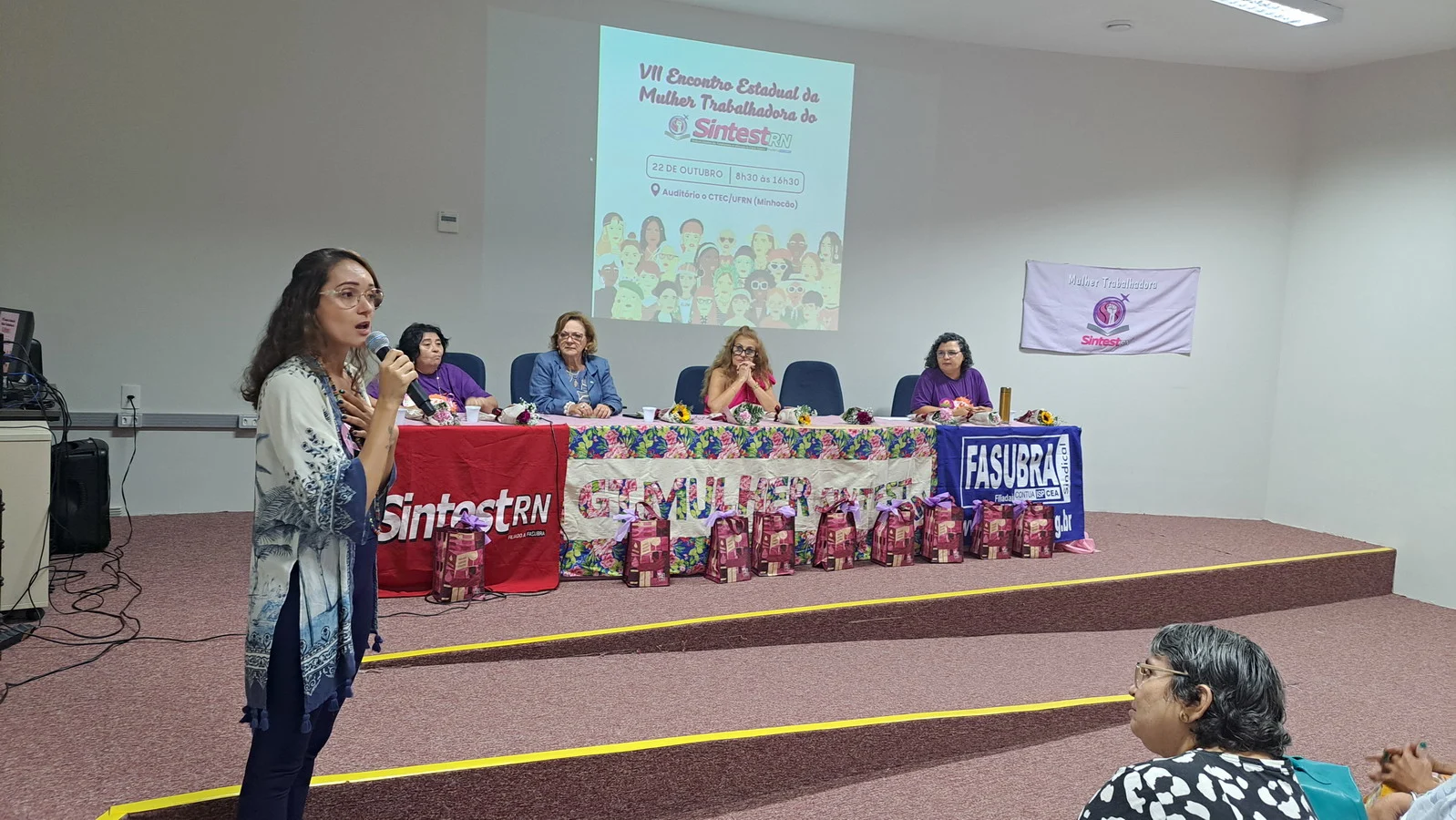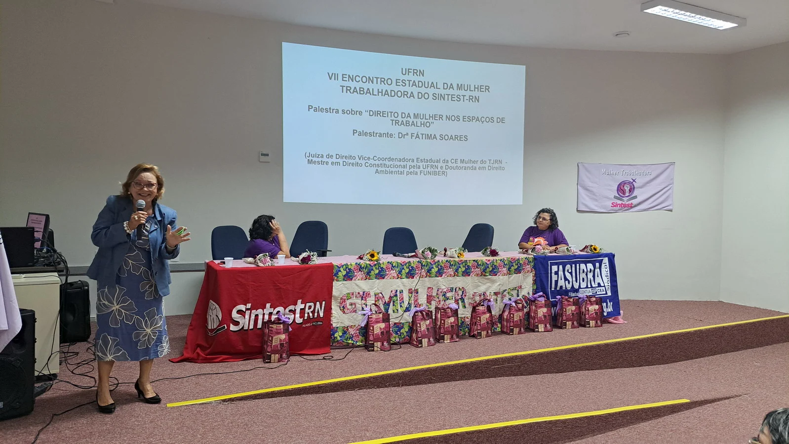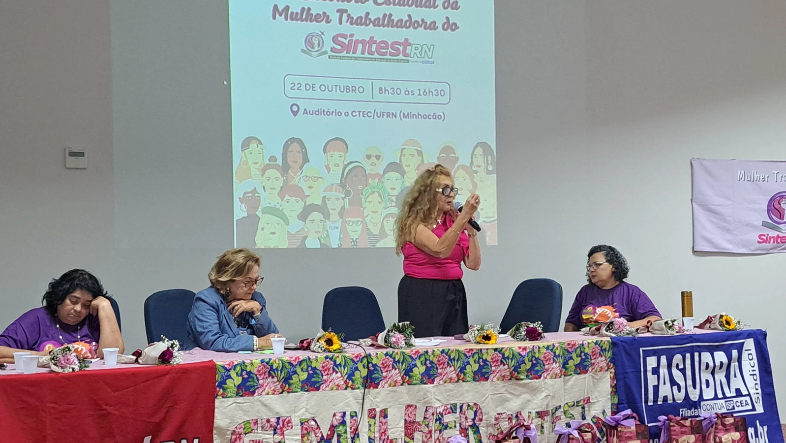 A 7ª edição do Encontro Estadual da Mulher Trabalhadora do SINTEST-RN aconteceu no dia 22 de outubro, no auditório do CTEC/UFRN, e reuniu servidoras da UFRN, as funcionárias do SINTEST-RN e representantes de coletivos e movimentos sociais. A atividade se iniciou com um café de boas vindas, por volta das 8h30 e em seguida aconteceu a palestra de Mirian Dantas dos Santos, Pró-Reitora de Gestão de Pessoas da UFRN e Coordenadora Nacional do Fórum Nacional de Pró-Reitores de Gestão de Pessoas das IFES (FORGEPE). Mirian falou sobre a ocupação de mulheres em espaços de poder e sobre sua experiência à frente da PROGESP/UFRN e do FORGEPE.