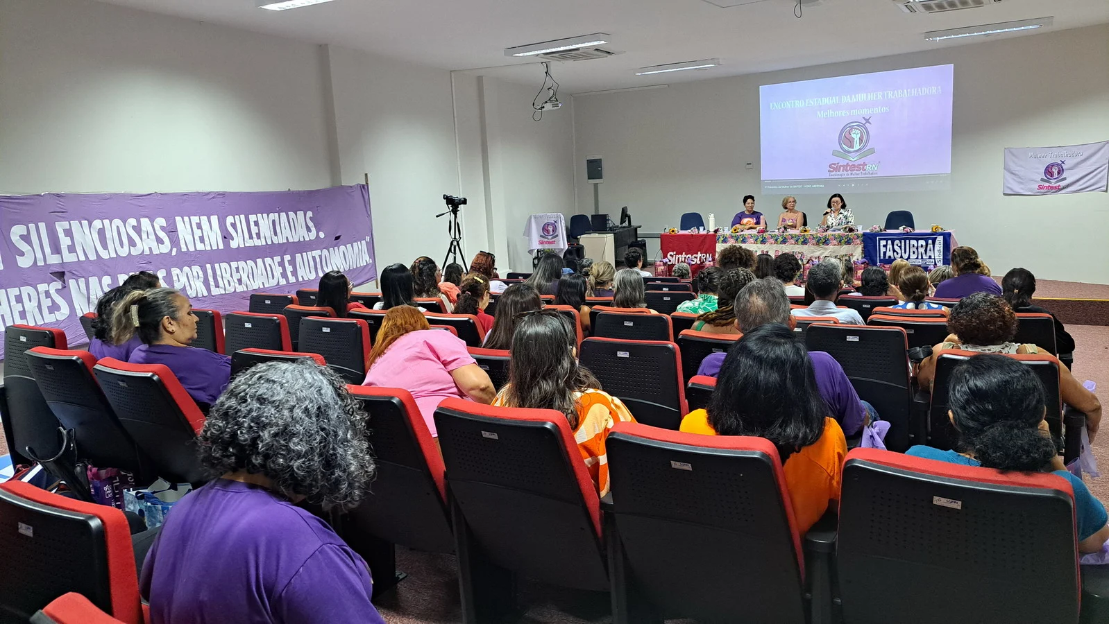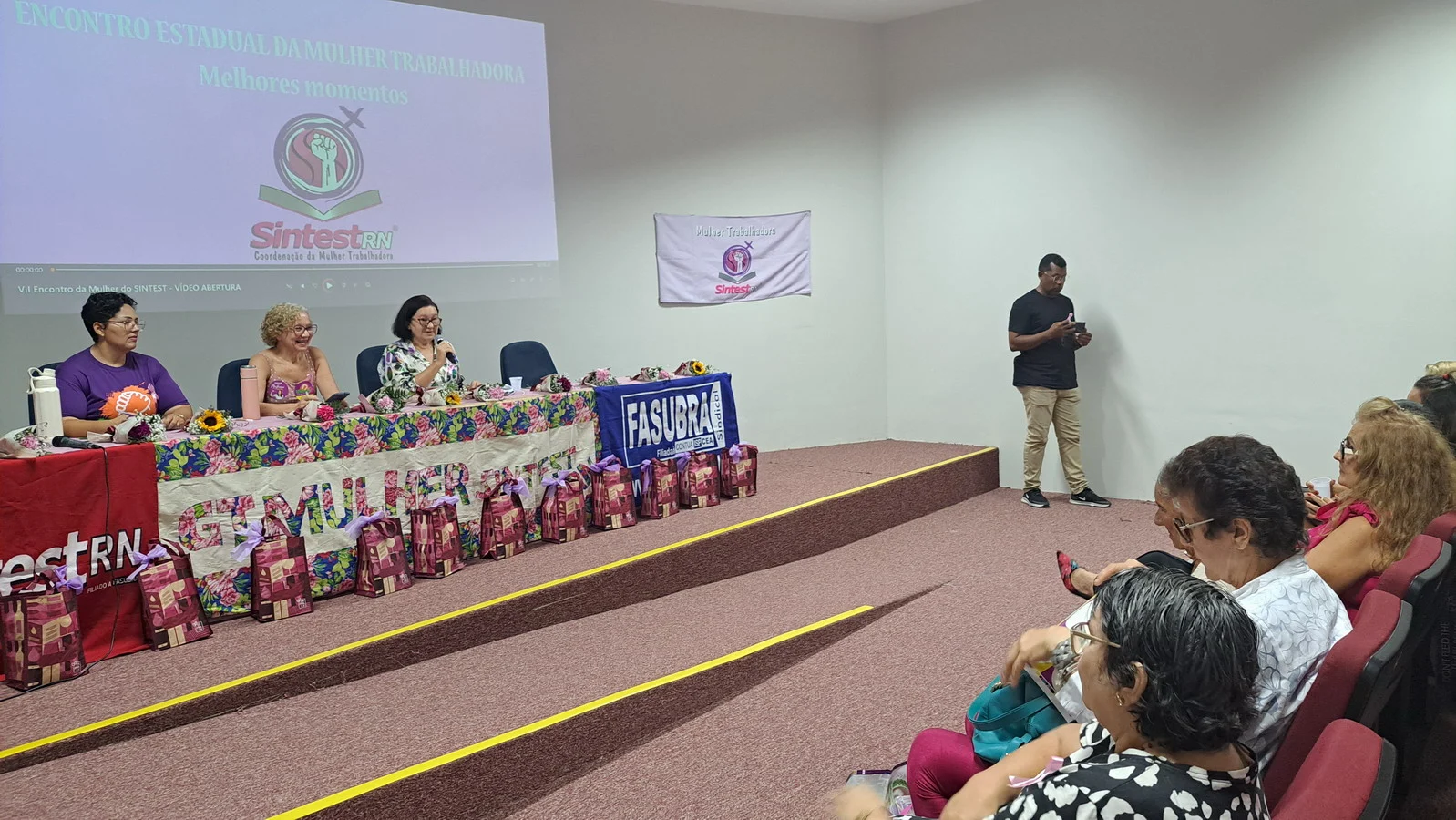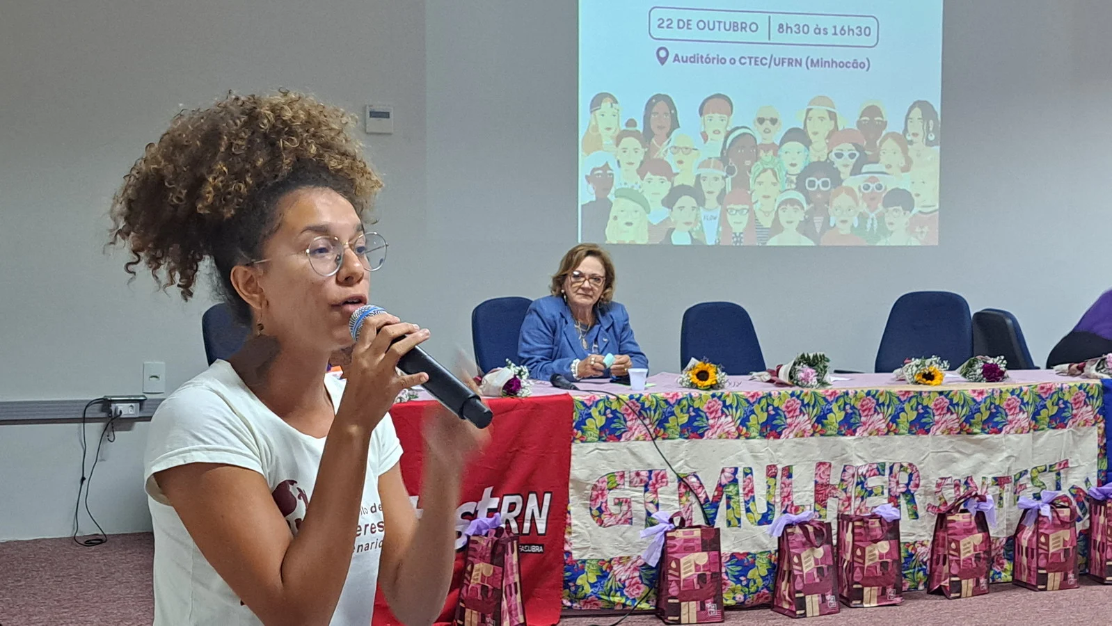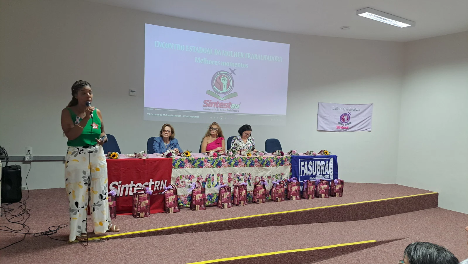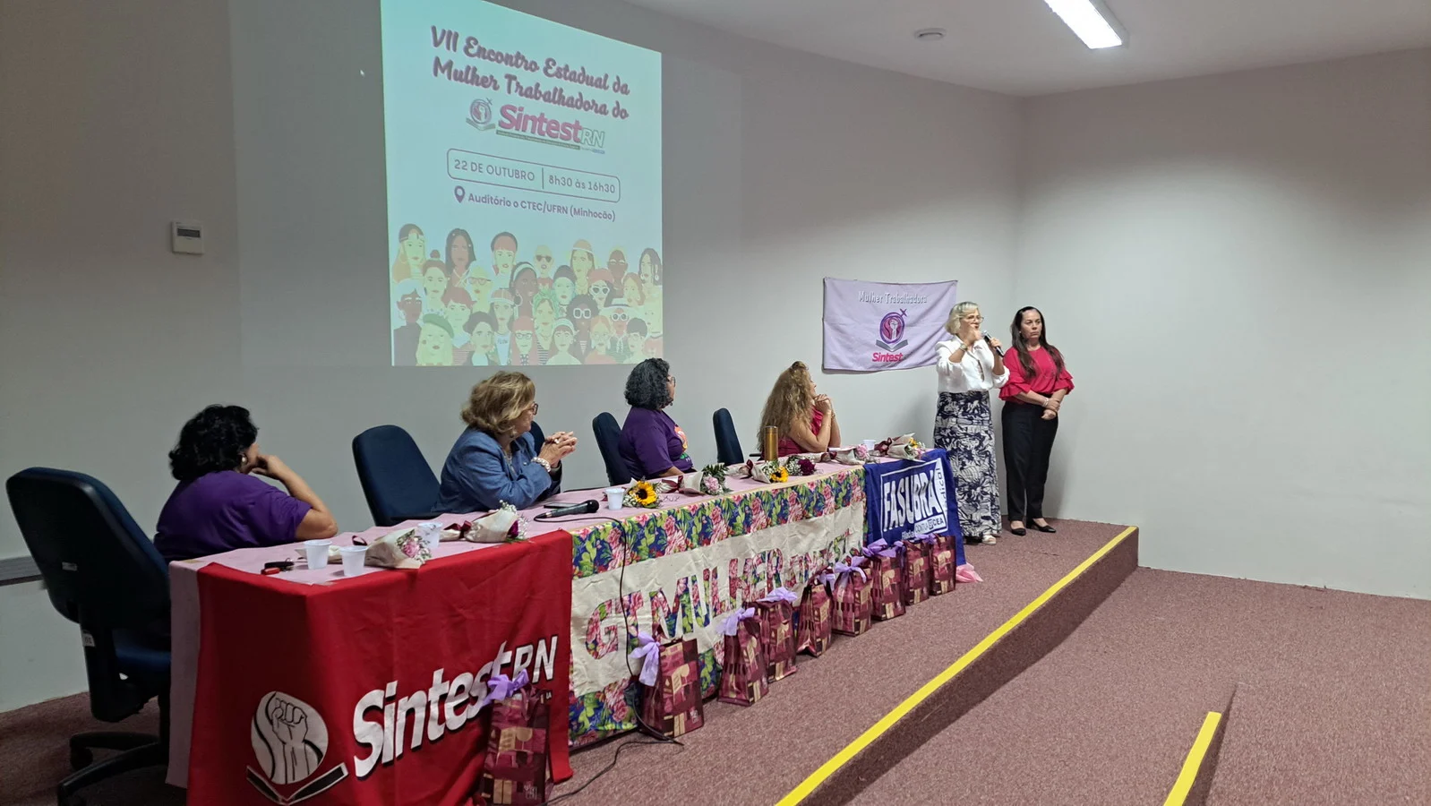 A 7ª edição do Encontro Estadual da Mulher Trabalhadora do SINTEST-RN aconteceu no dia 22 de outubro, no auditório do CTEC/UFRN, e reuniu servidoras da UFRN, as funcionárias do SINTEST-RN e representantes de coletivos e movimentos sociais. A atividade se iniciou com um café de boas vindas, por volta das 8h30 e em seguida aconteceu a palestra de Mirian Dantas dos Santos, Pró-Reitora de Gestão de Pessoas da UFRN e Coordenadora Nacional do Fórum Nacional de Pró-Reitores de Gestão de Pessoas das IFES (FORGEPE). Mirian falou sobre a ocupação de mulheres em espaços de poder e sobre sua experiência à frente da PROGESP/UFRN e do FORGEPE.